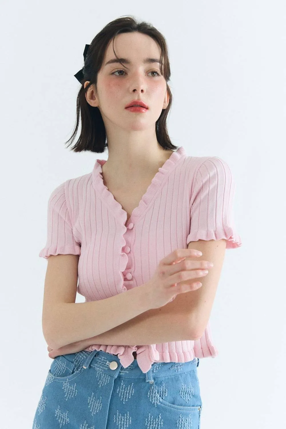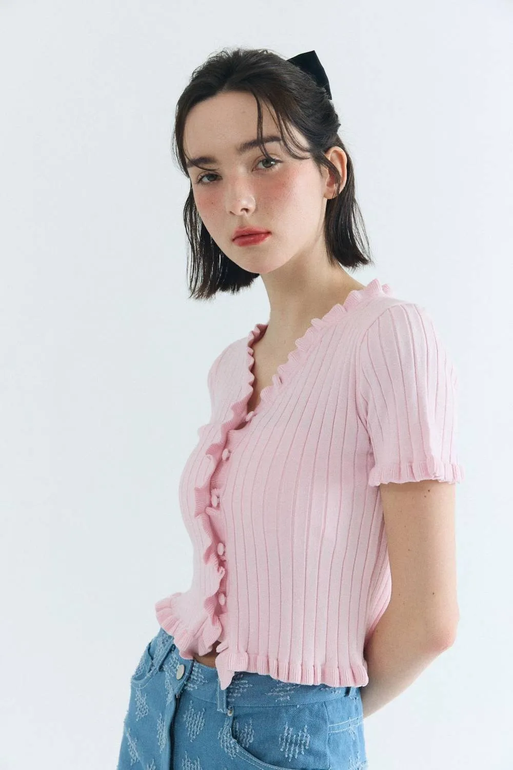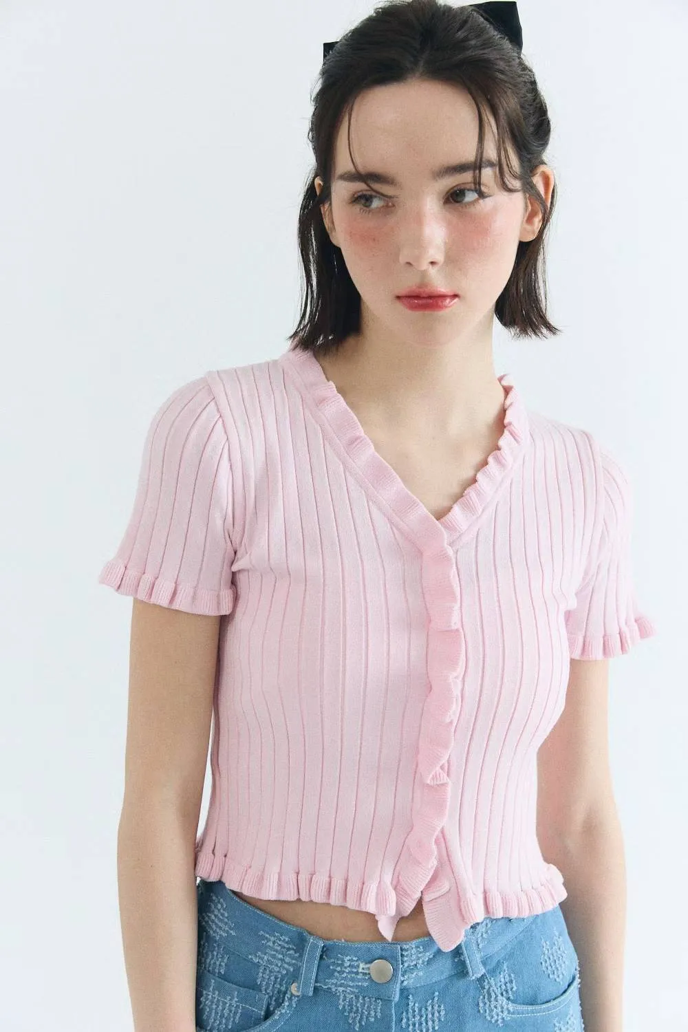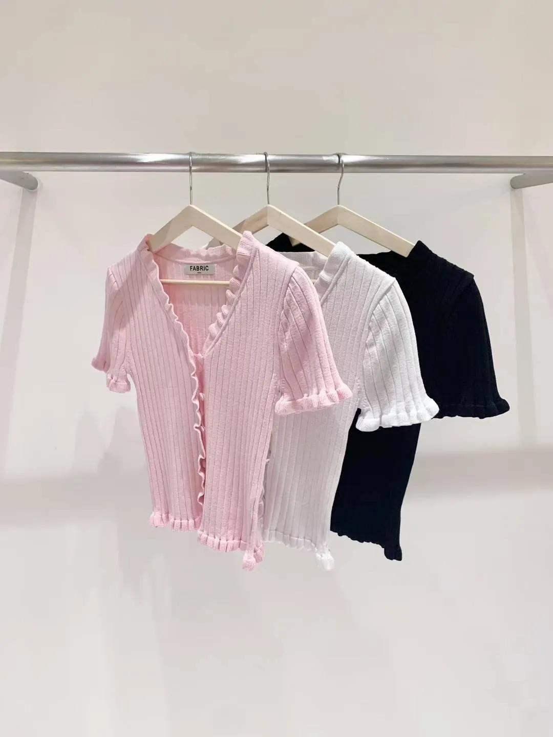 ✤針織捲邊鈕扣上衣▸粉▸白▸黑