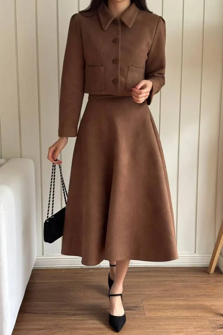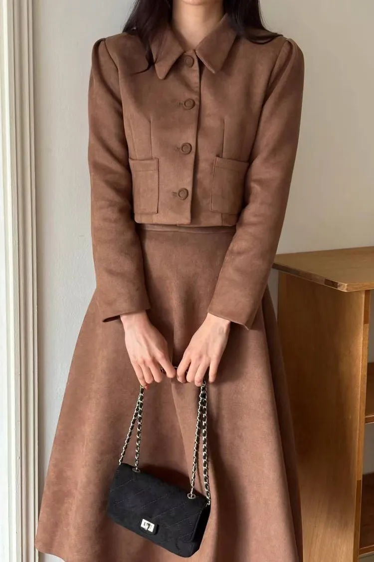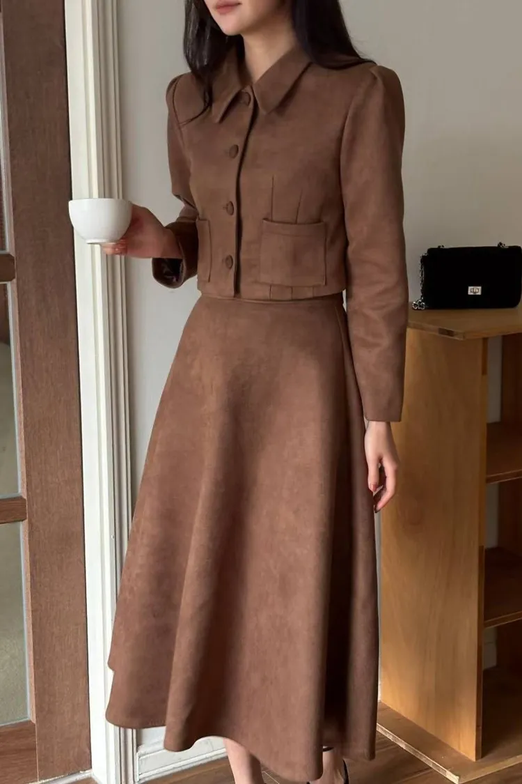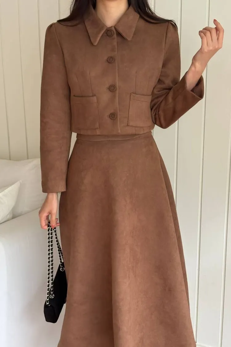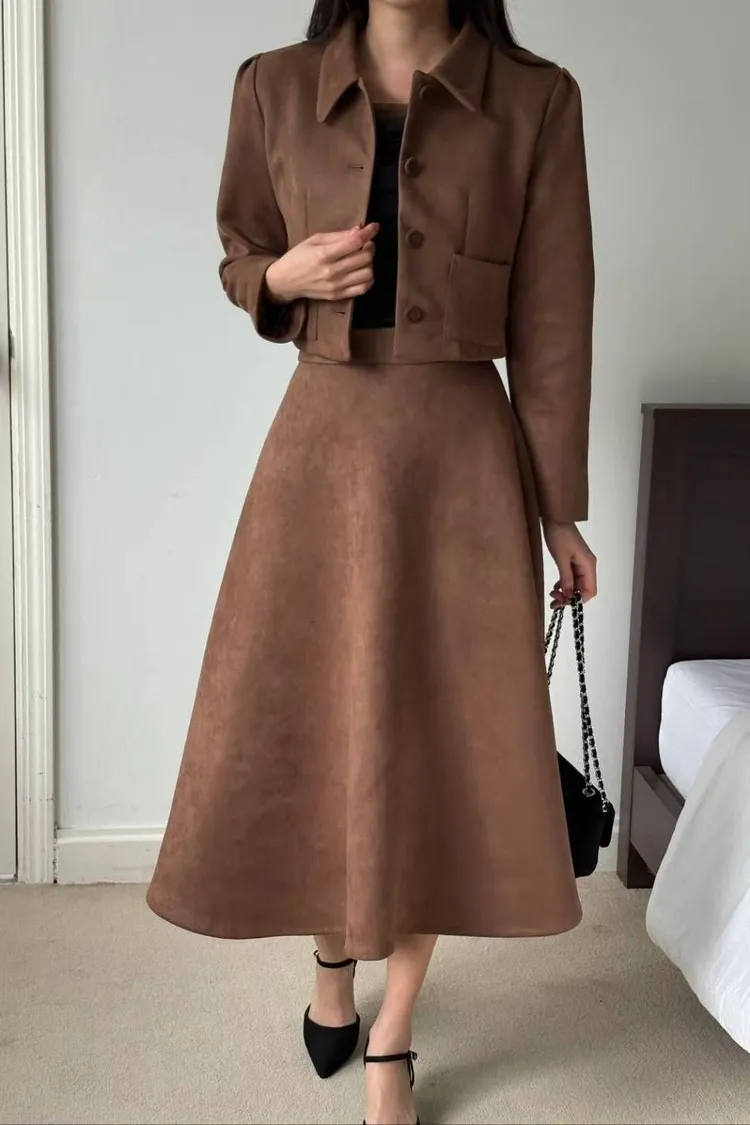 ✤復古麂皮絨短版外套&A字中長裙✤
