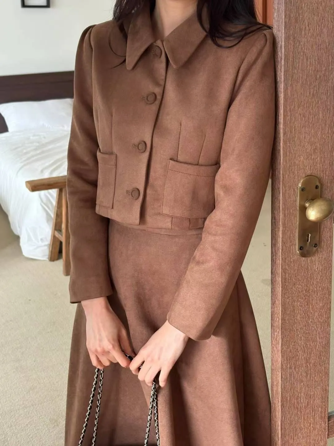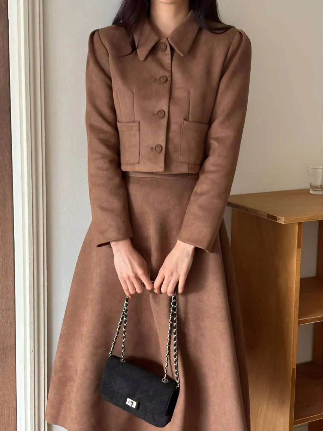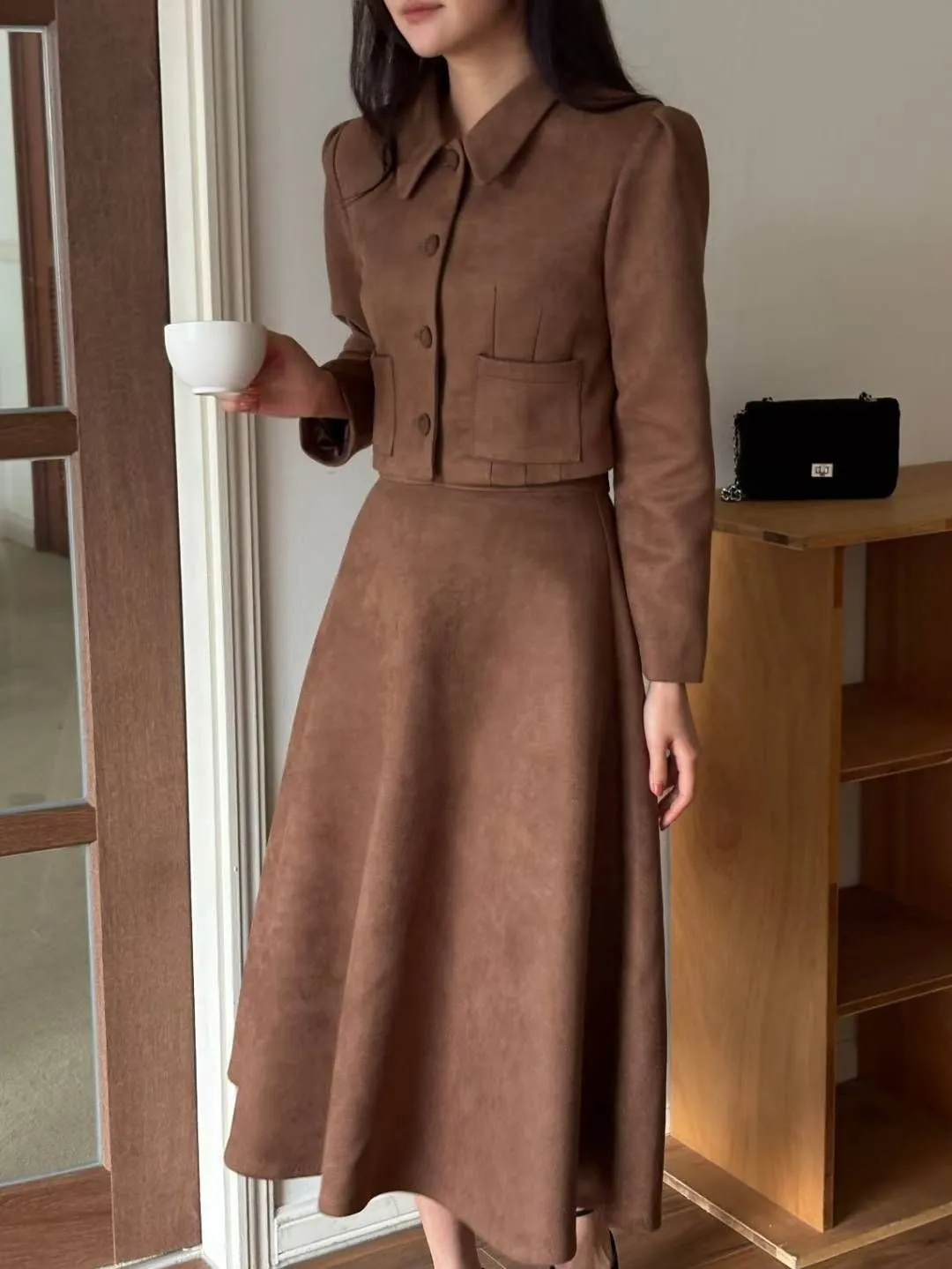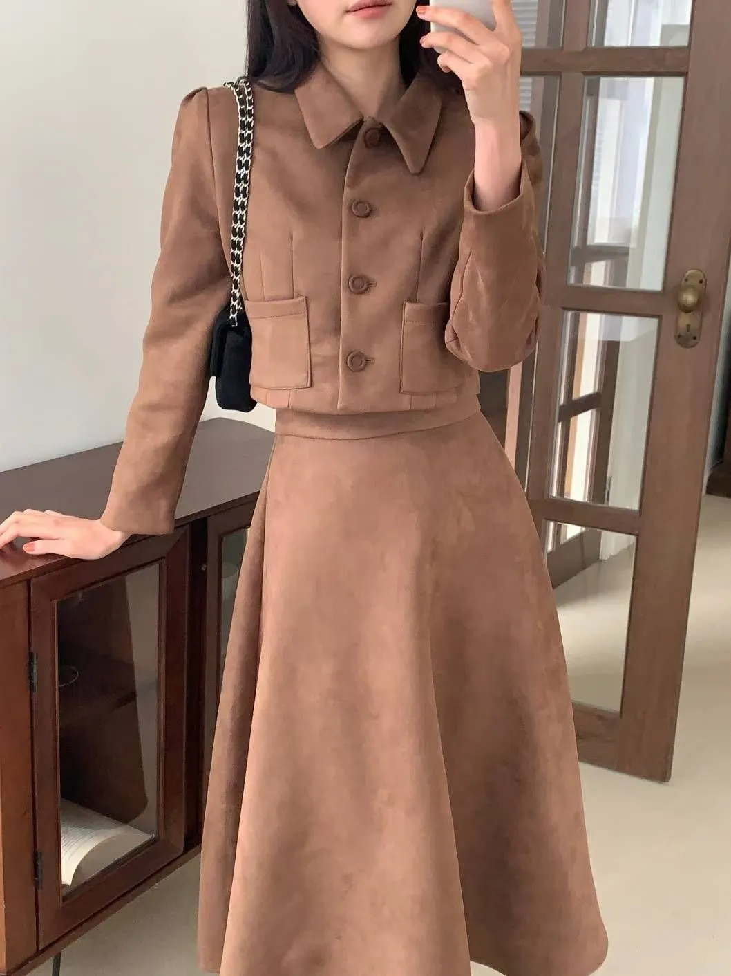 ✤復古麂皮絨短版外套&A字中長裙✤