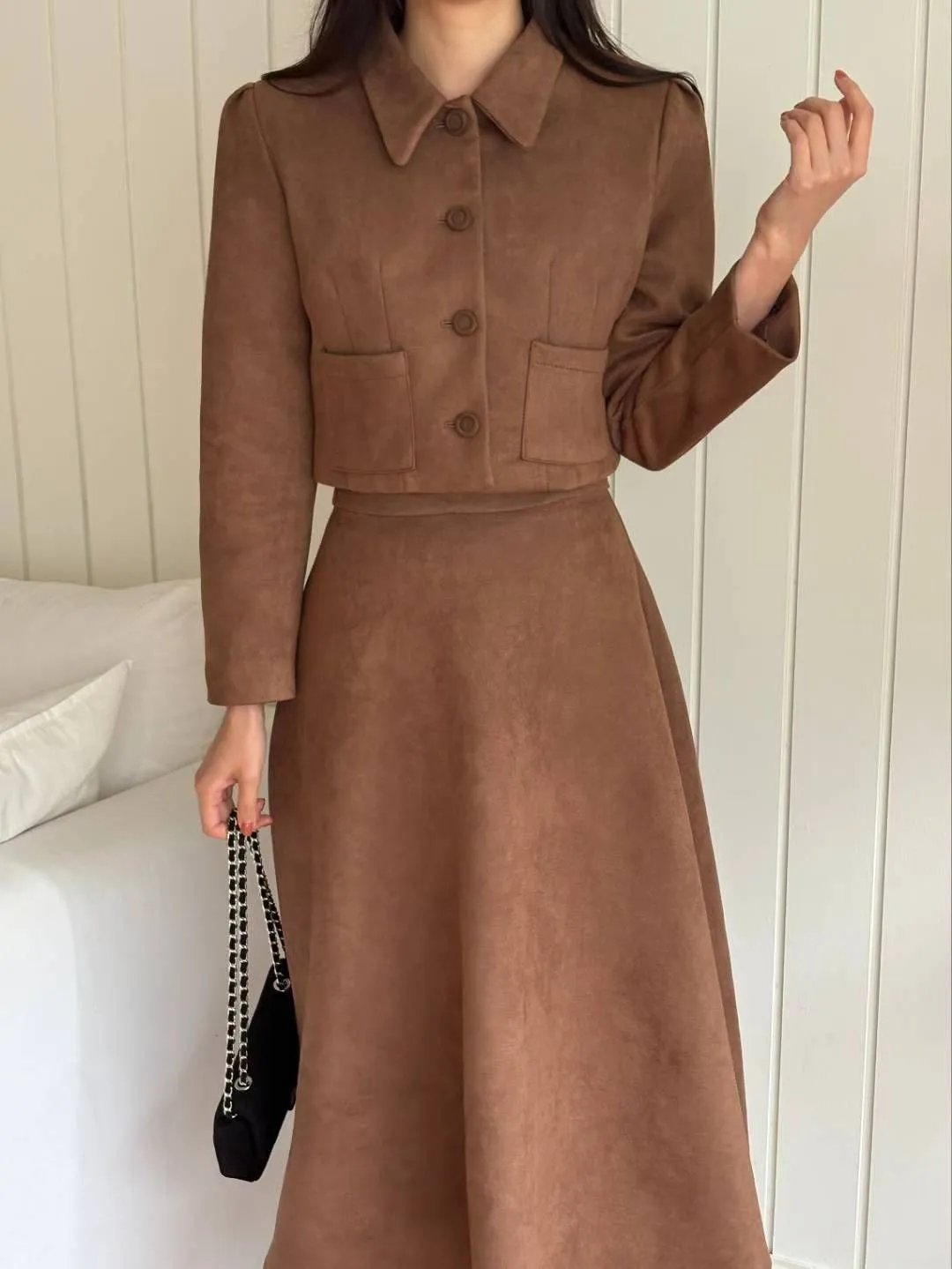 這款麂皮絨兩件式套裝,採用質感細膩的類麂皮面料,