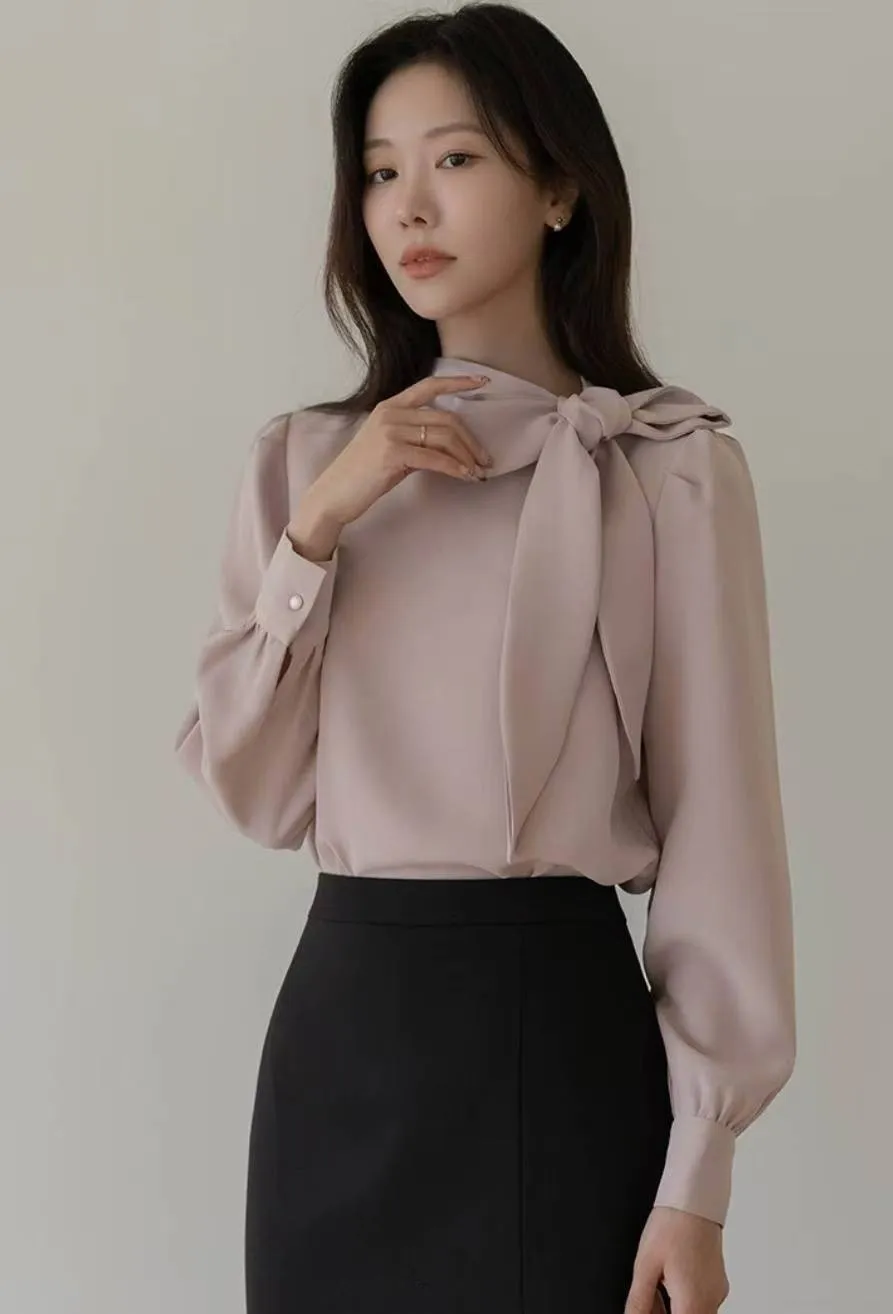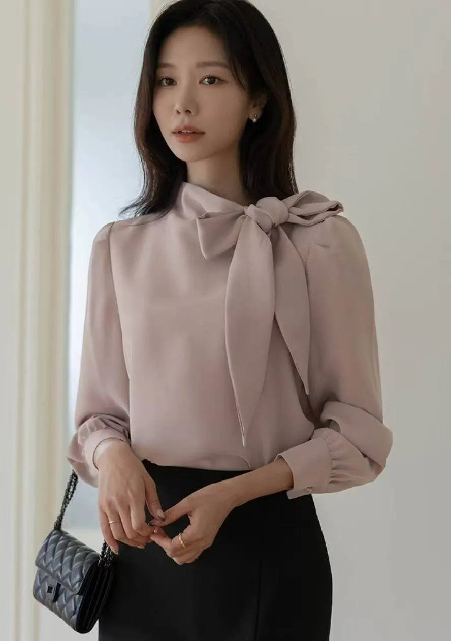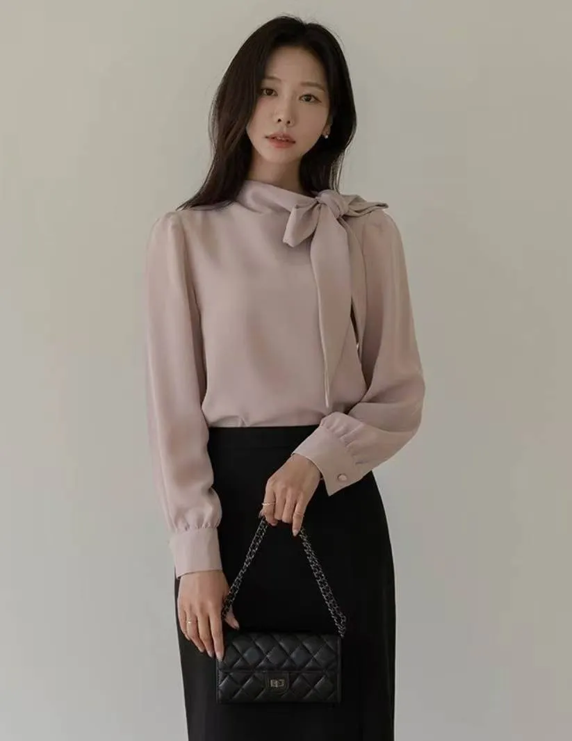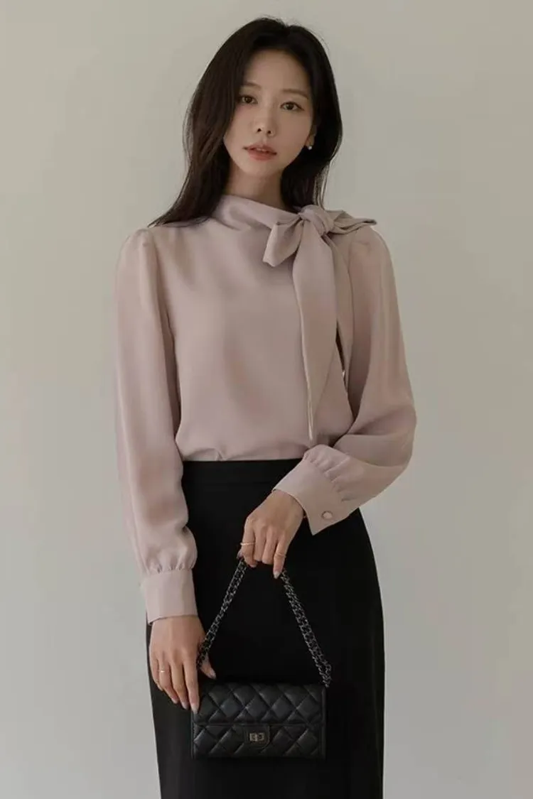 這款長袖雪紡襯衫以其精緻的緞帶蝴蝶結領口設計為最大亮點,