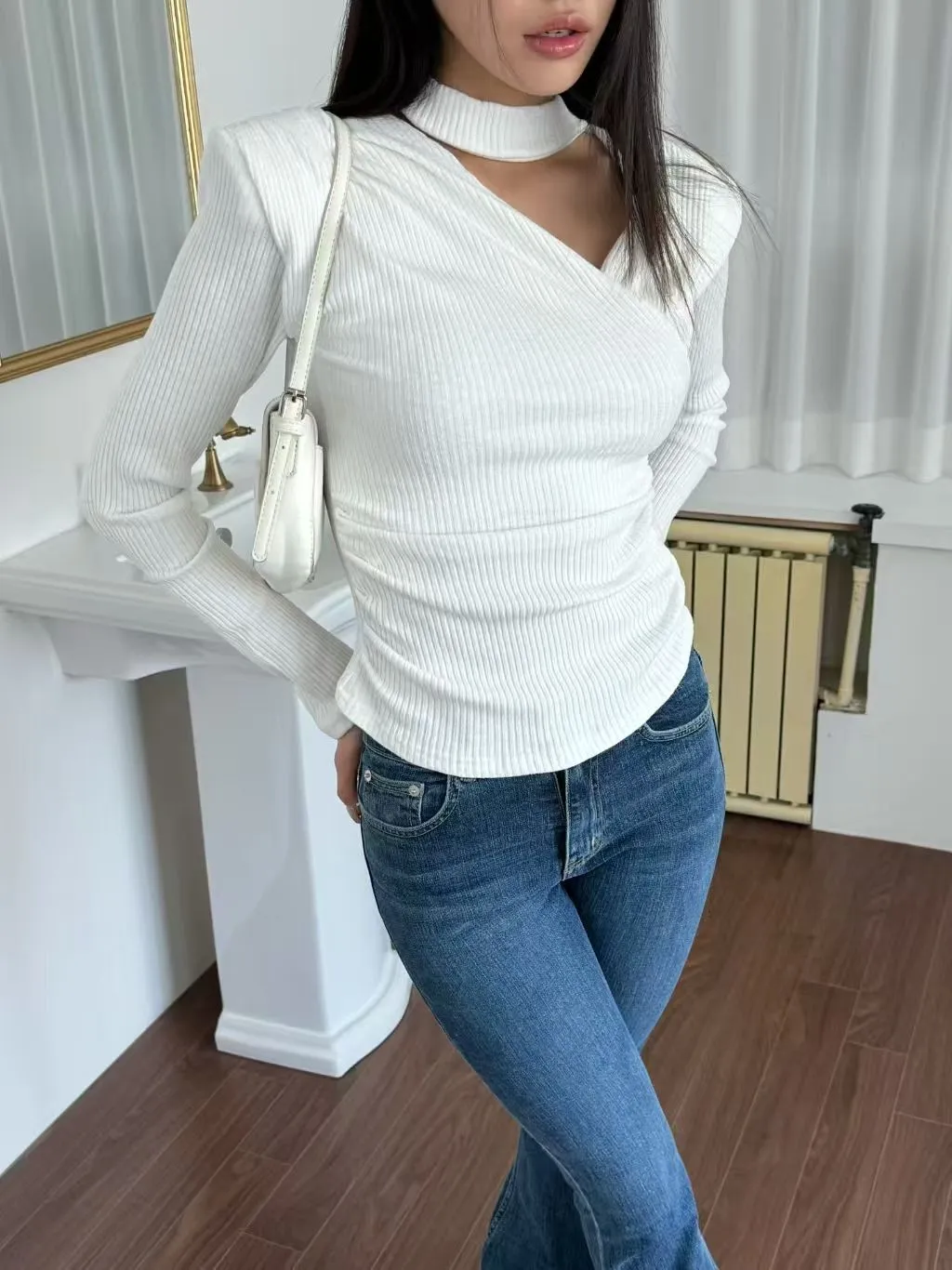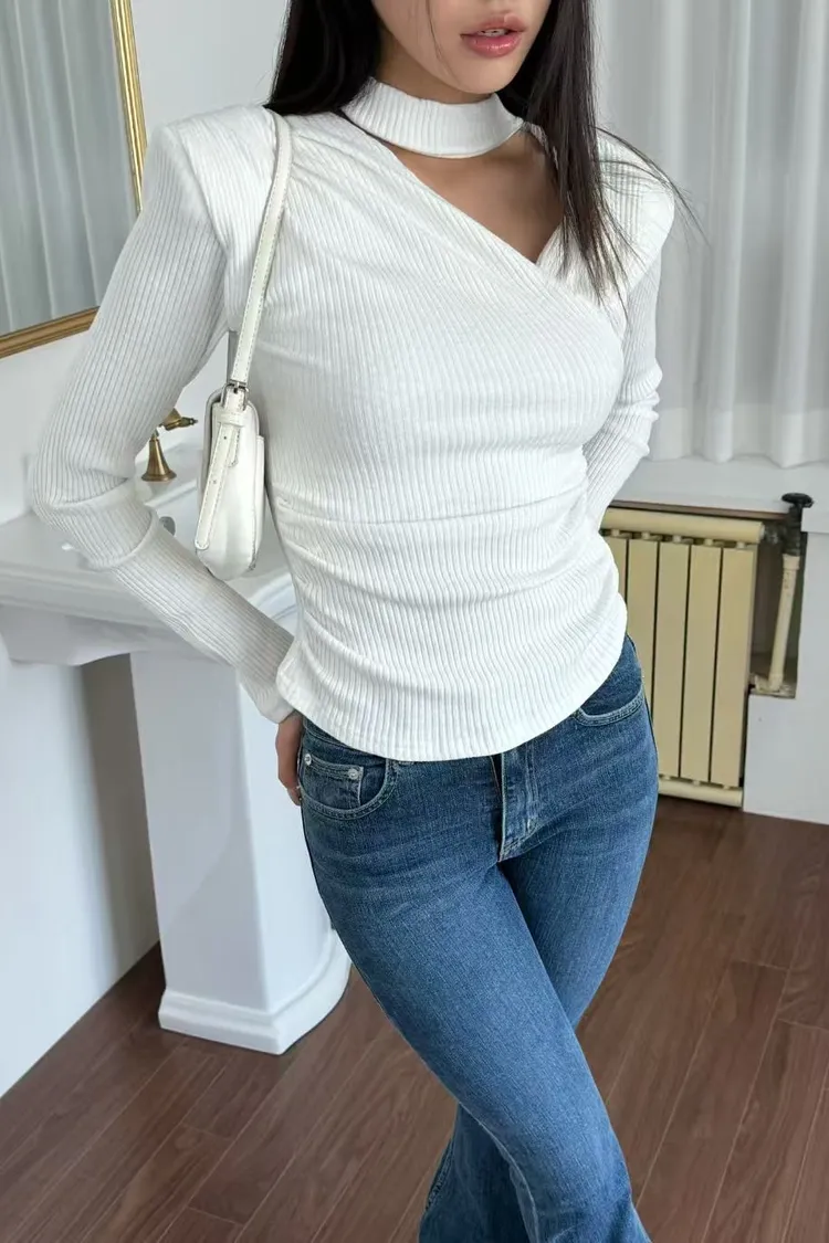 不規則斜領墊肩修身螺紋上衣