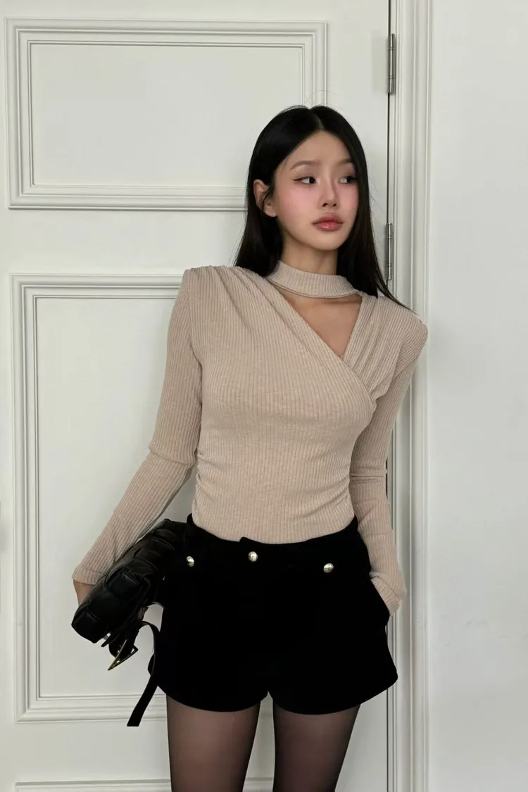 它結合了不規則斜V領與Choker式鎖骨挖空,