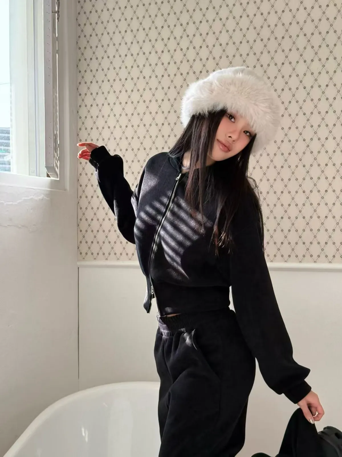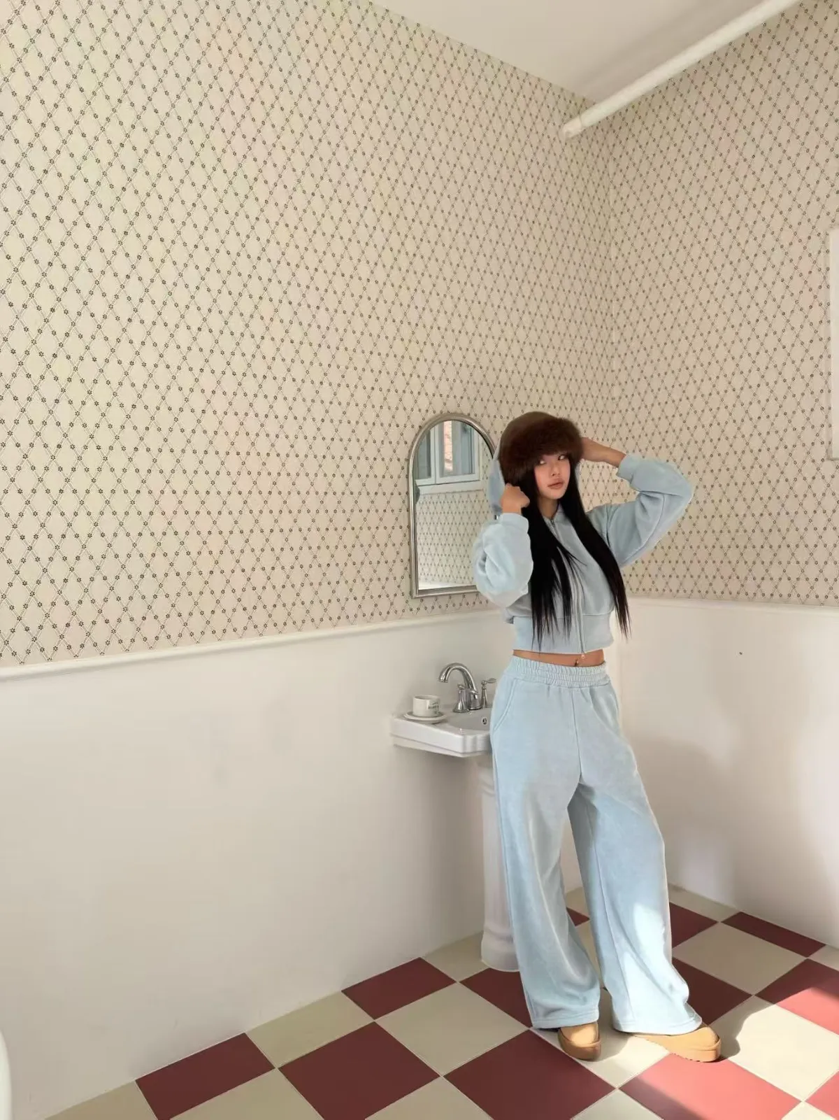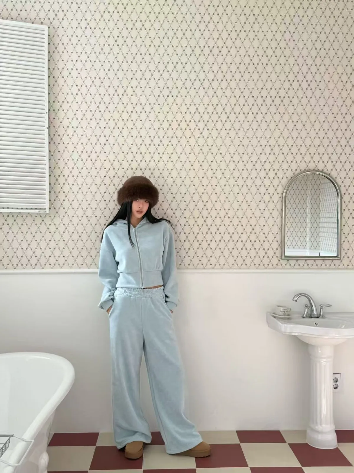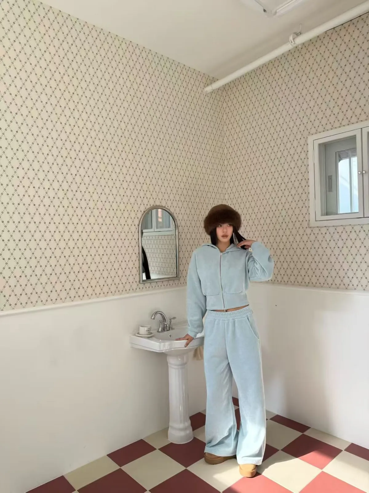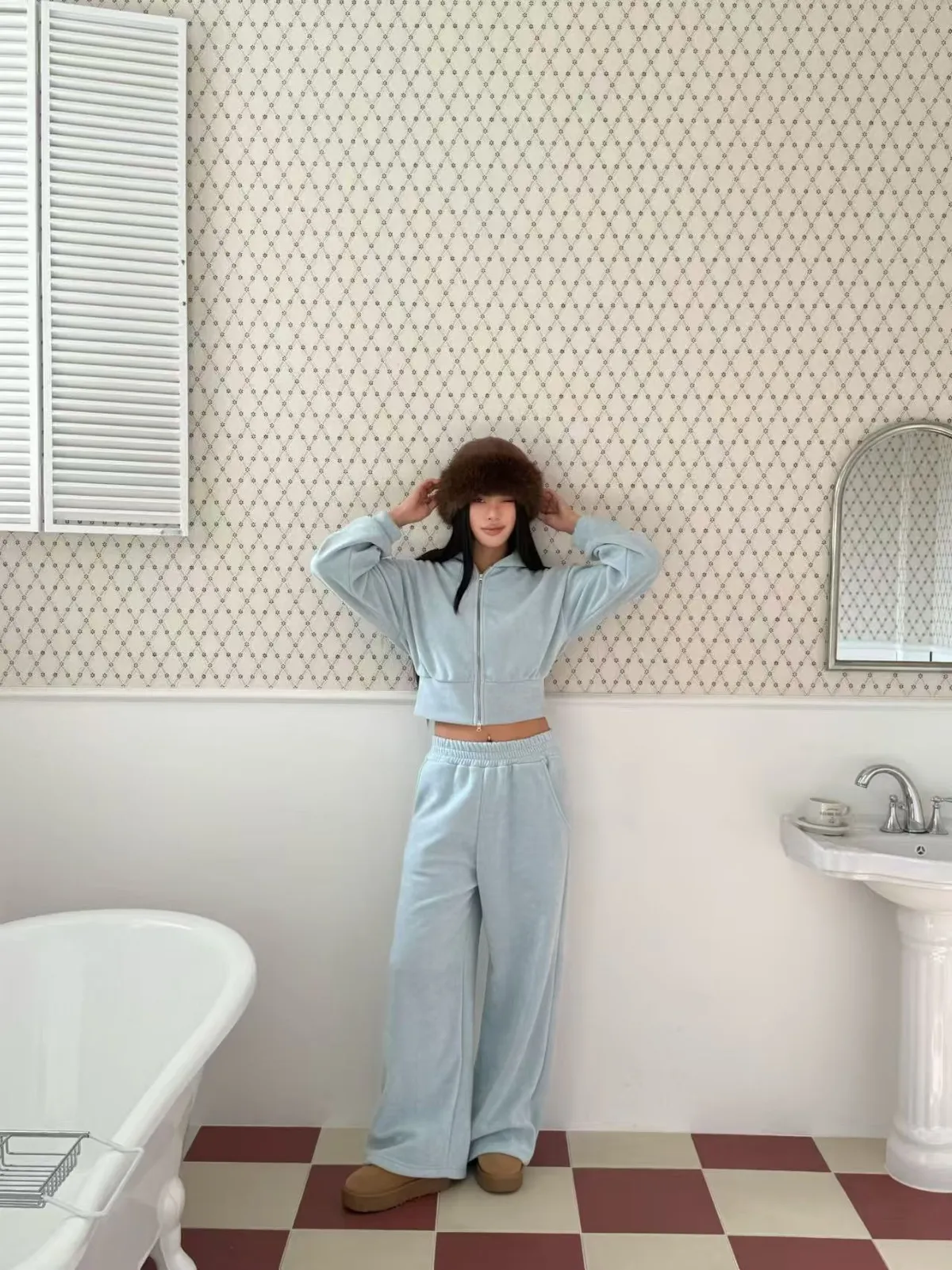 這套休閒運動套裝採用親膚的絨面材質,保暖舒適又柔軟。