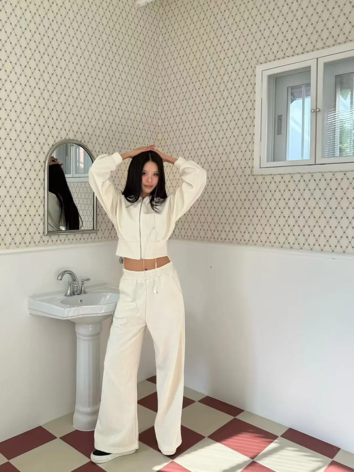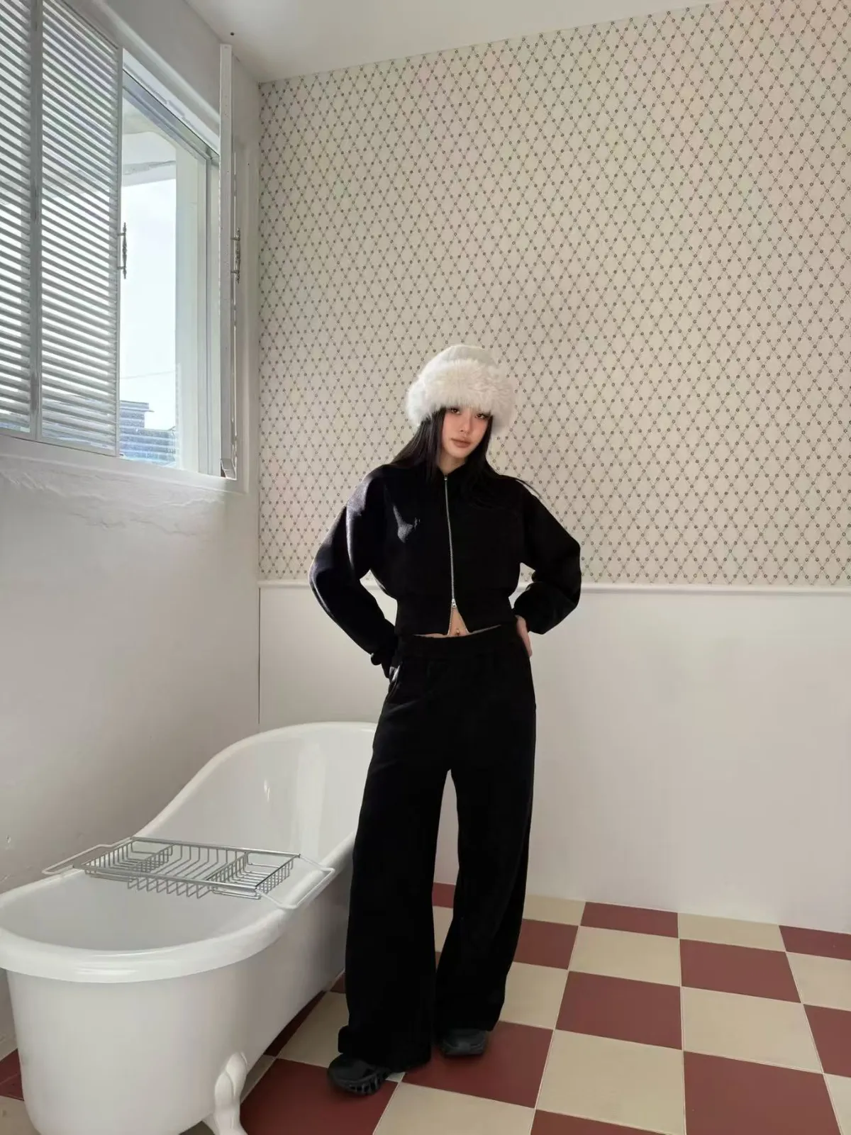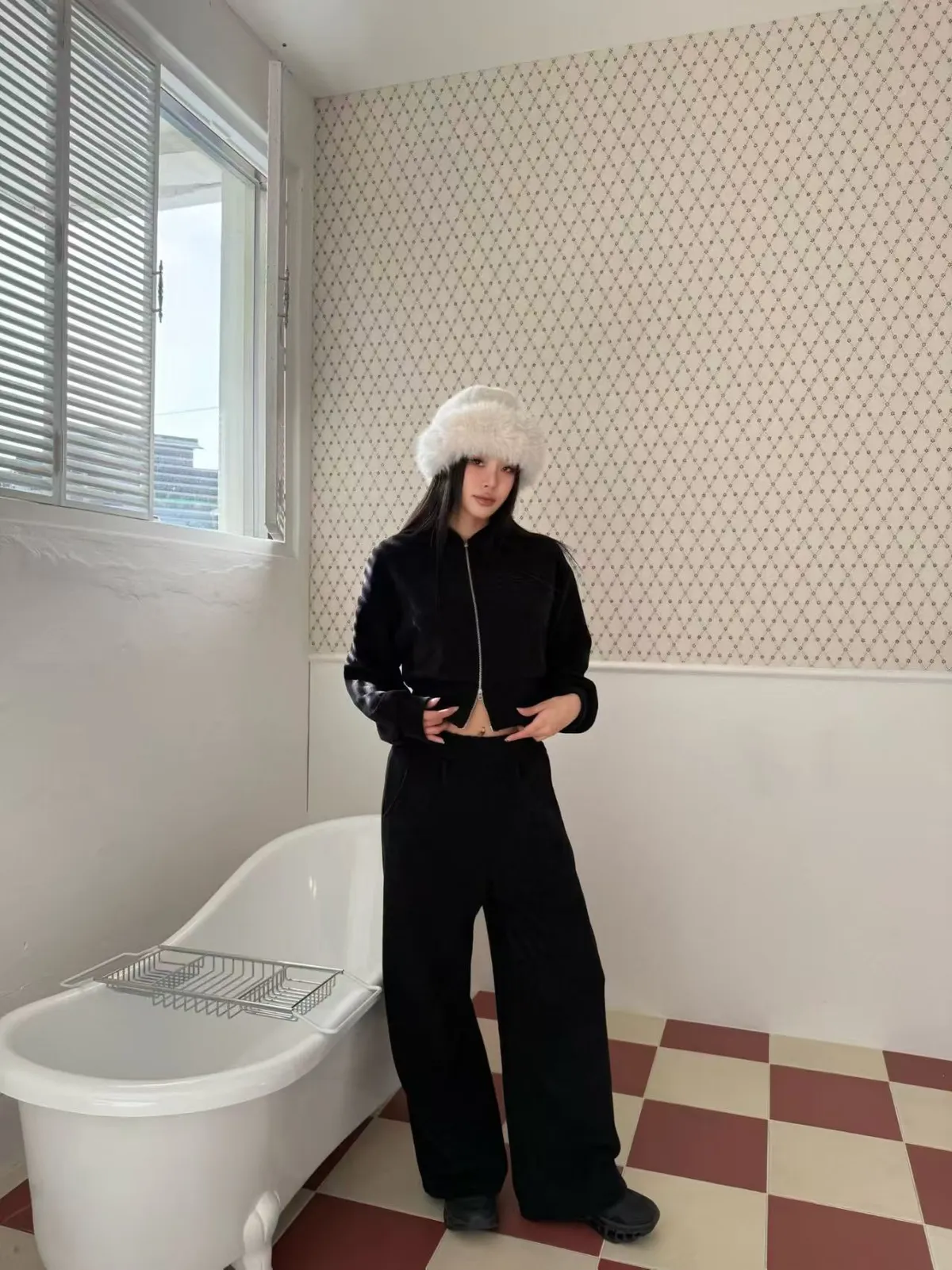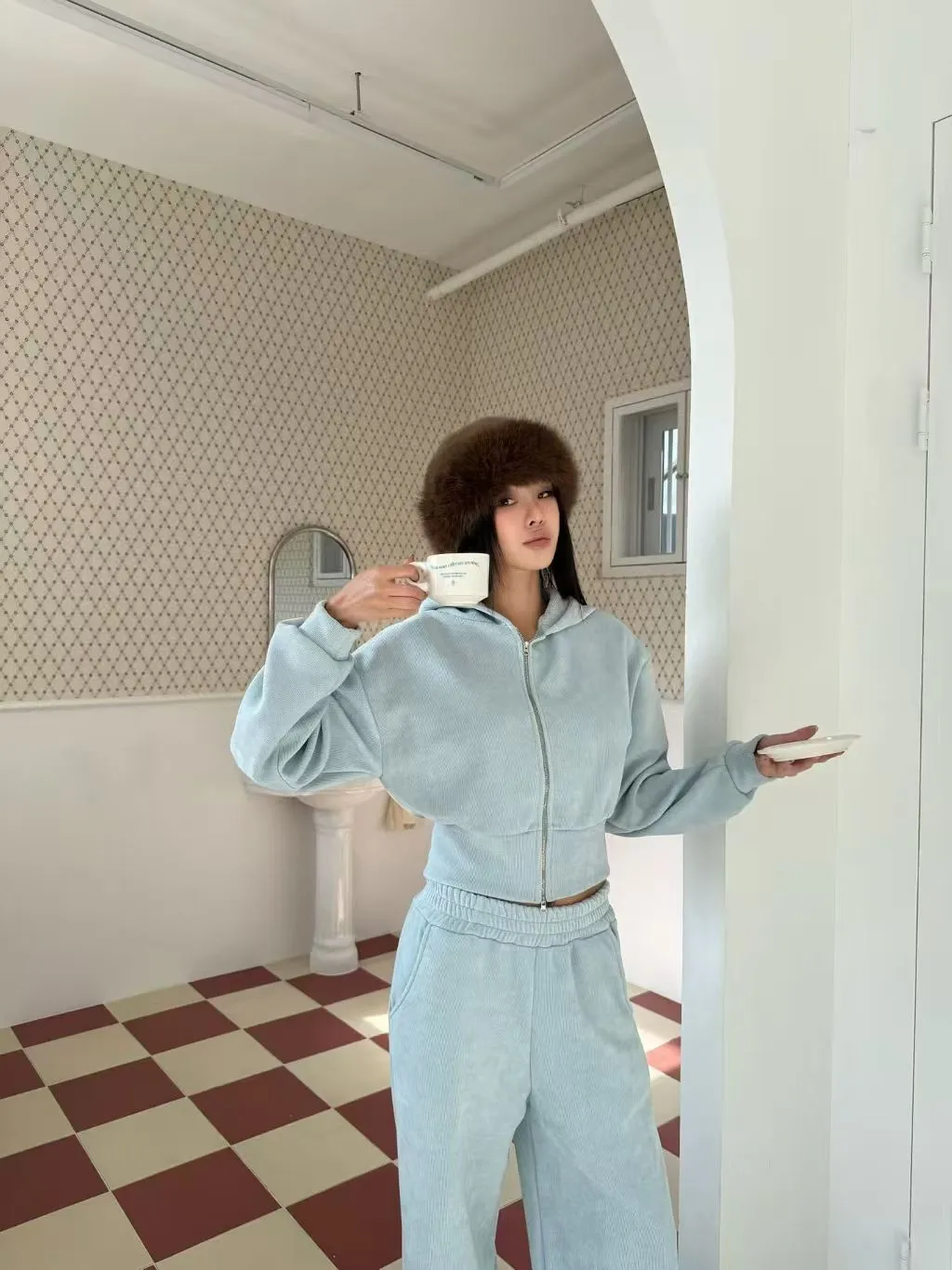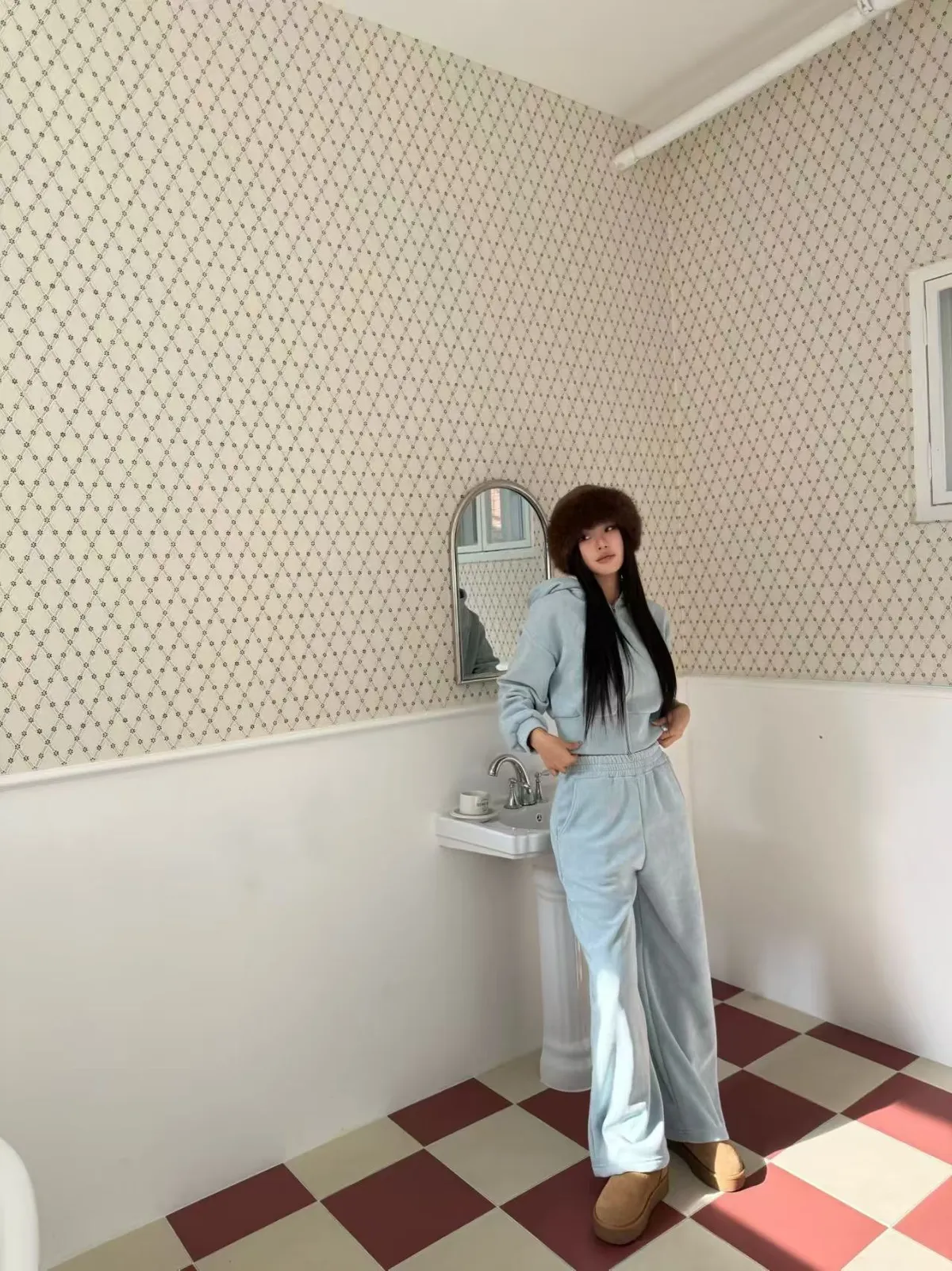 這套休閒運動套裝採用親膚的絨面材質,保暖舒適又柔軟。