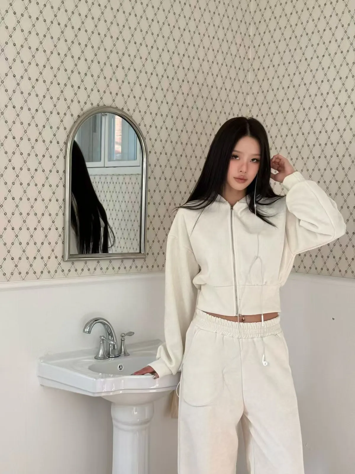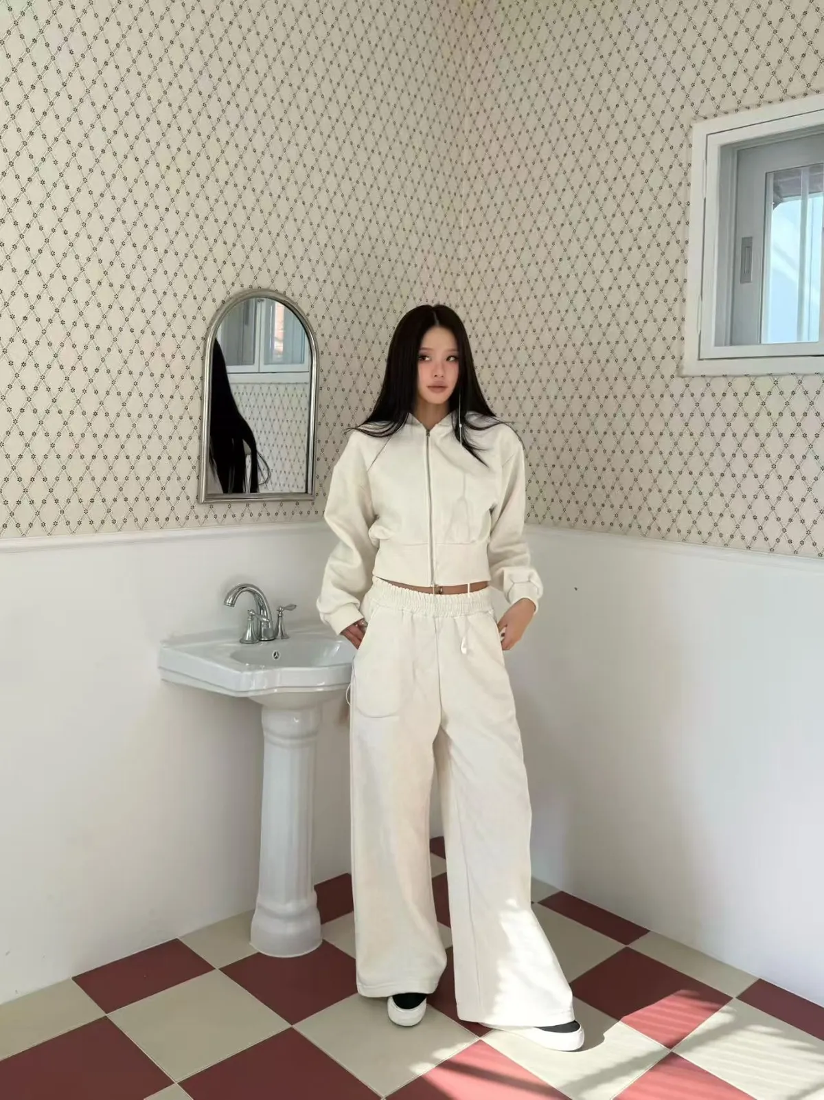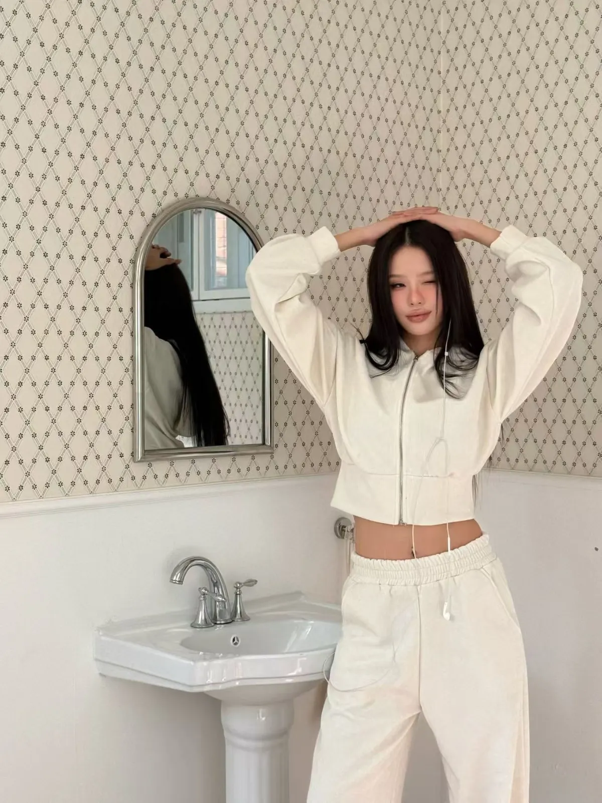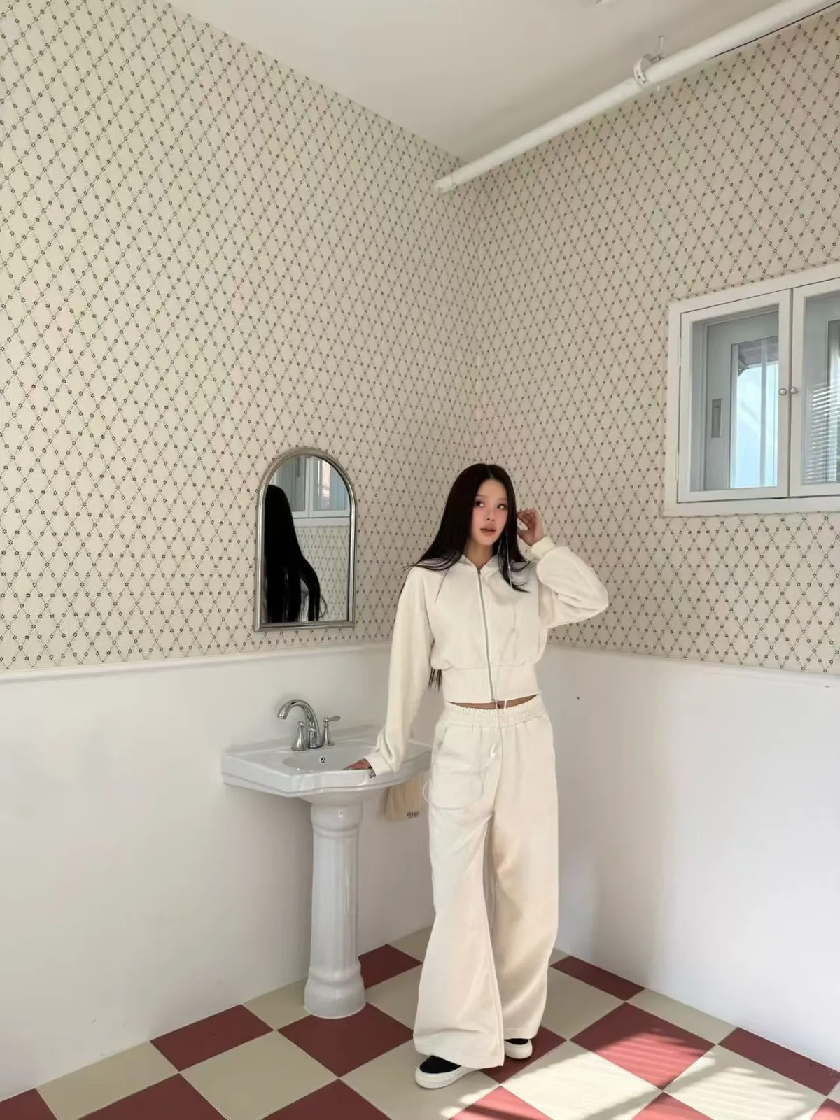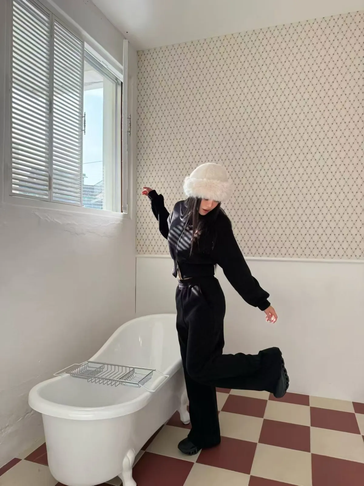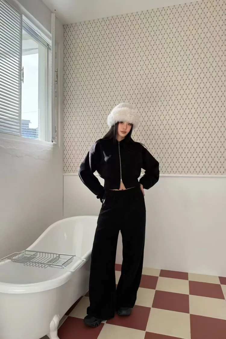 這套休閒運動套裝採用親膚的絨面材質,保暖舒適又柔軟。