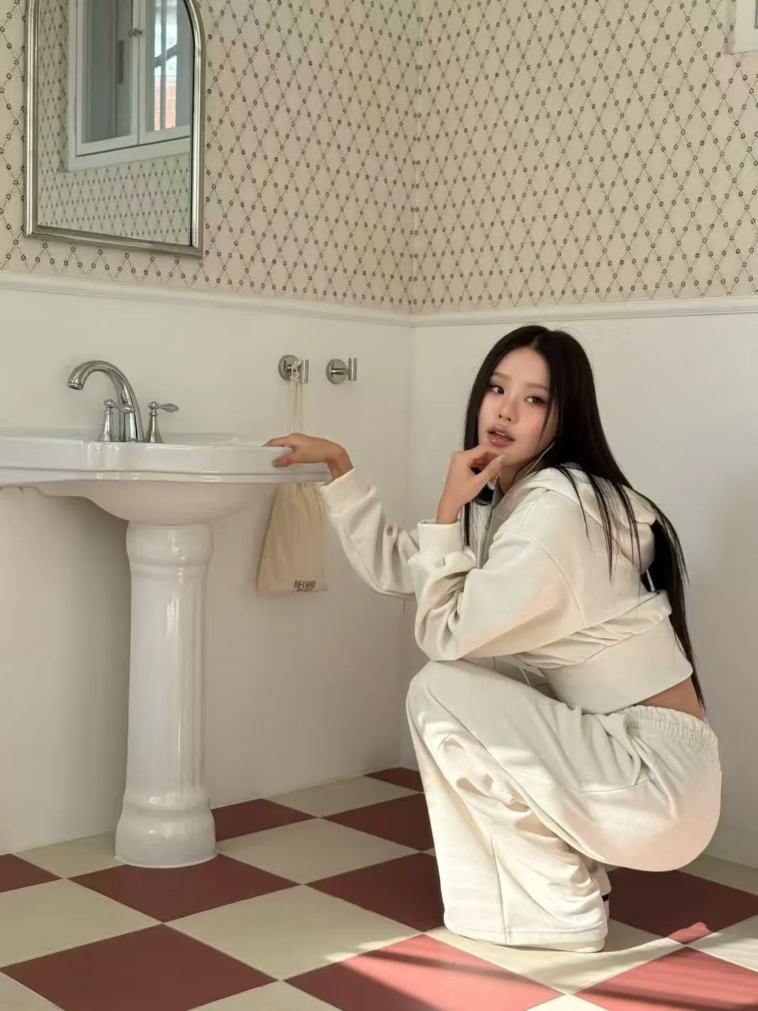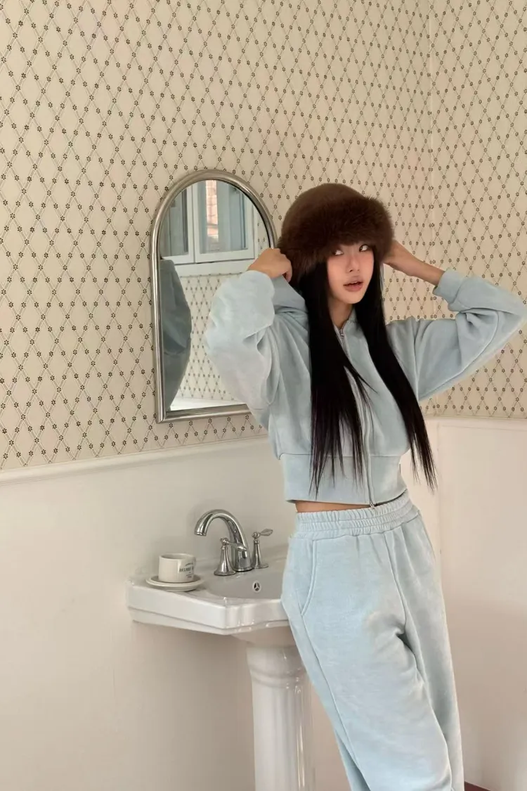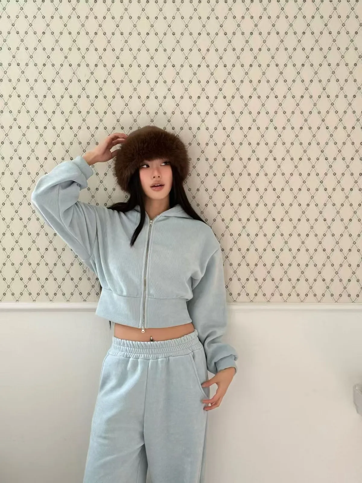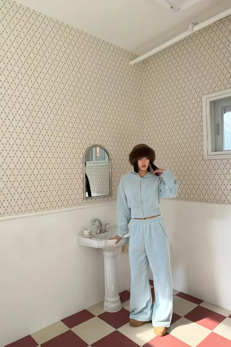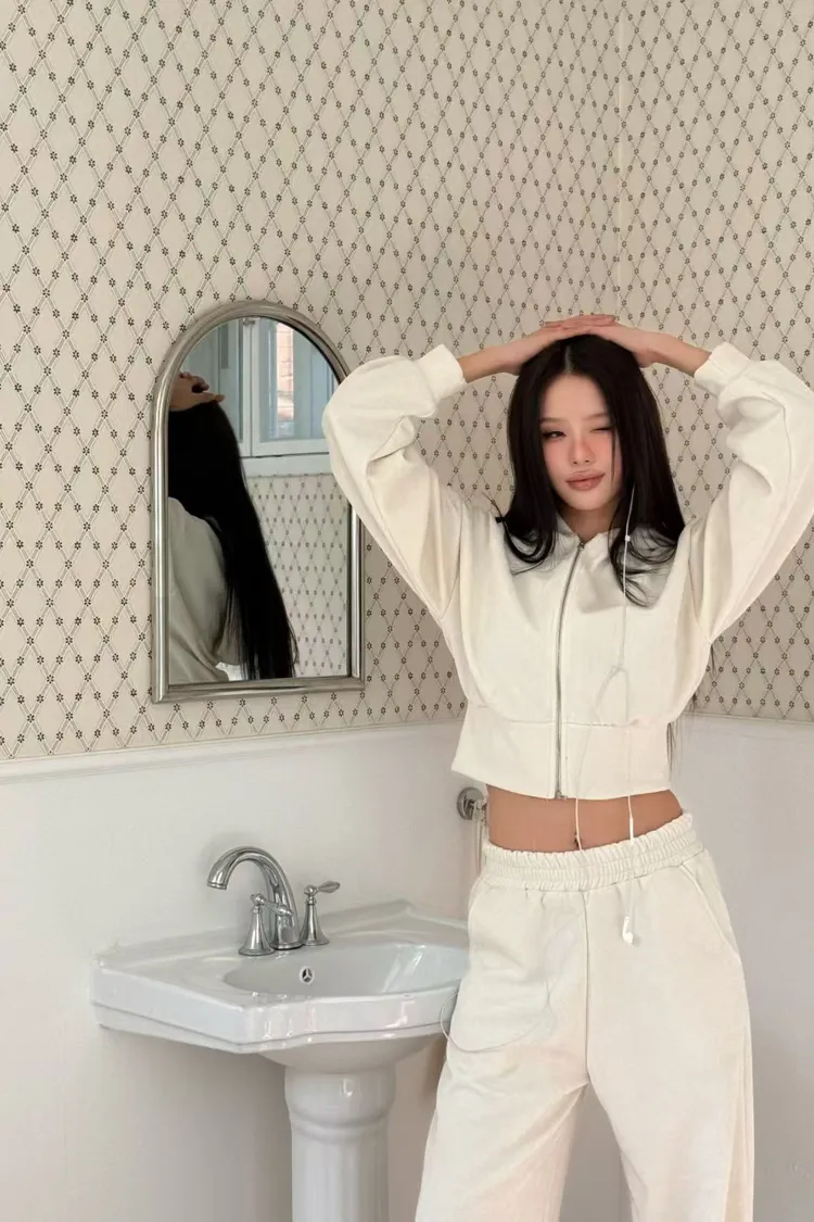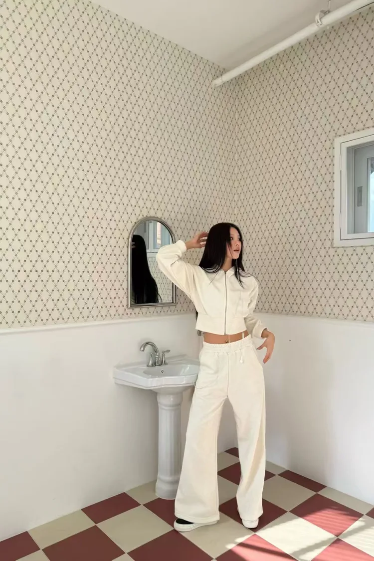 這套休閒運動套裝採用親膚的絨面材質,保暖舒適又柔軟。