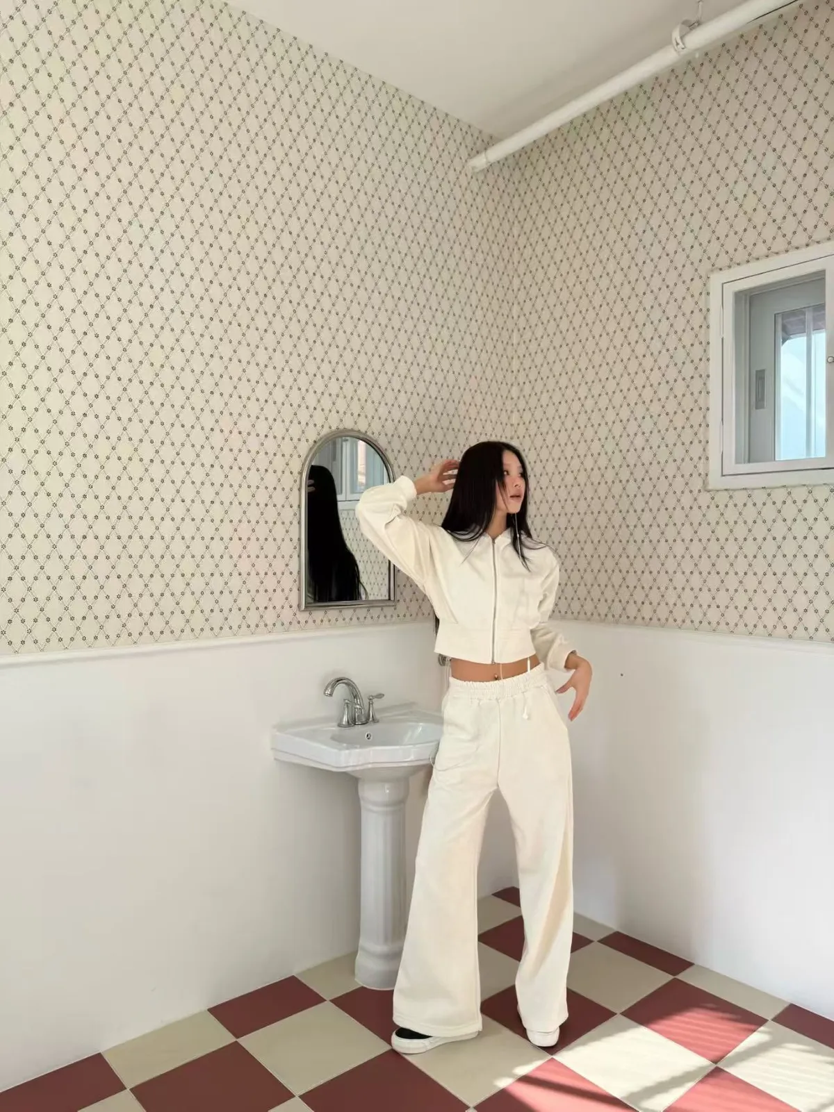 下裝為高腰寬鬆落地褲,修飾腿型,輕鬆打造顯瘦效果。