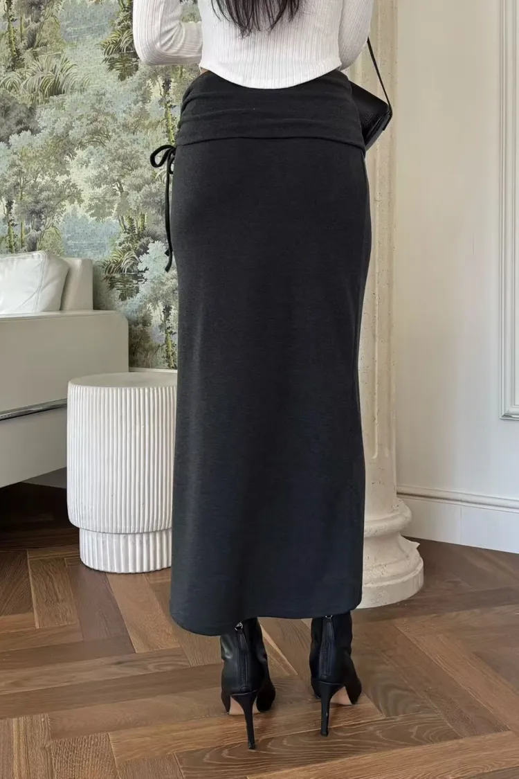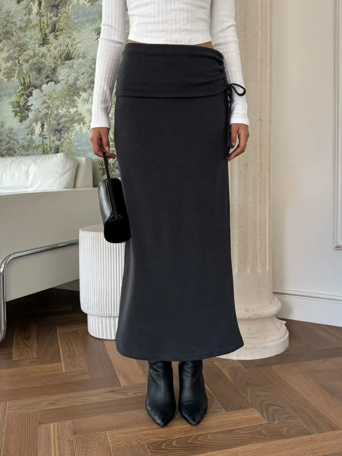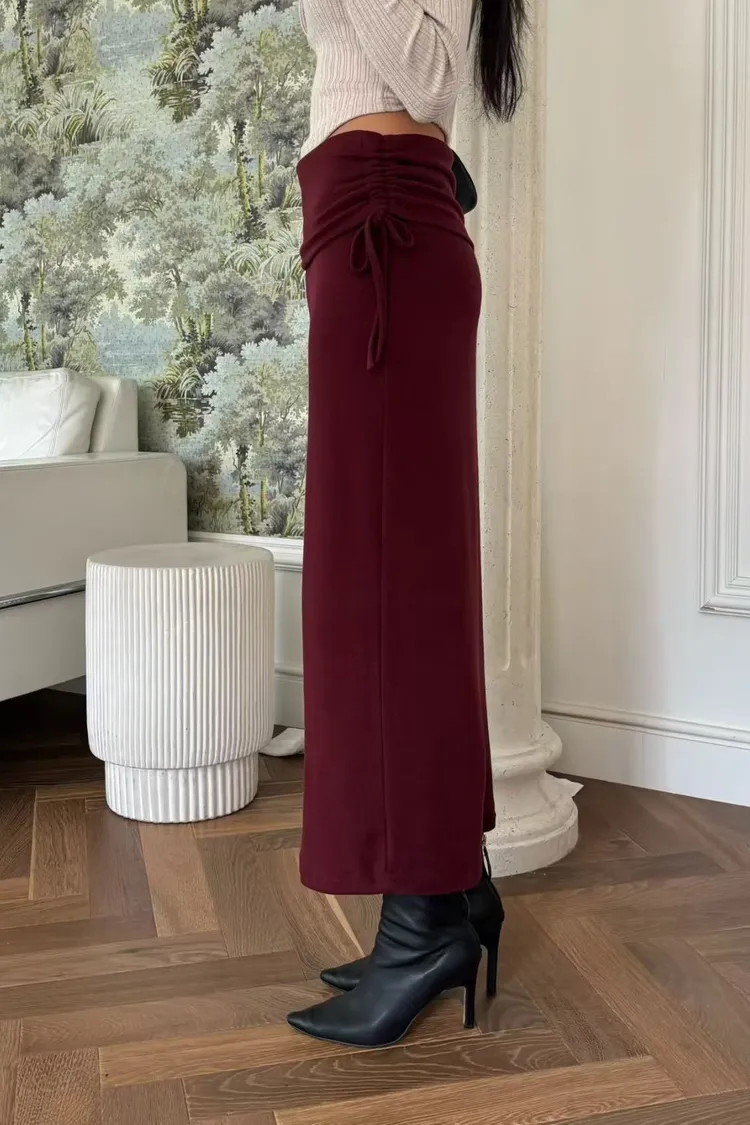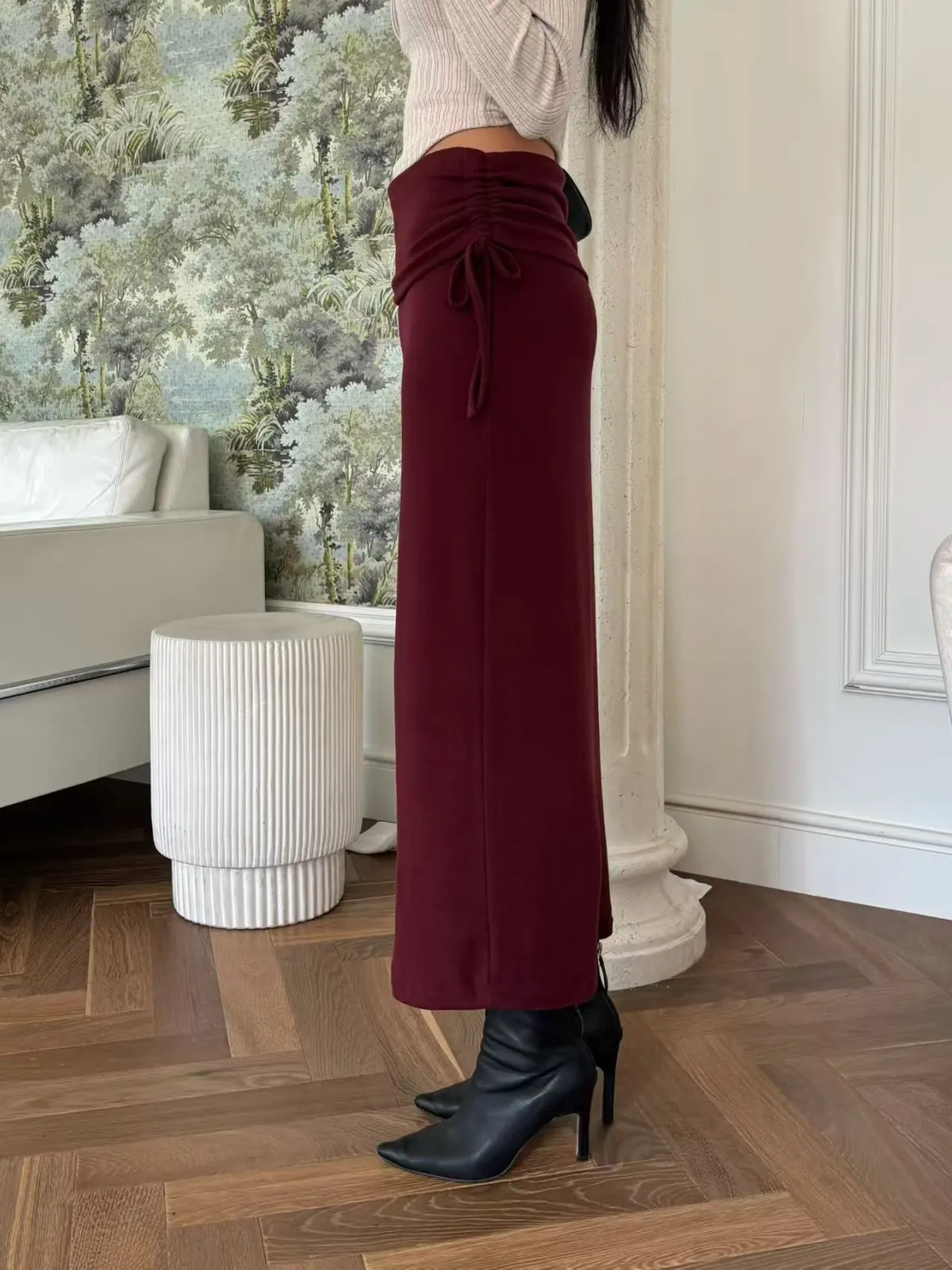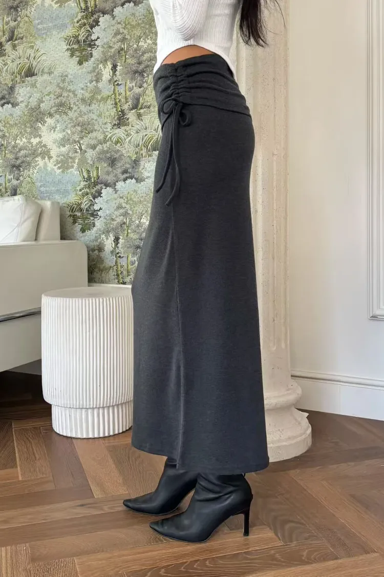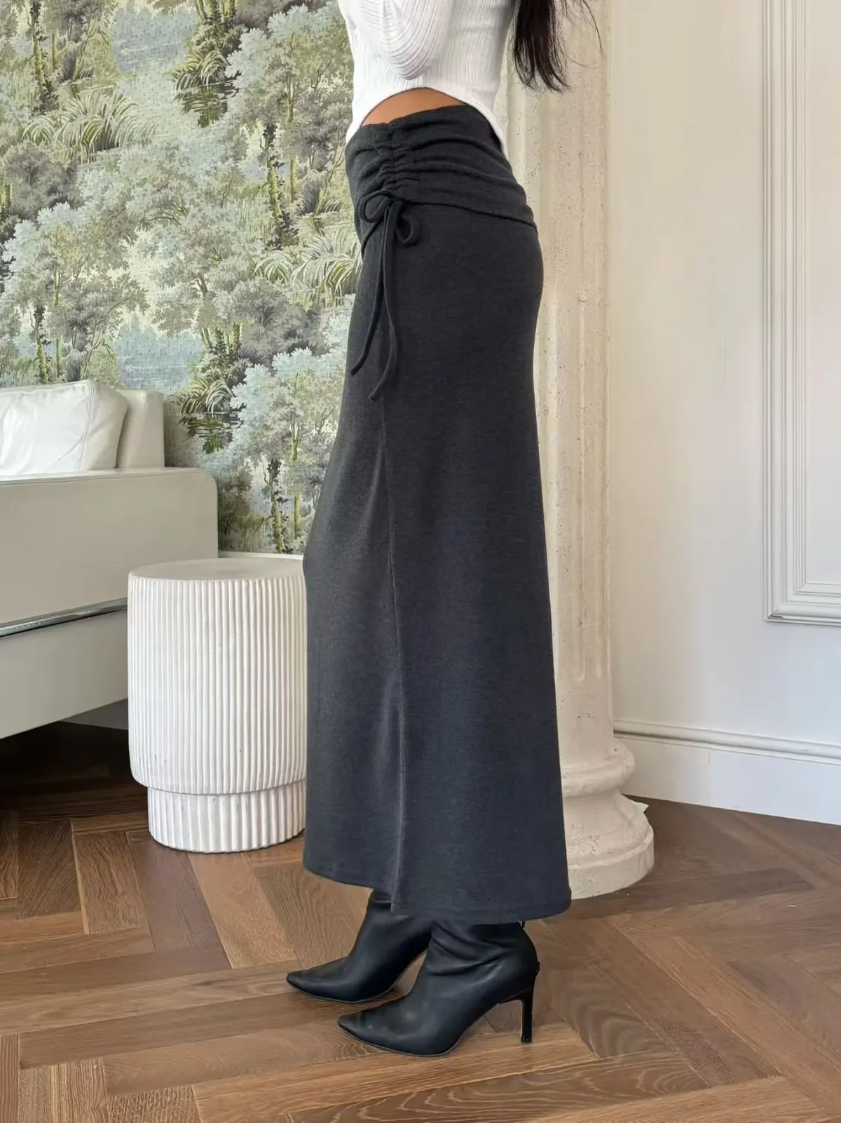側邊的心機抽繩綁帶,可自由調整褶皺和裙襬長度,
