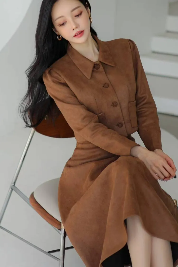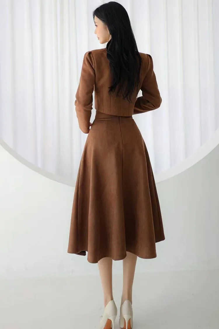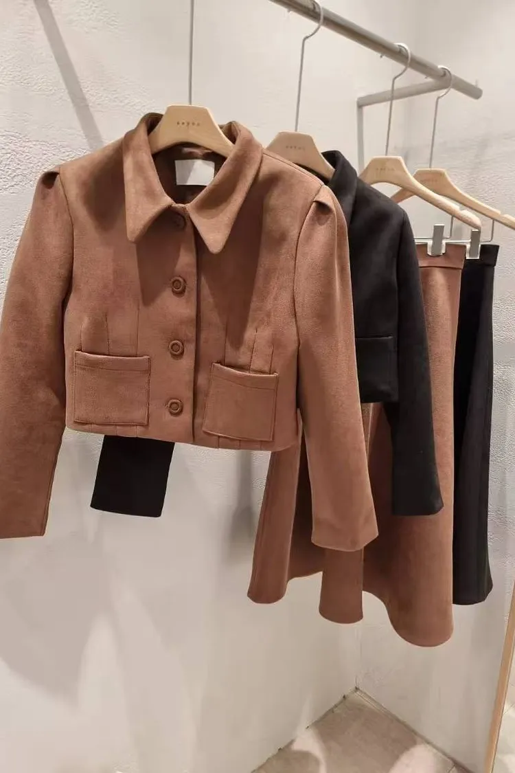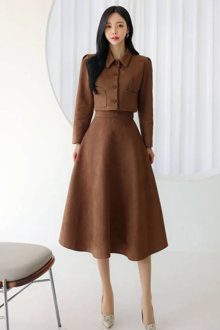 韓國代購 翻領短款毛呢外套復古套裝 韓國長裙 韓國外套