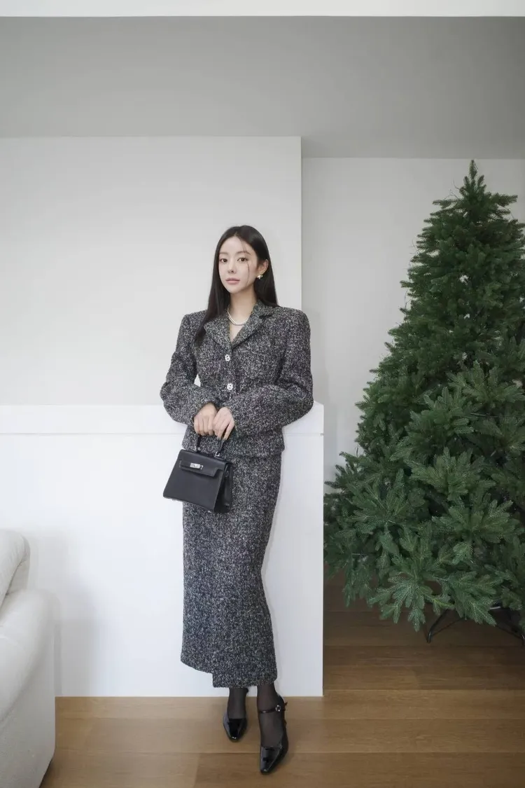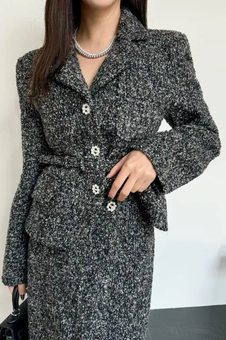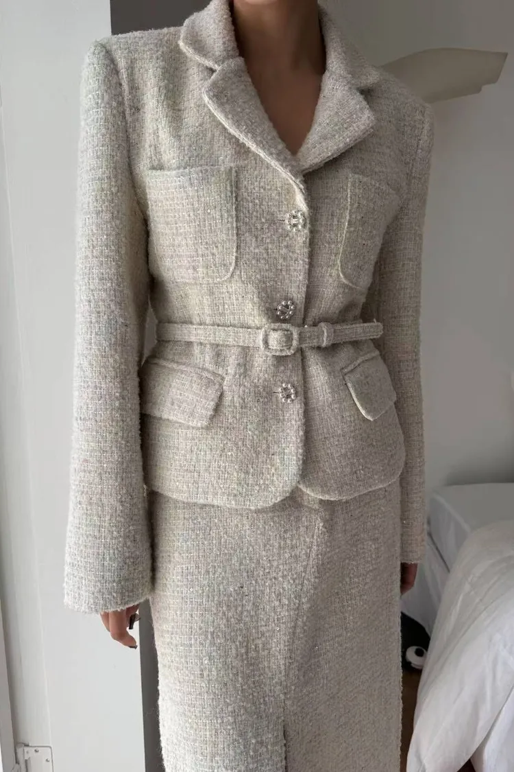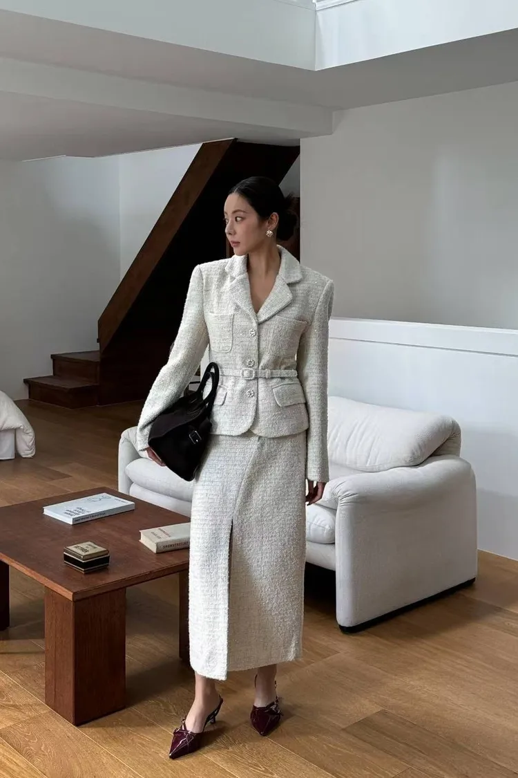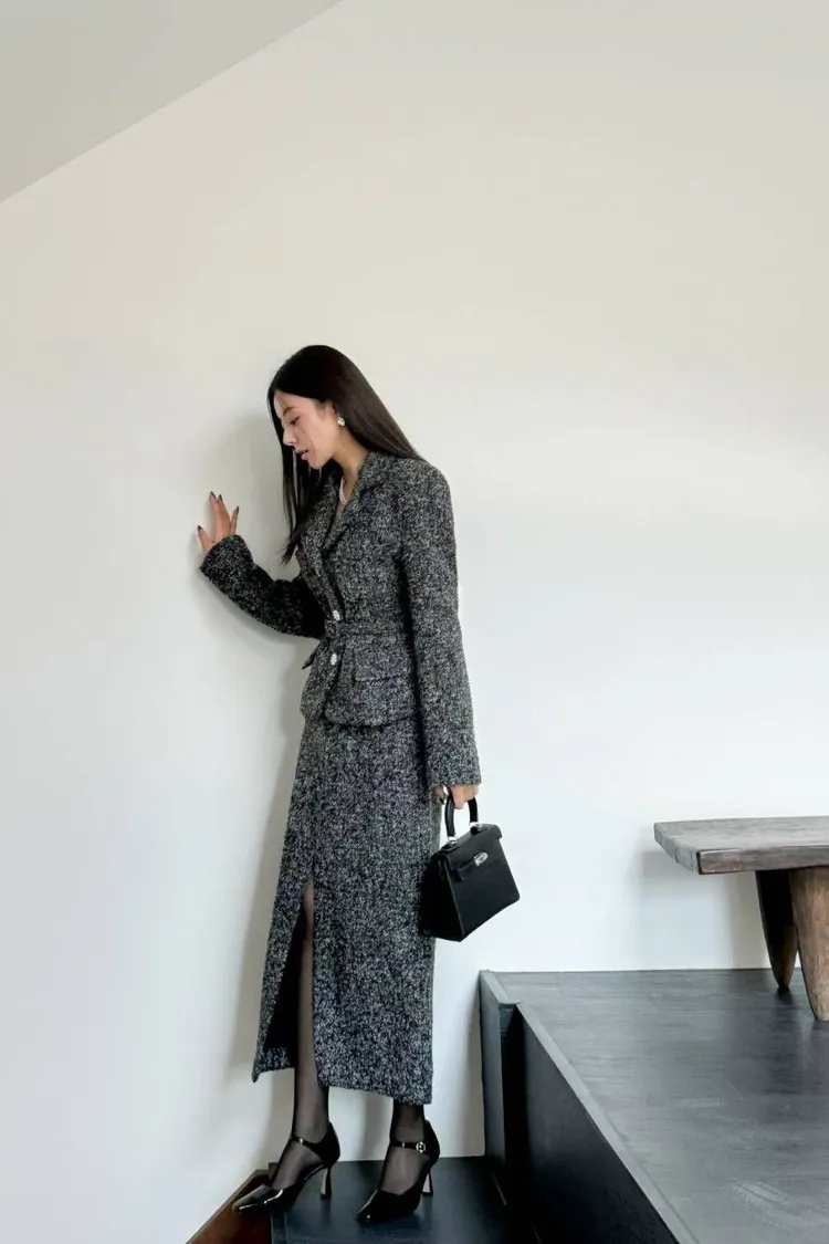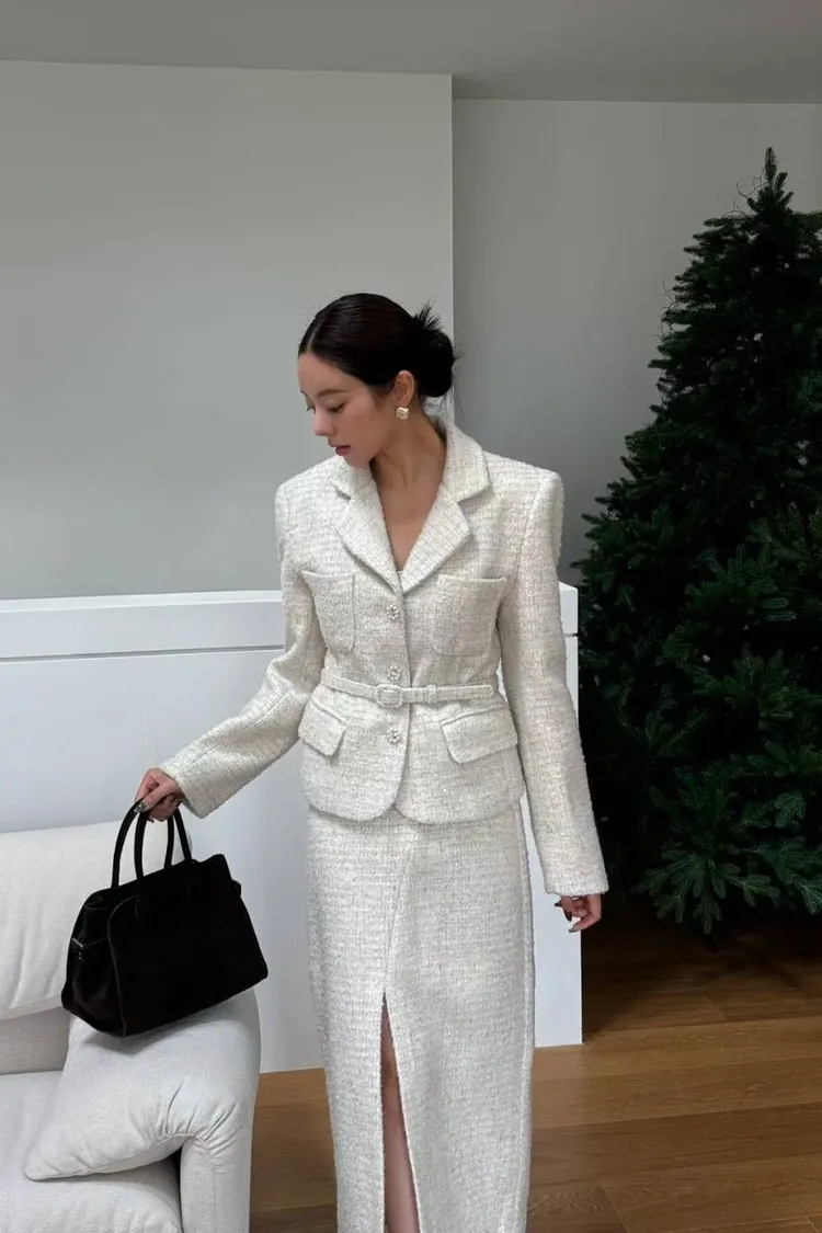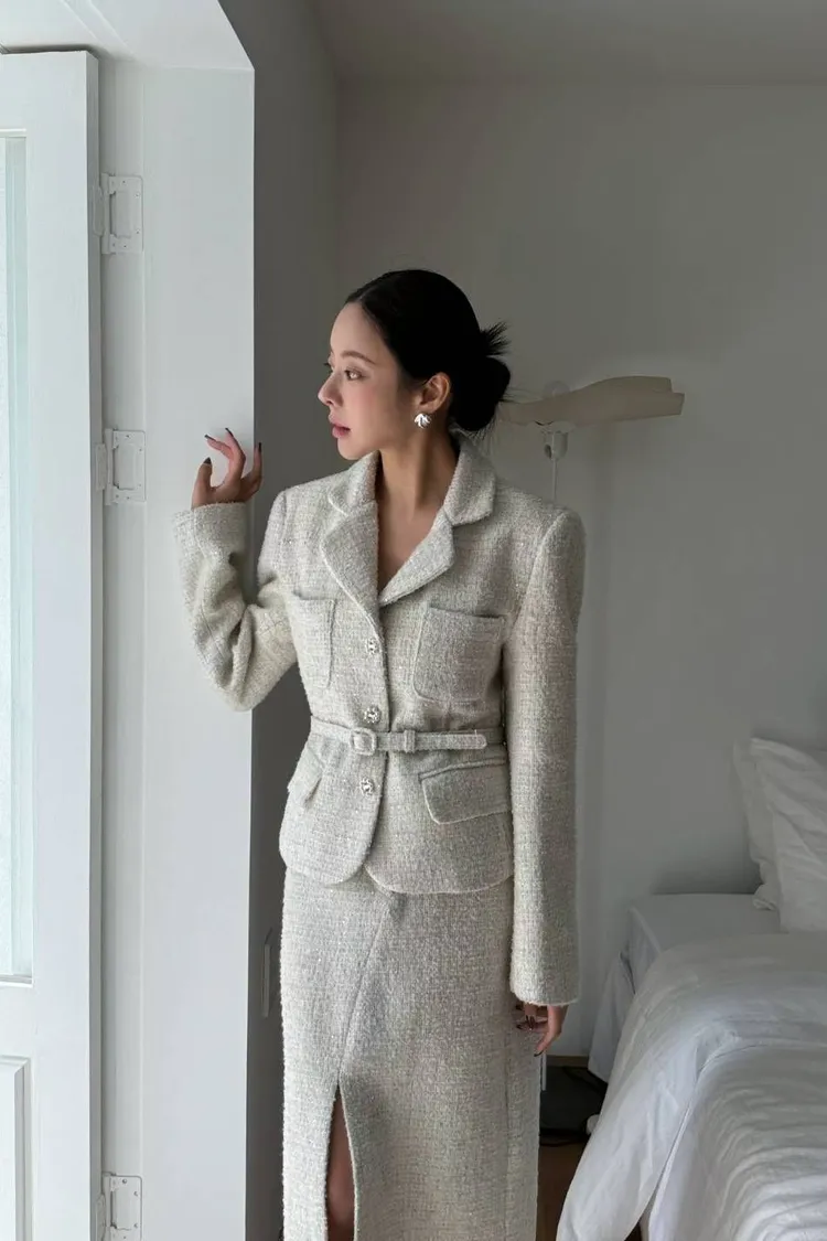 韓國代購 腰帶短版西裝外套開衩裙套裝
