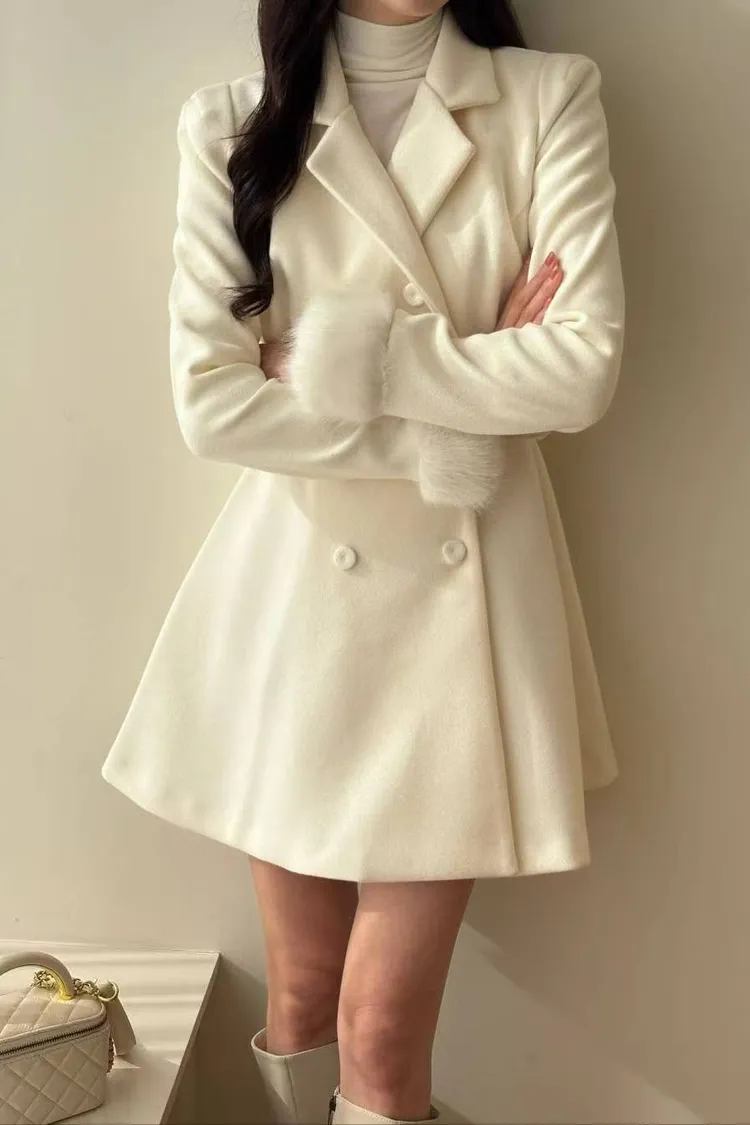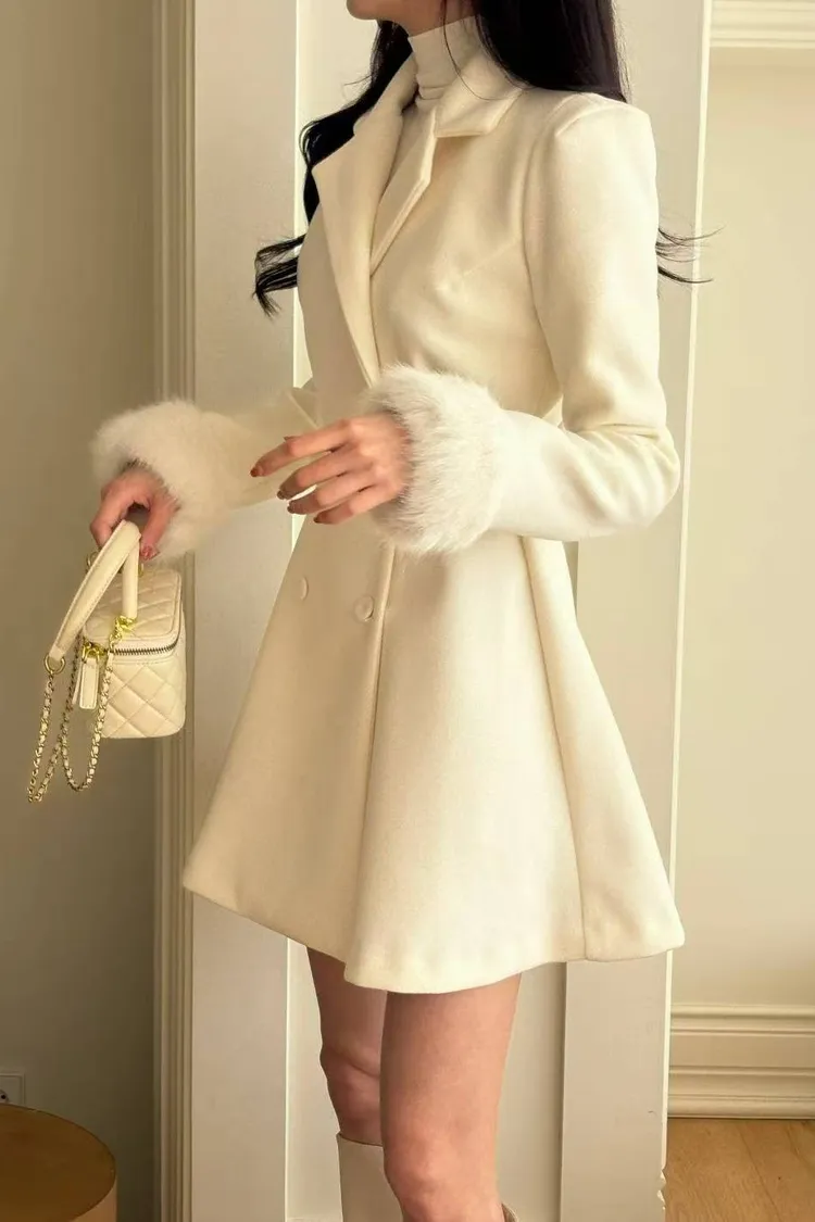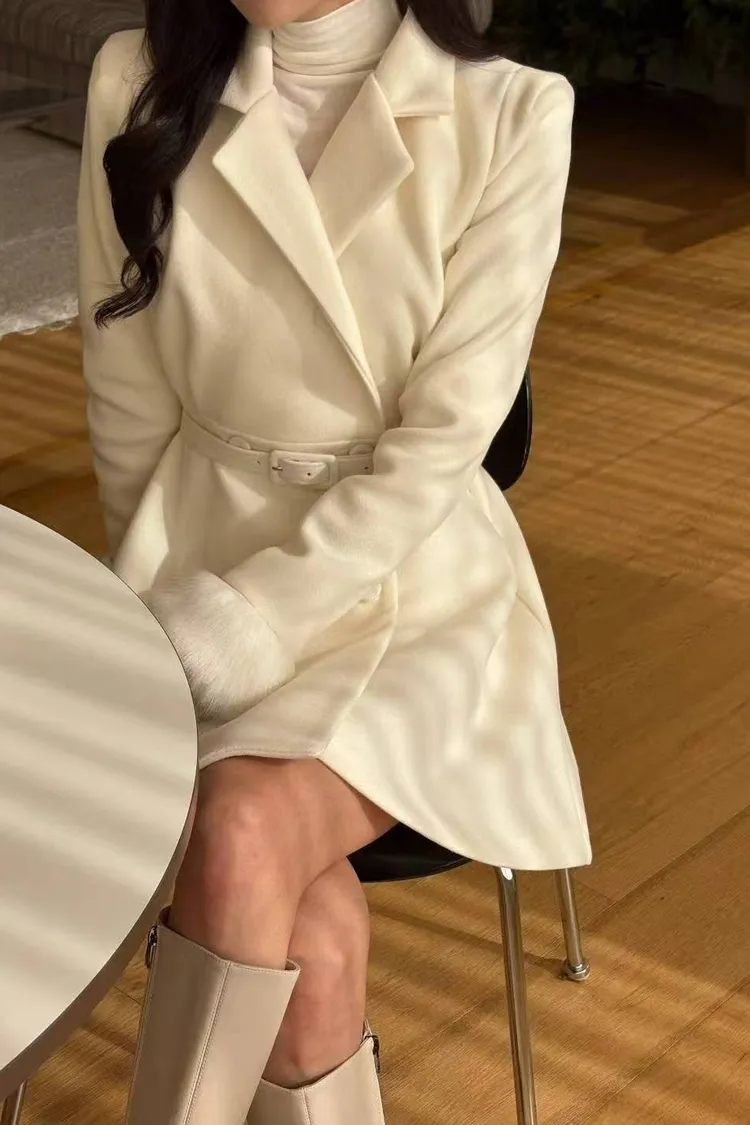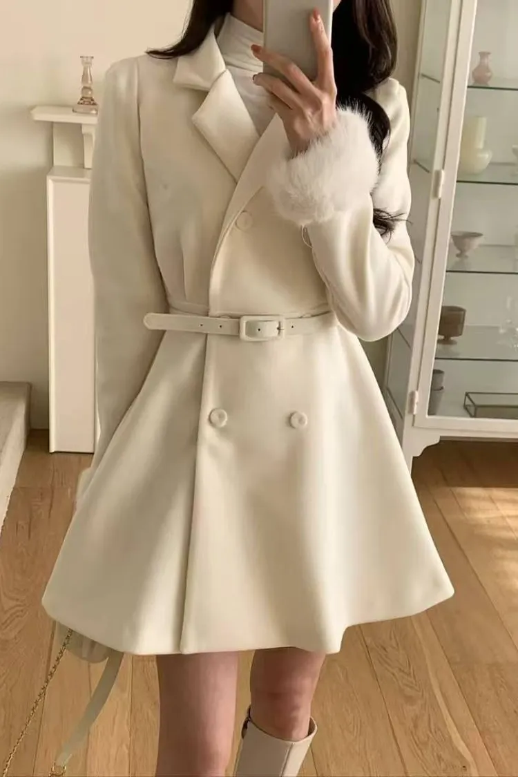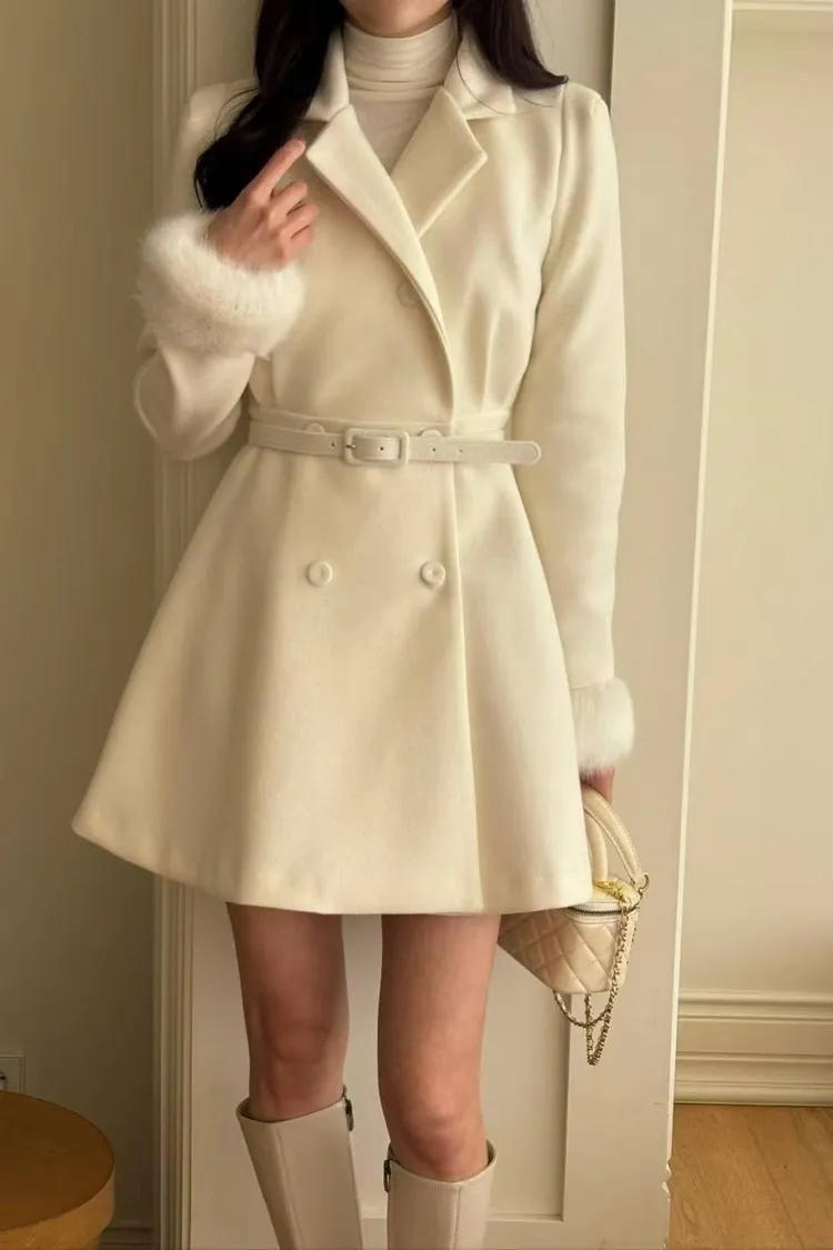 韓國代購 雙排扣V領腰帶毛毛袖口短大衣