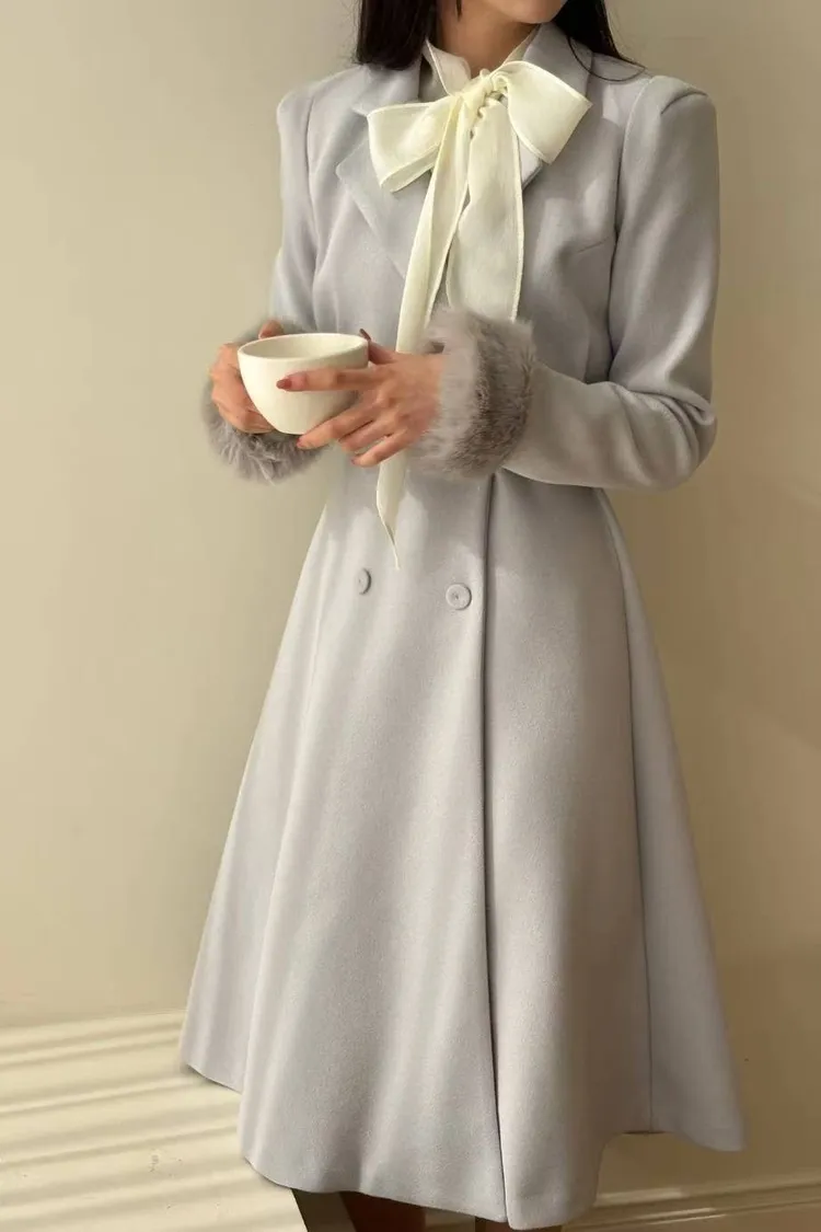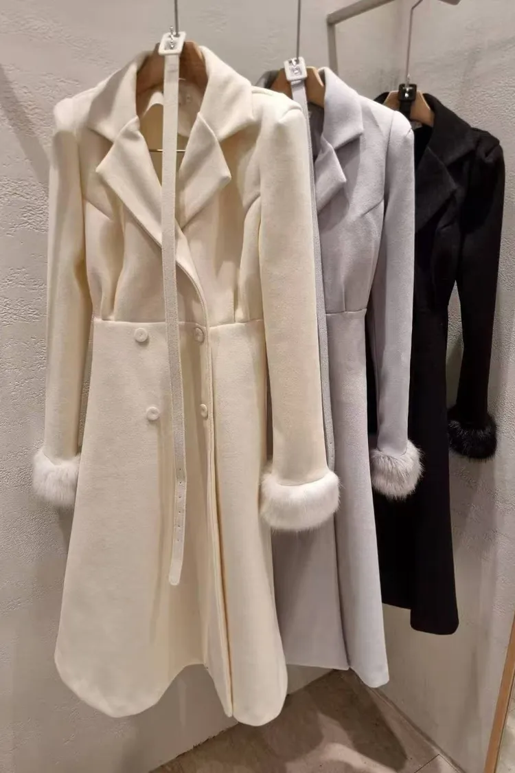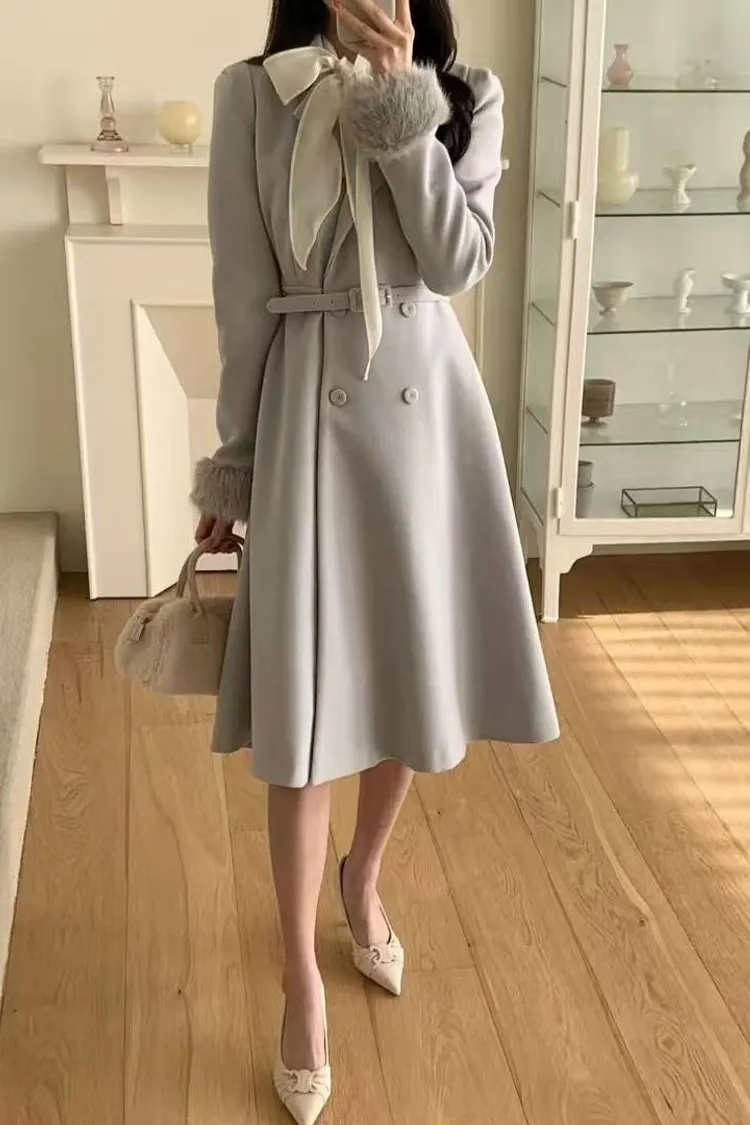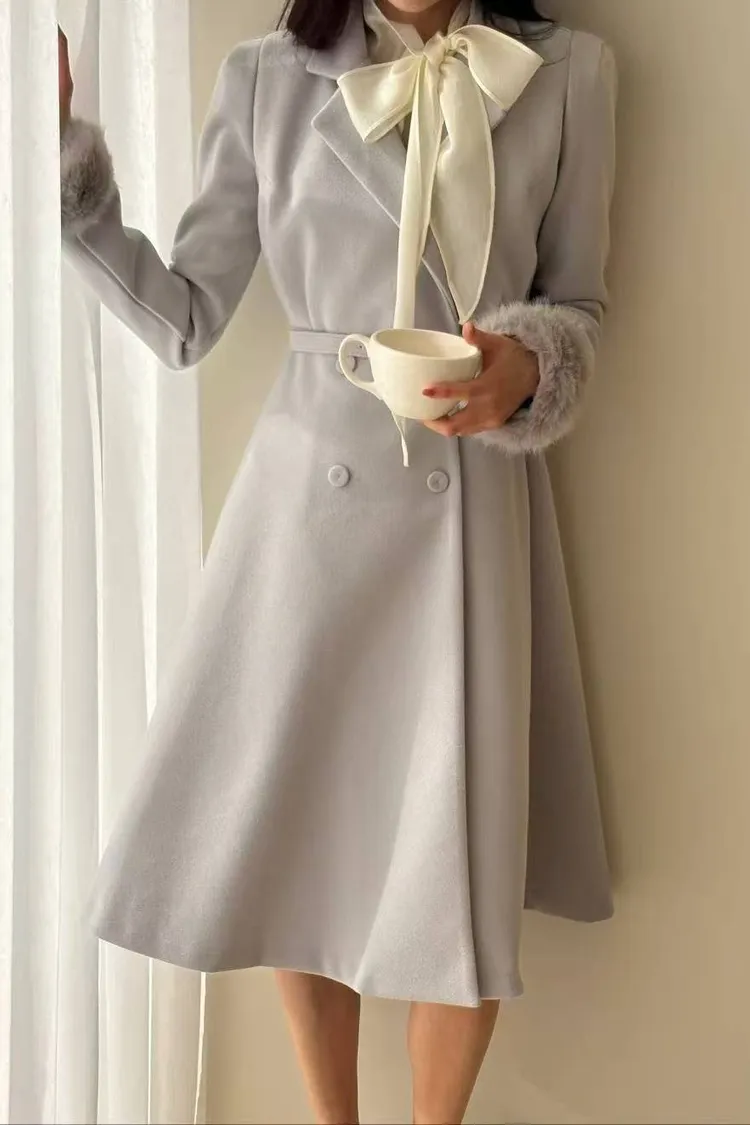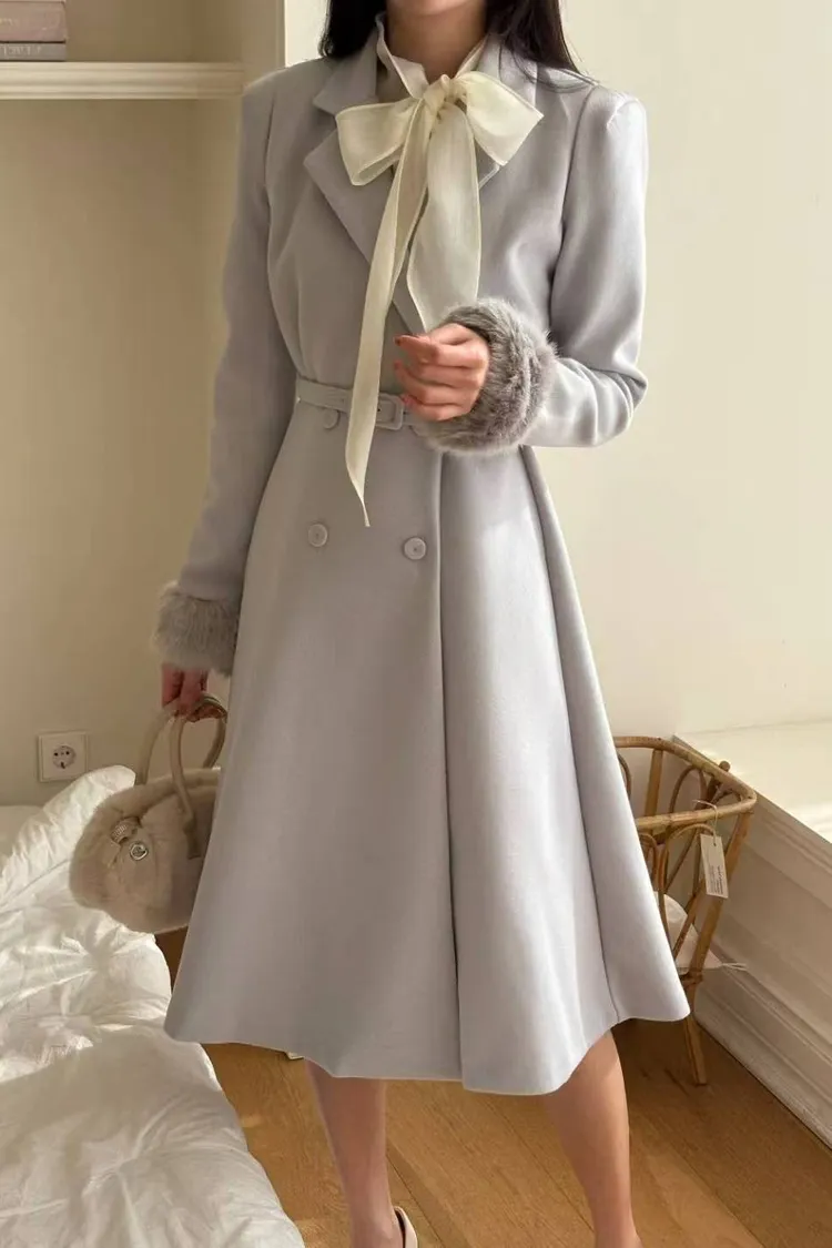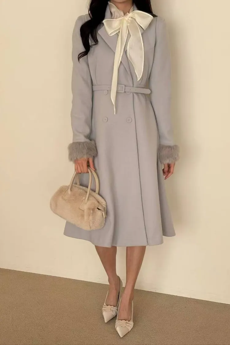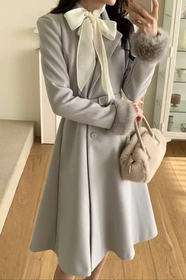 韓國代購 長版毛毛袖腰帶長大衣