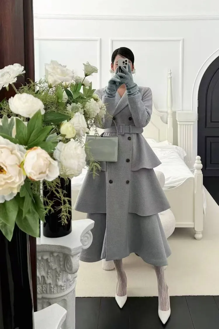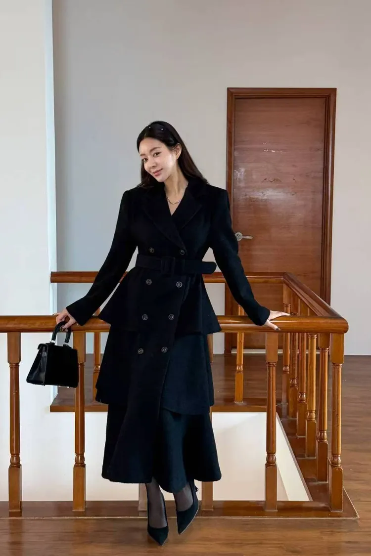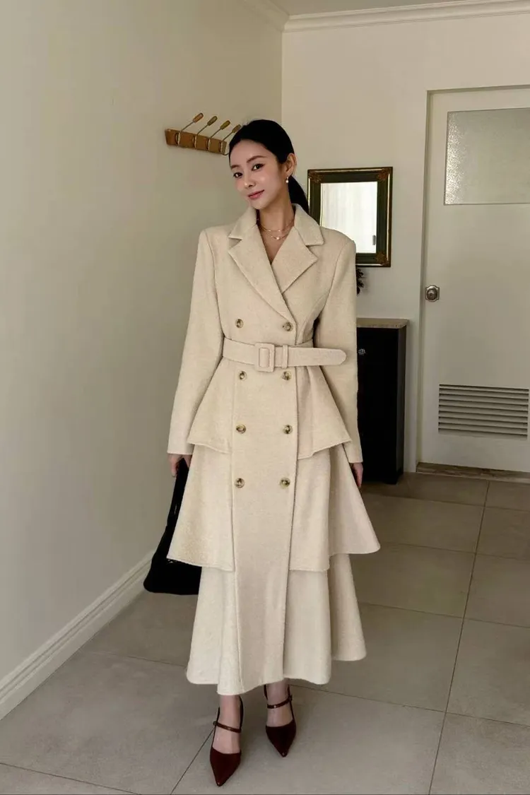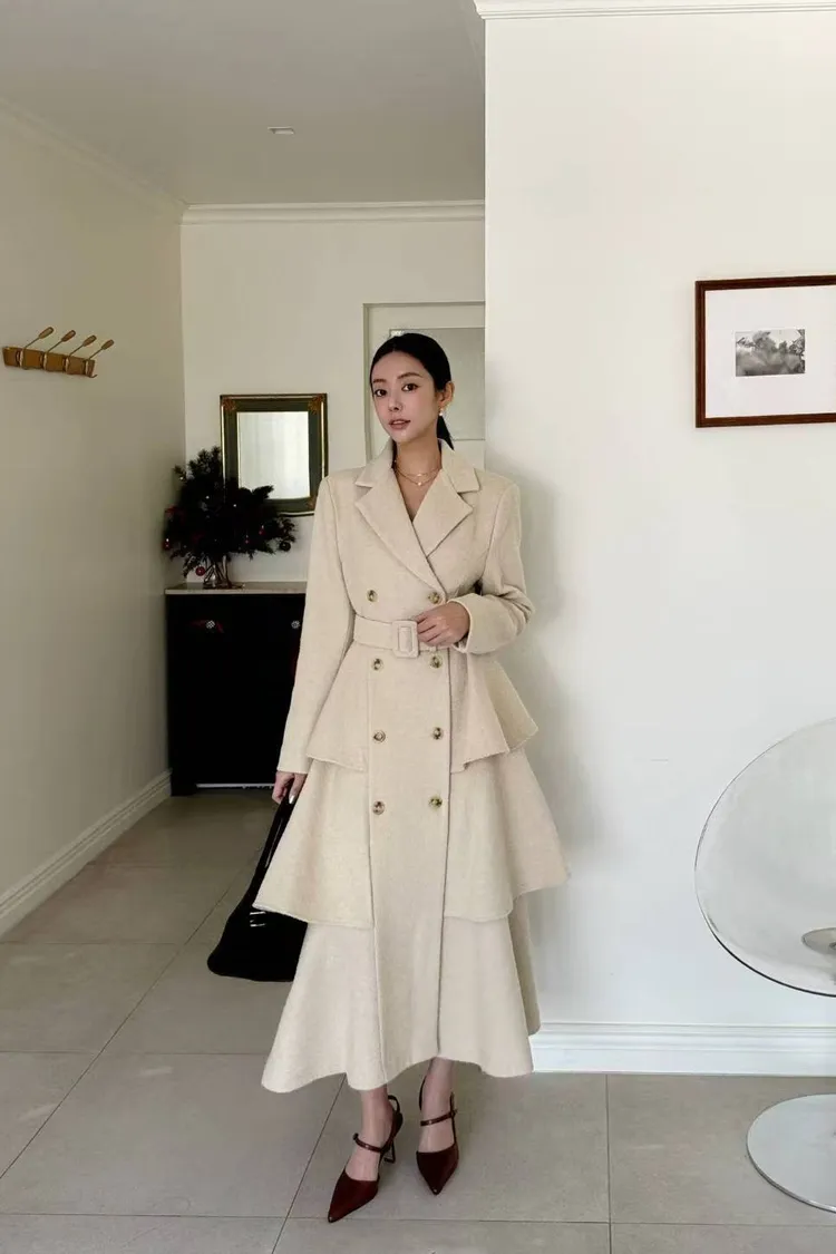 韓國代購 50%羊毛層次裙擺雙排扣大衣