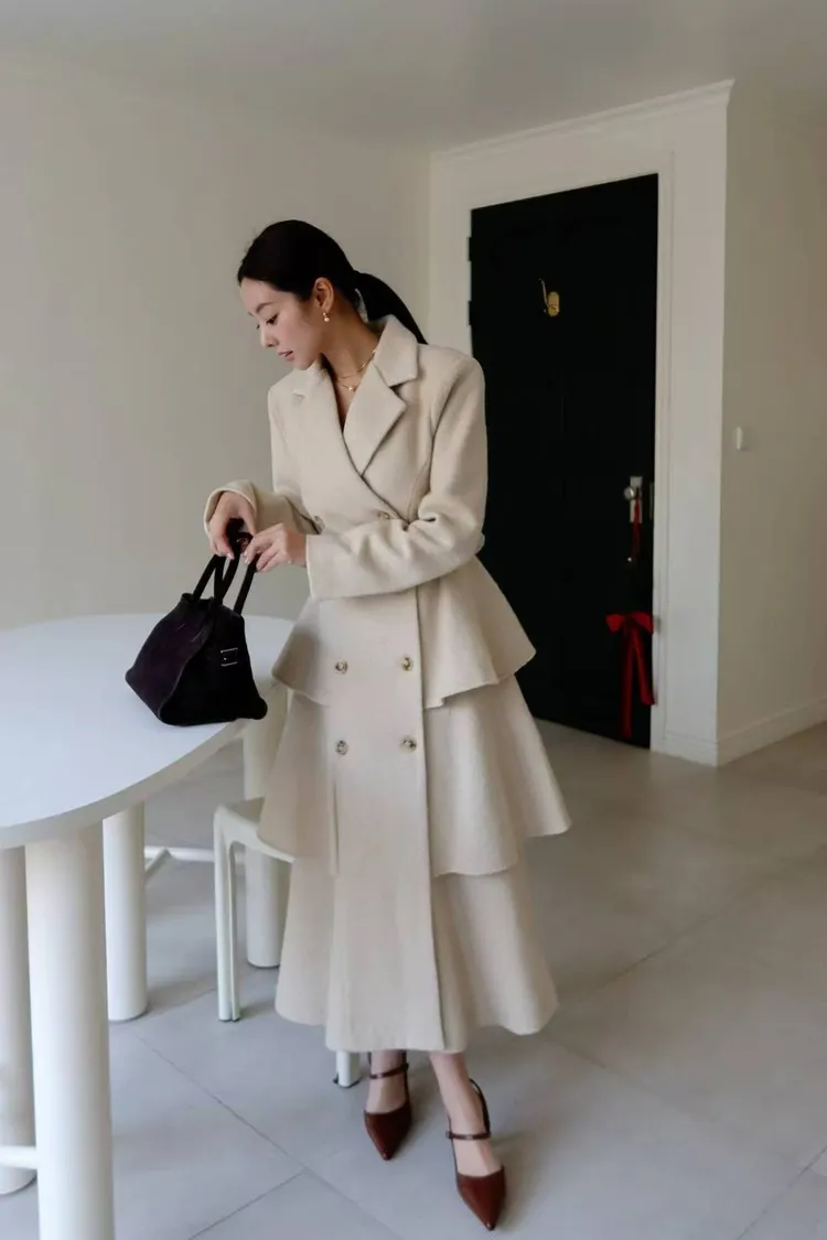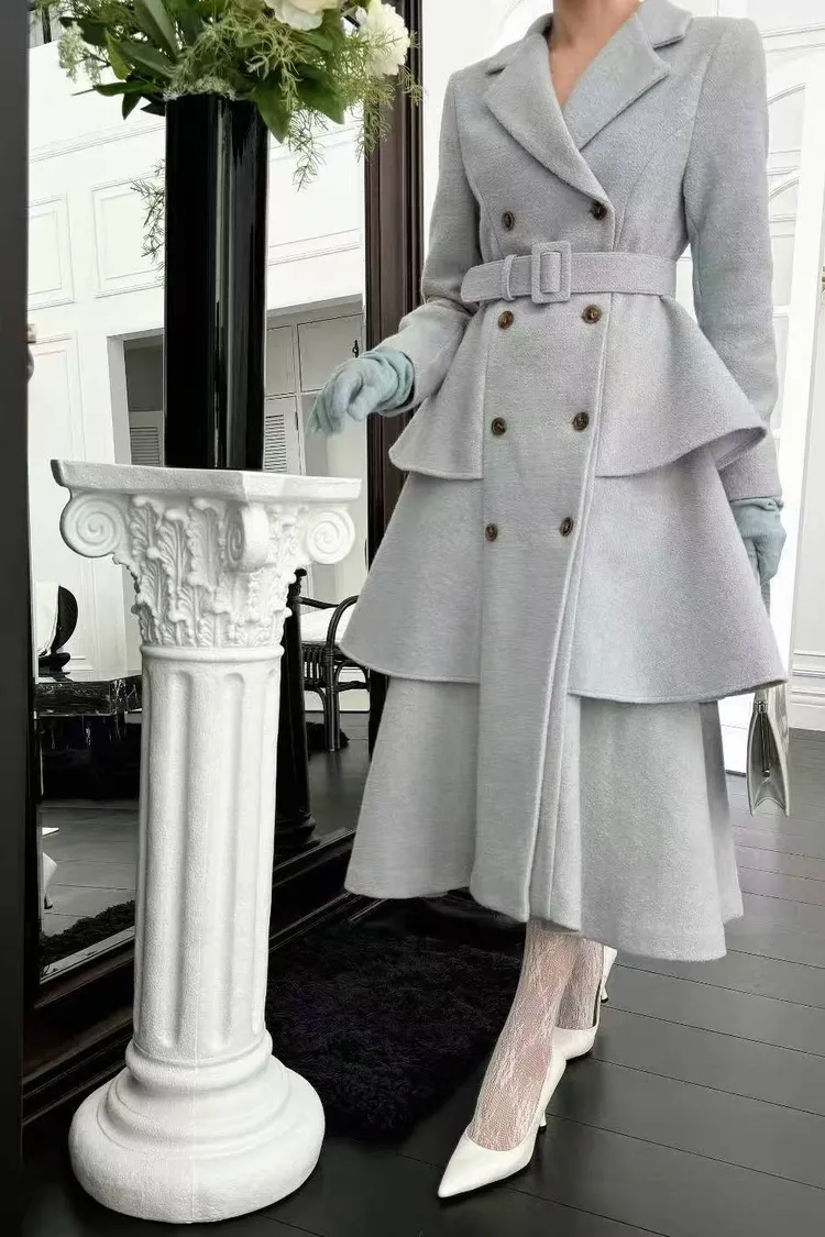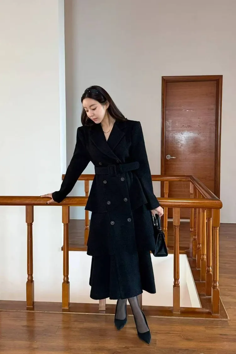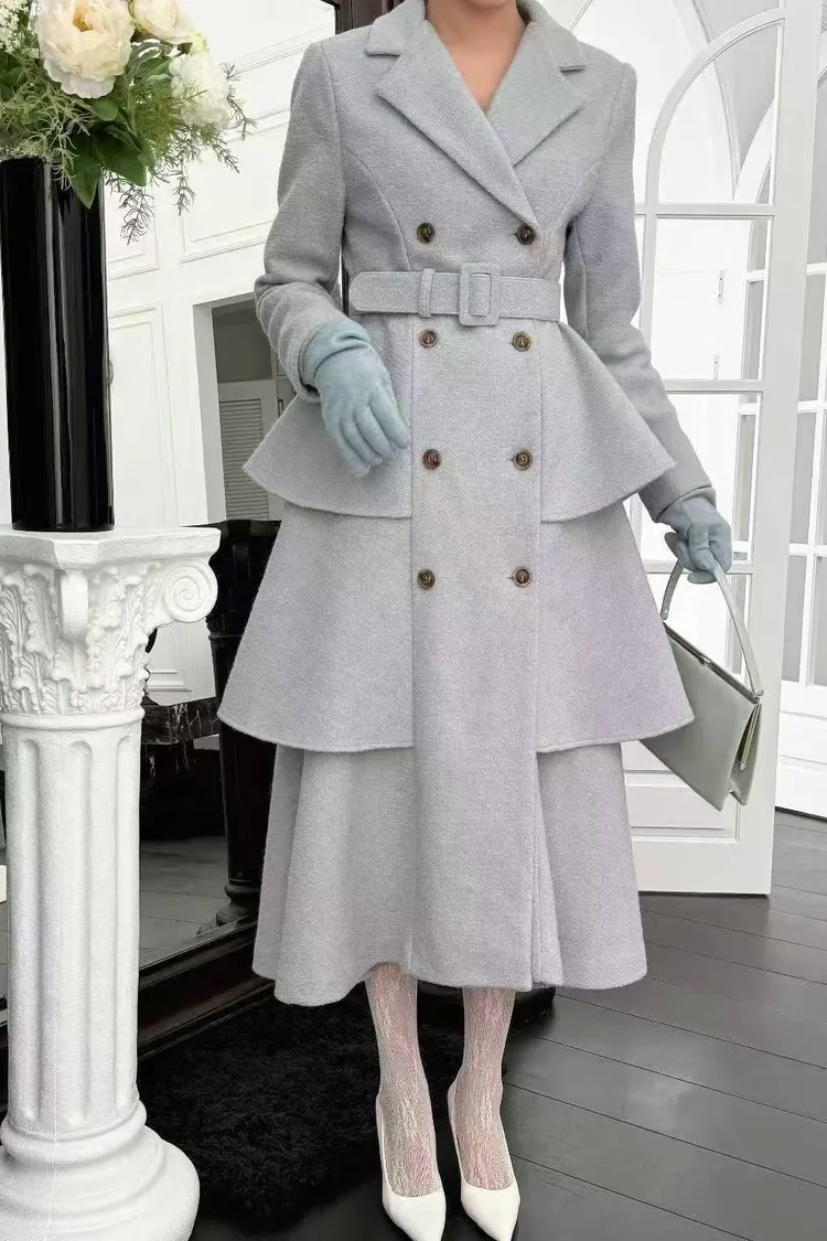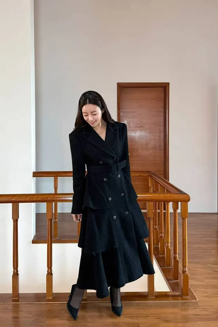 韓國代購 50%羊毛層次裙擺雙排扣大衣
