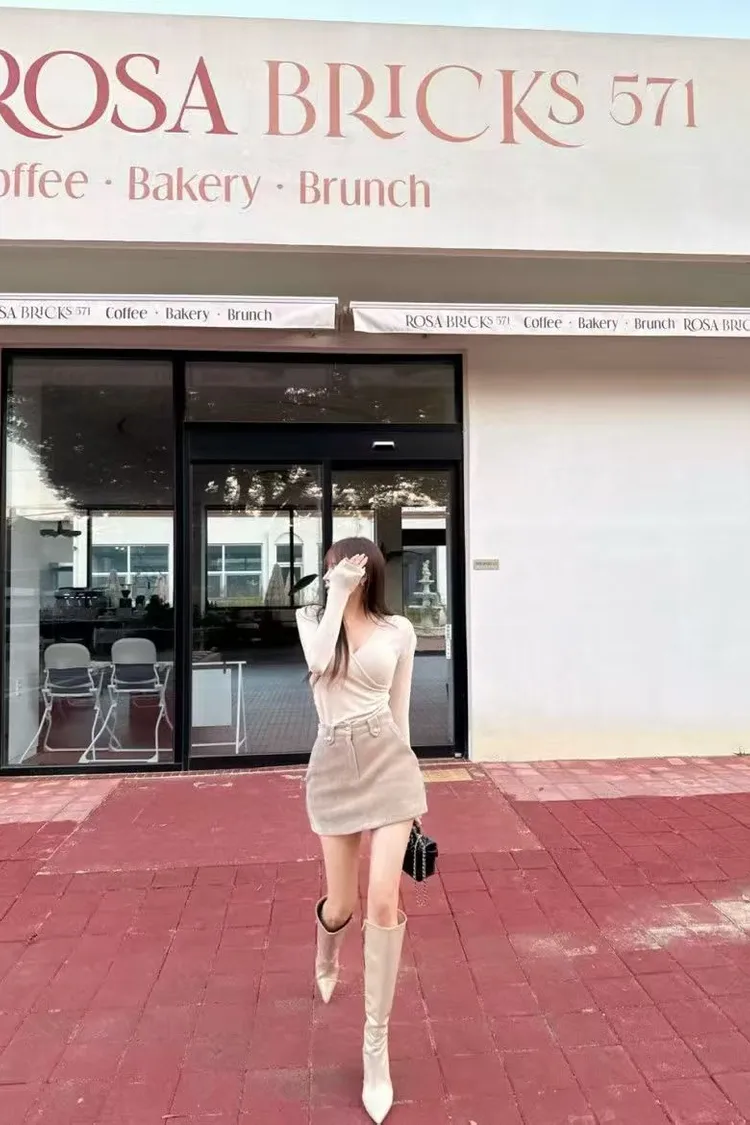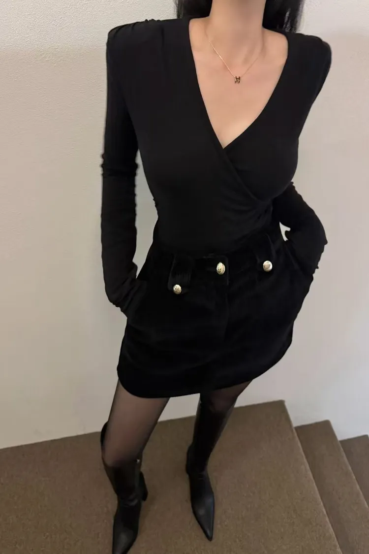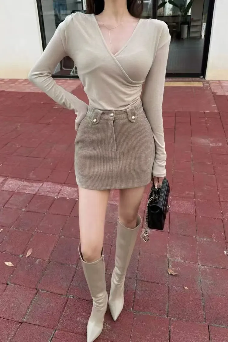 韓國代購 性感V領素T&條紋短裙