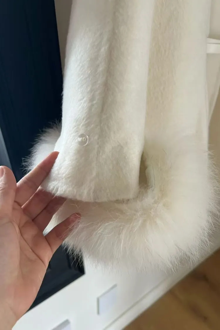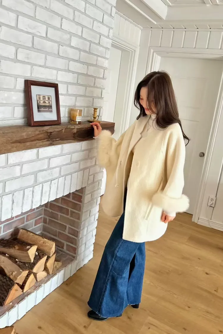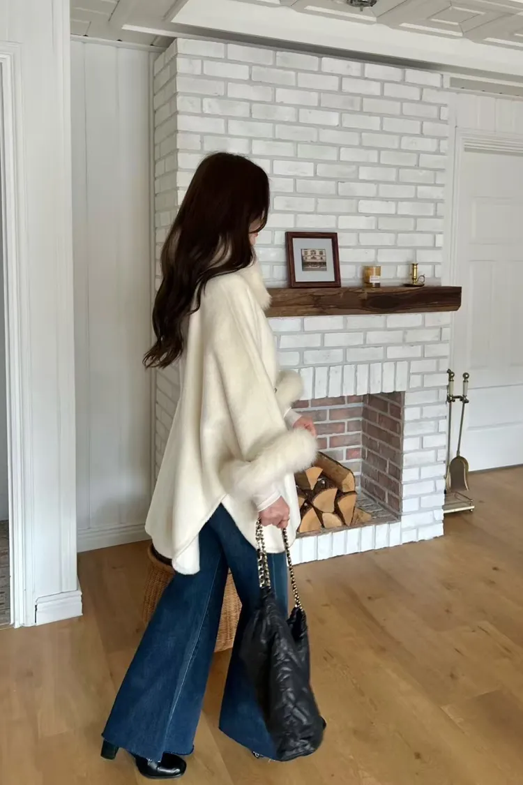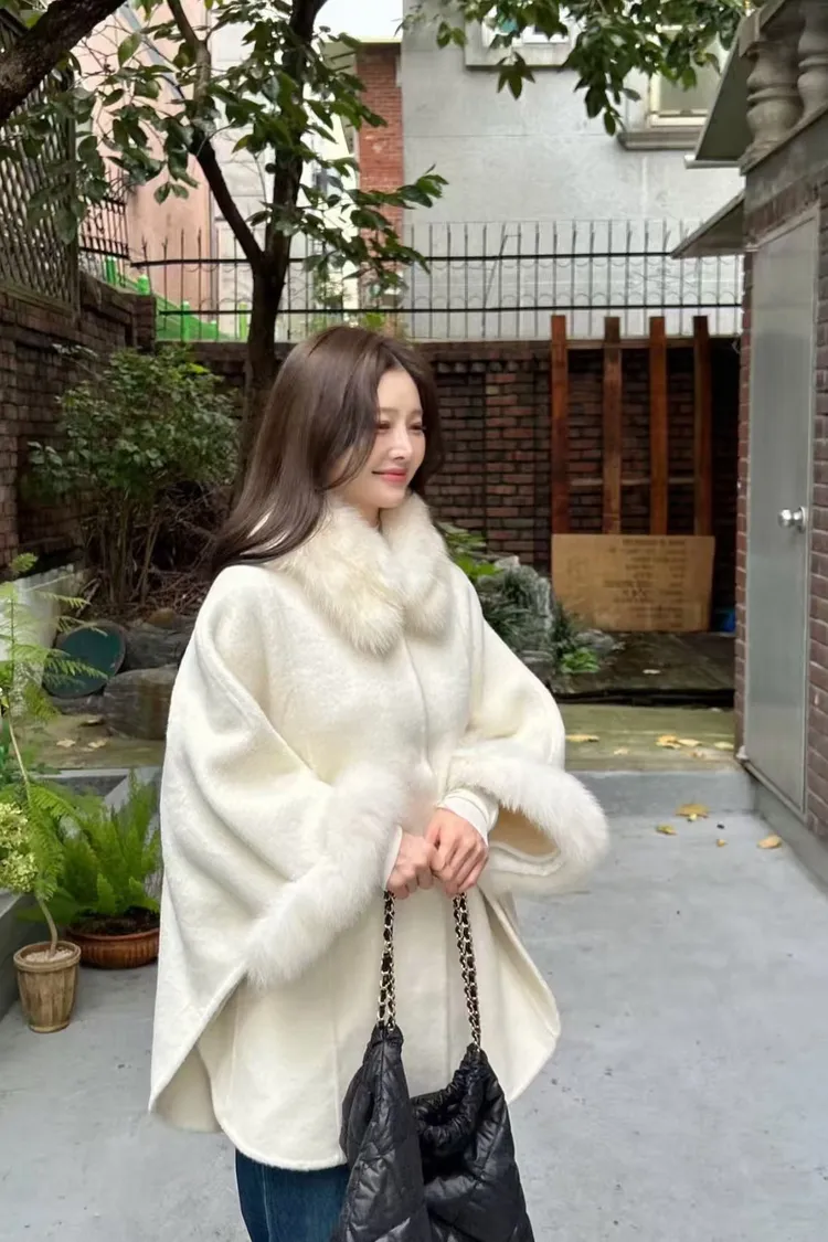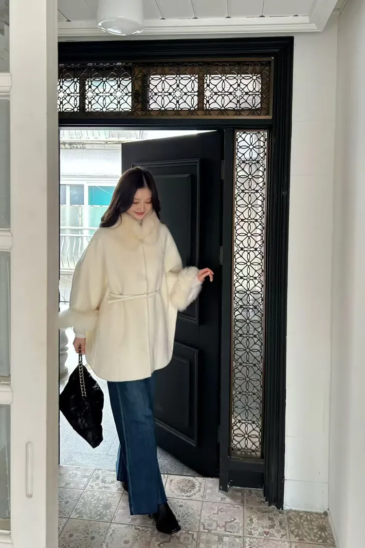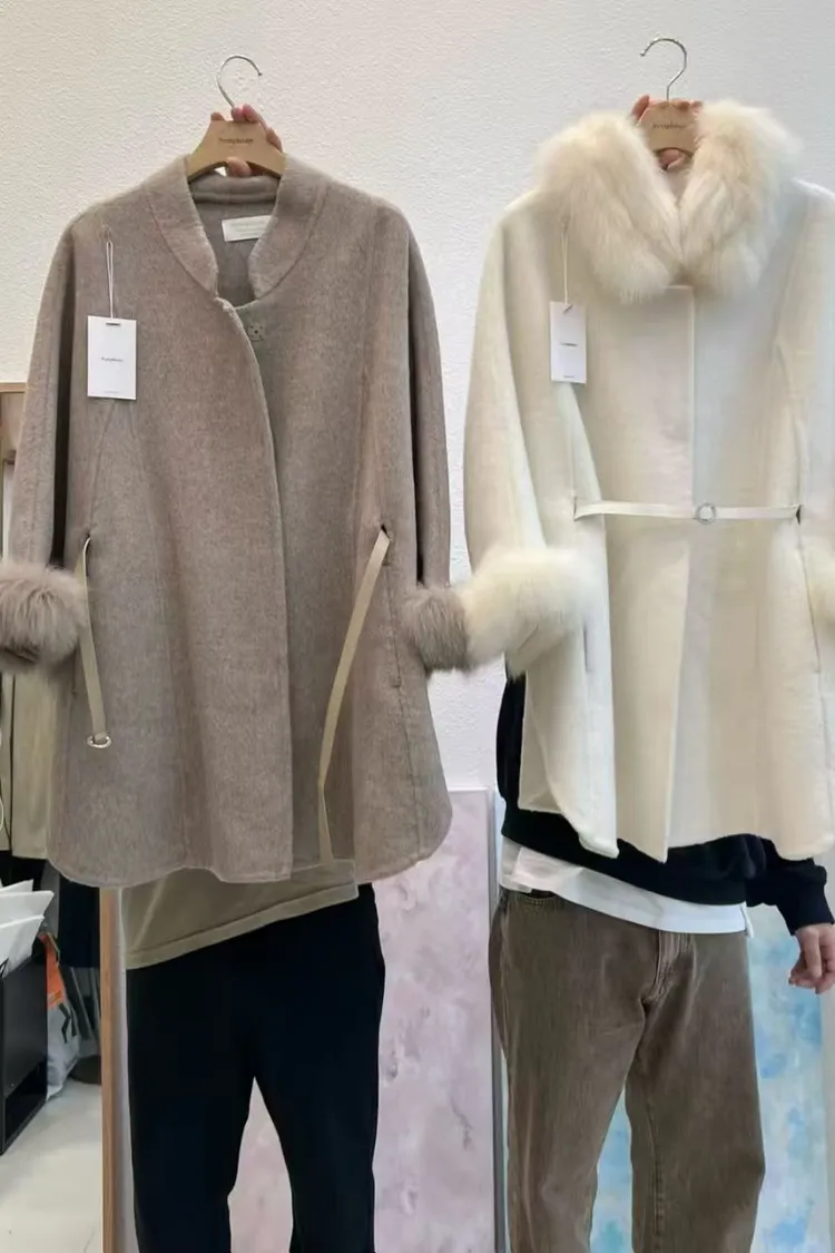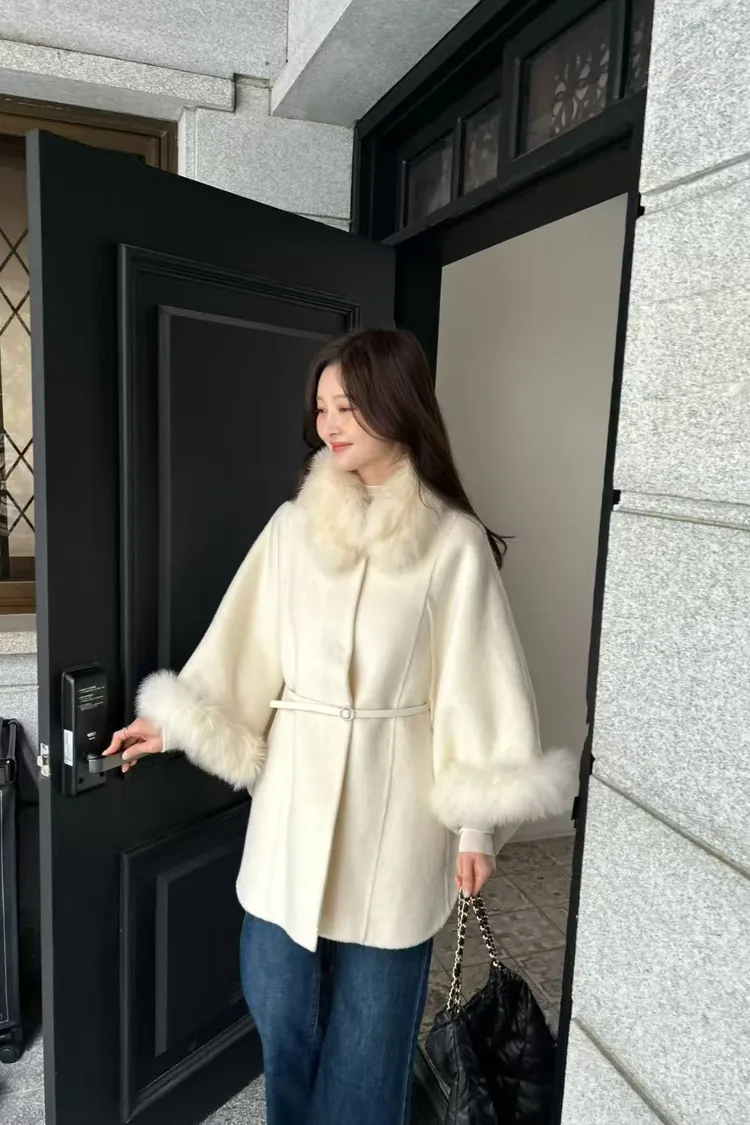 韓國代購 羊毛&狐狸毛腰帶斗篷