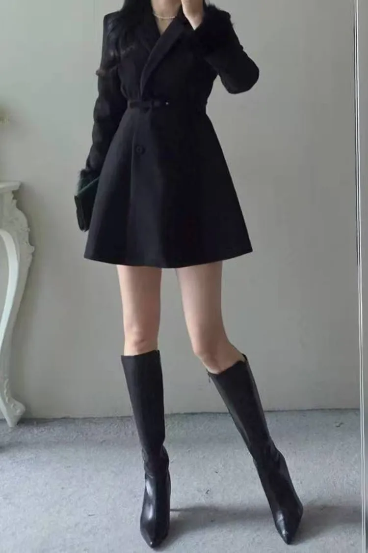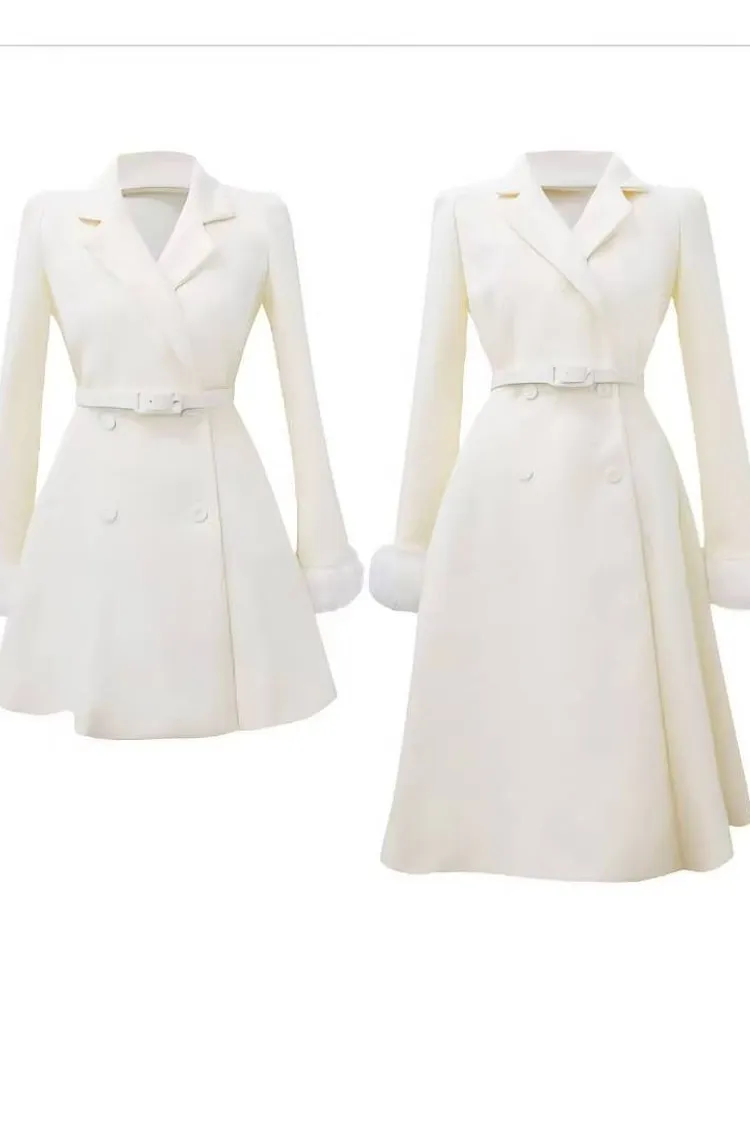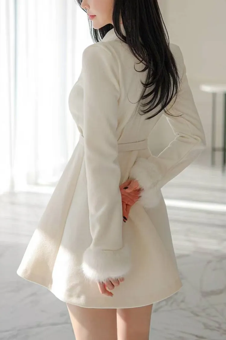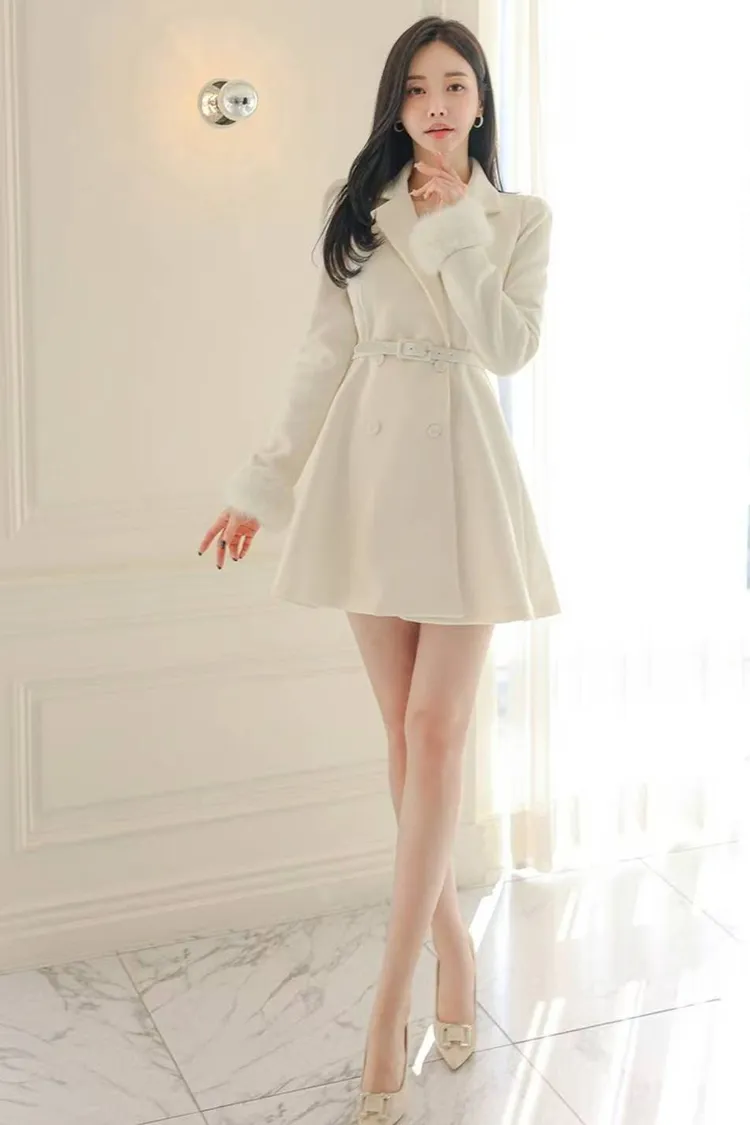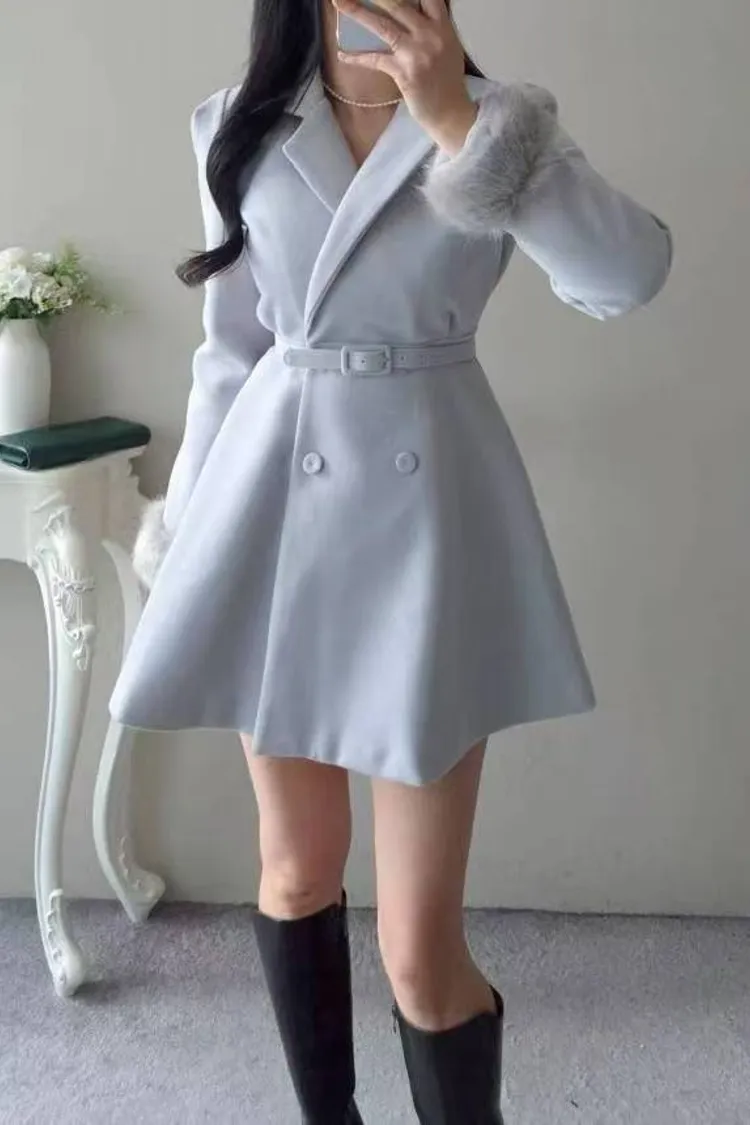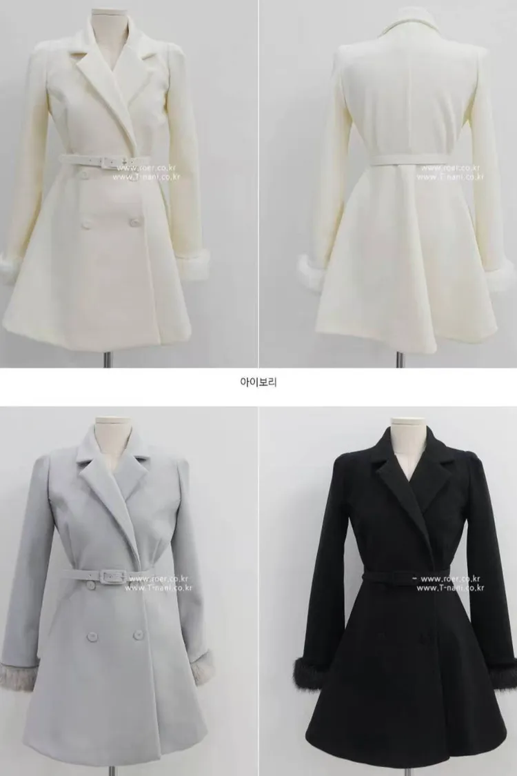 韓國代購 雙排扣腰帶毛毛袖大衣 短版/長版