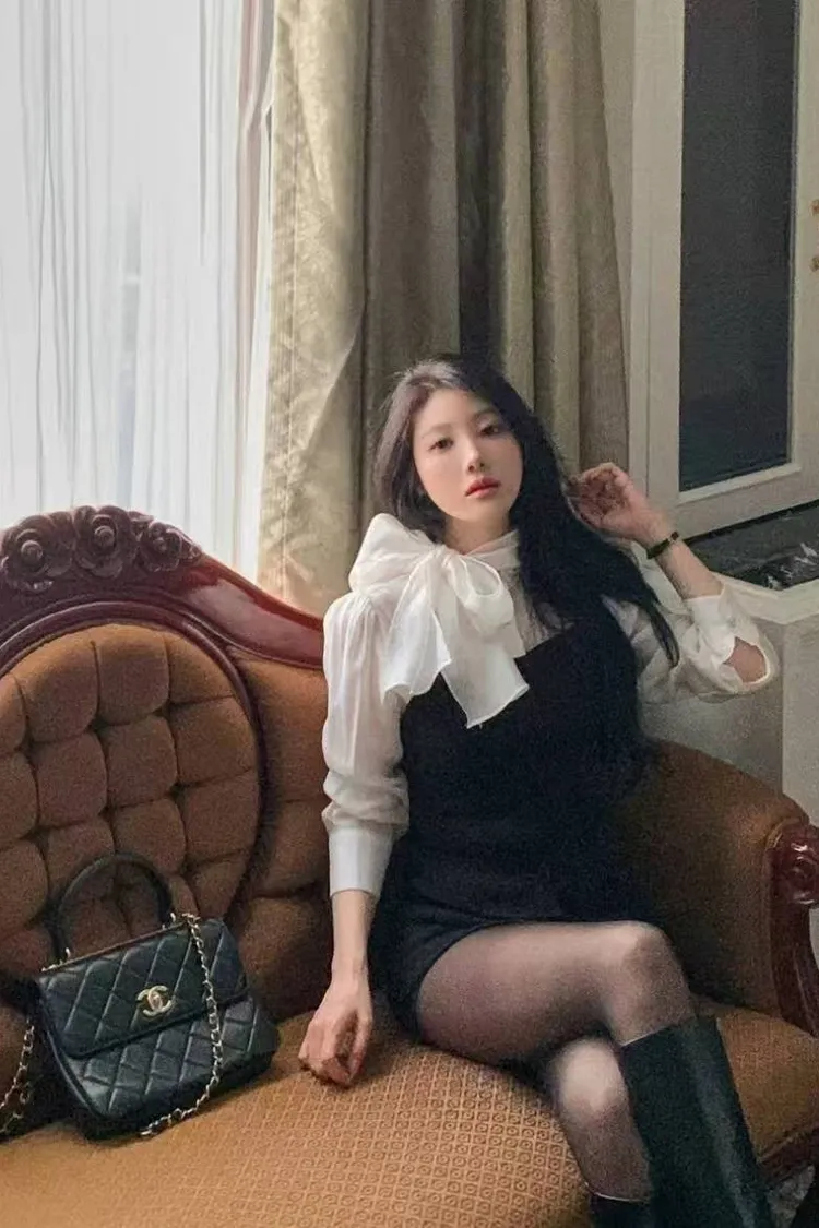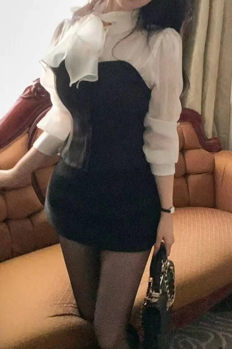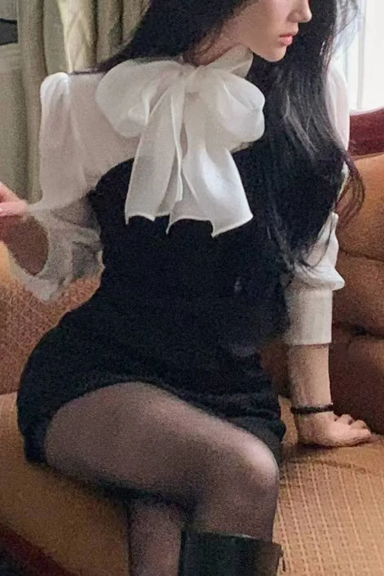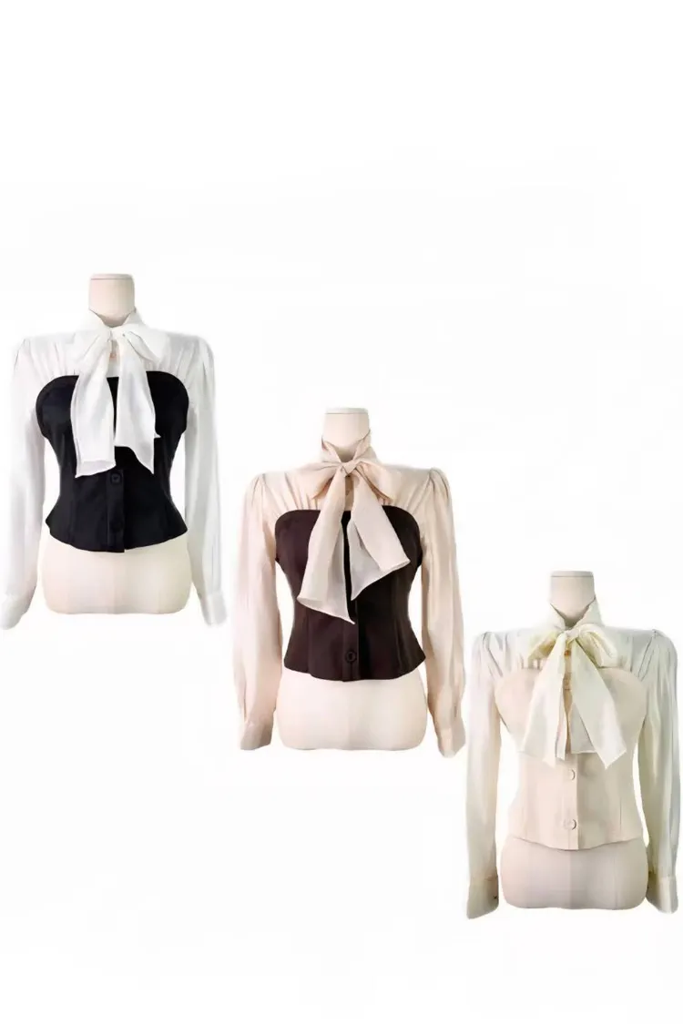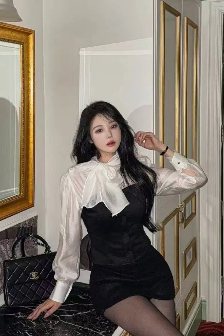 韓國代購 蝴蝶結領假兩件雪紡上衣