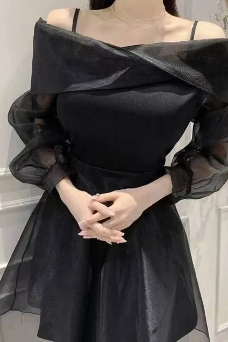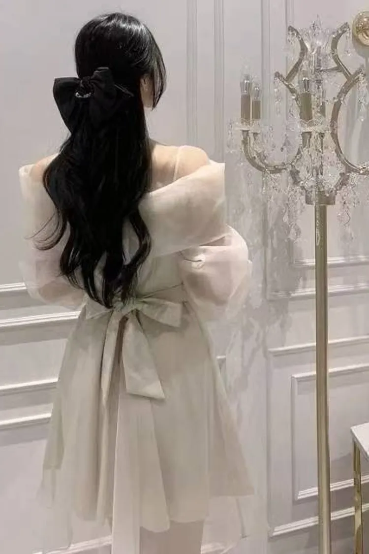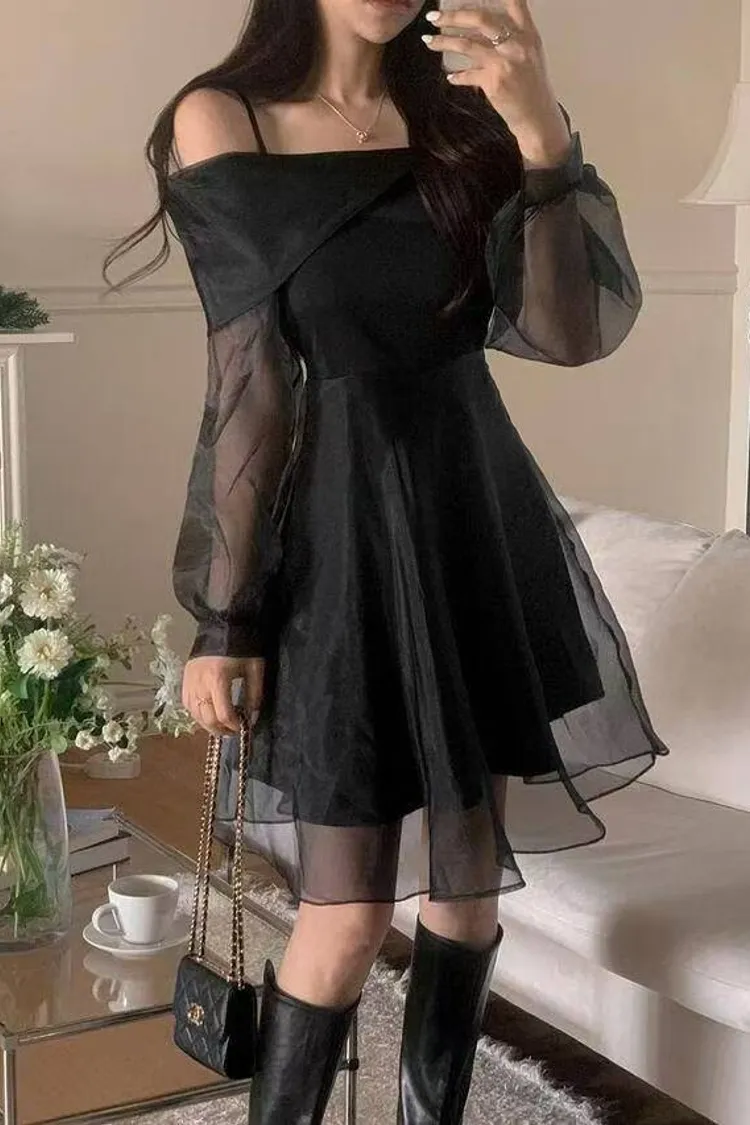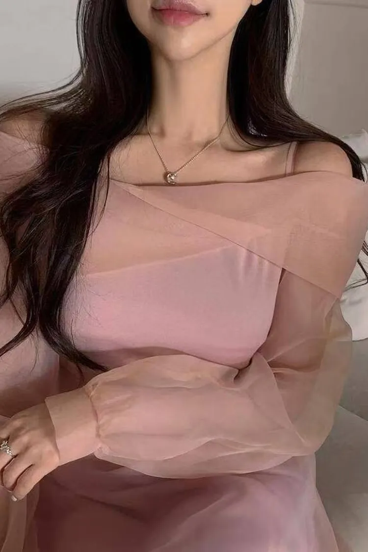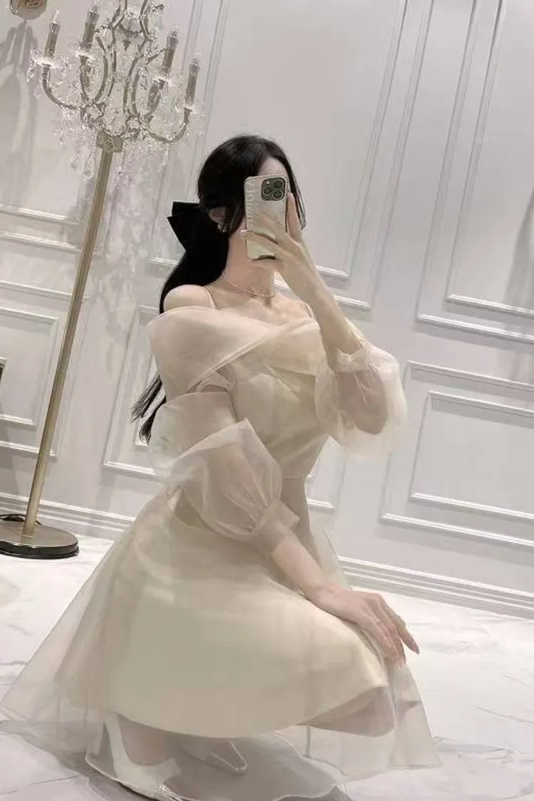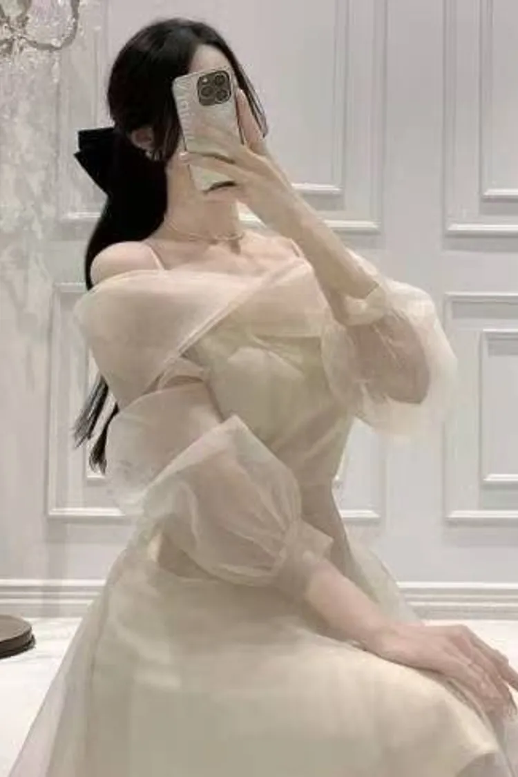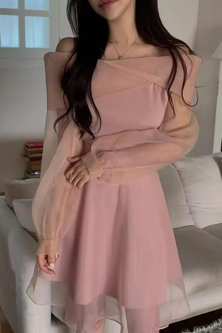 韓國代購 浪漫裸紗露肩洋裝[短版]