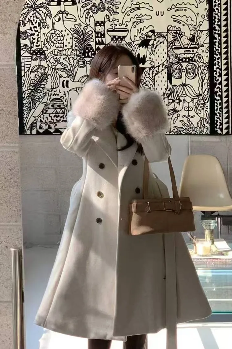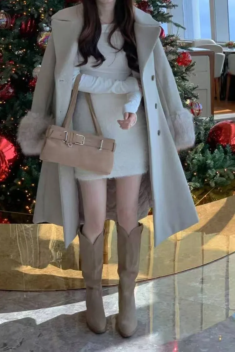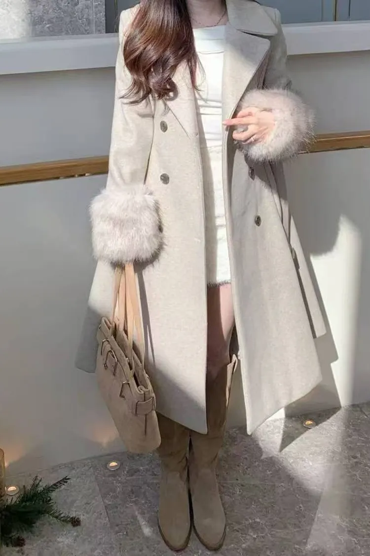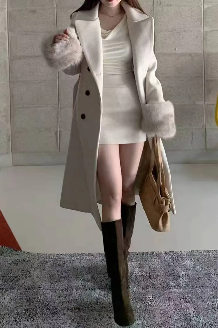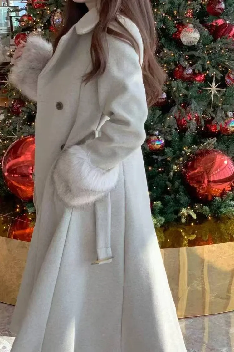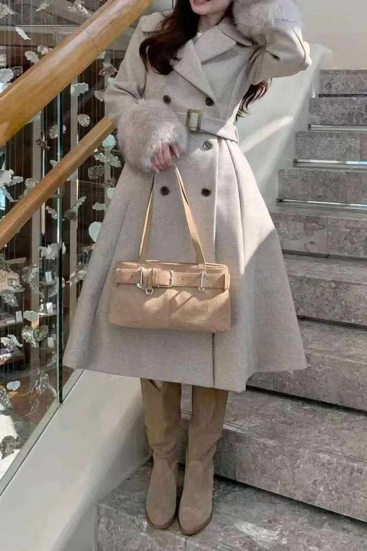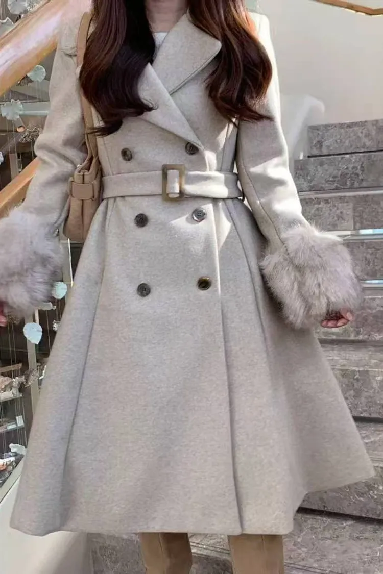 韓國代購 V領毛毛袖腰帶大衣