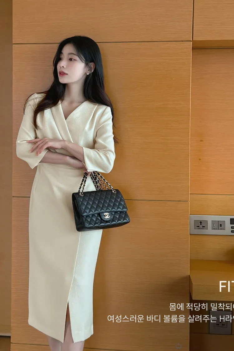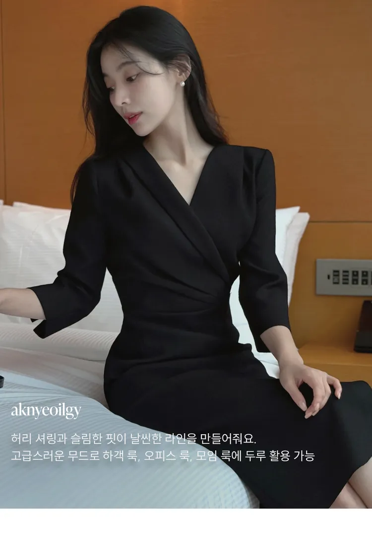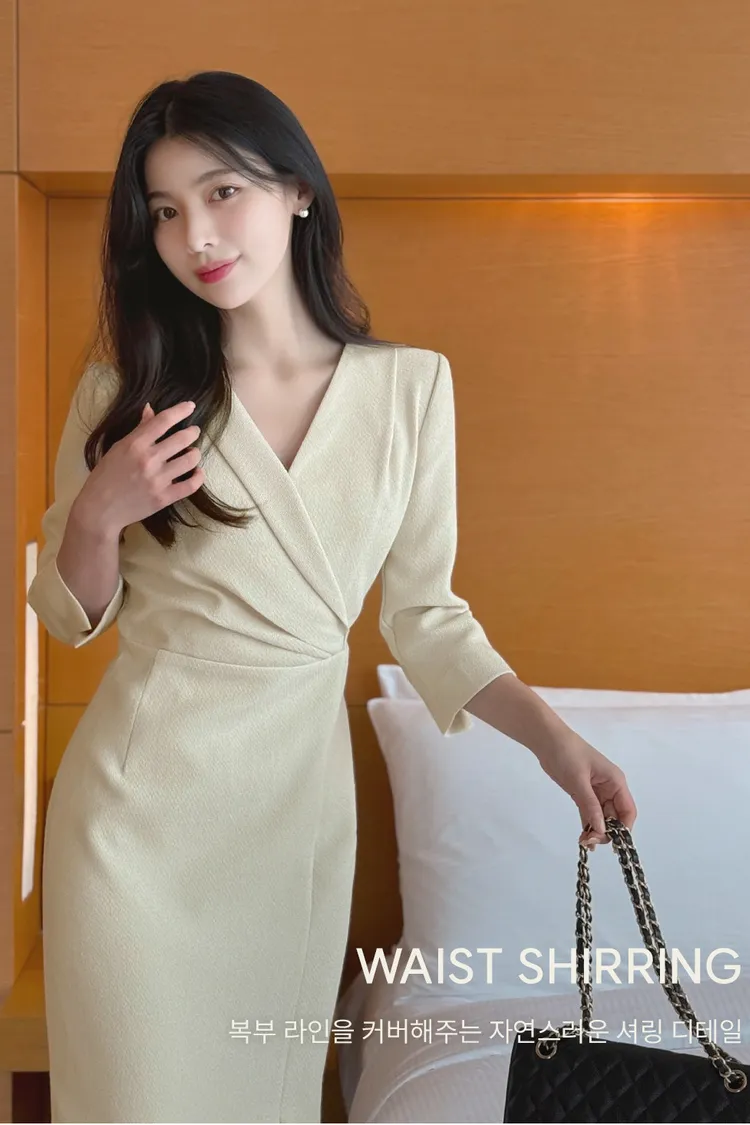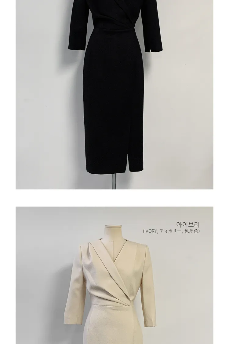 韓國代購 V斜領抓皺修身長洋裝