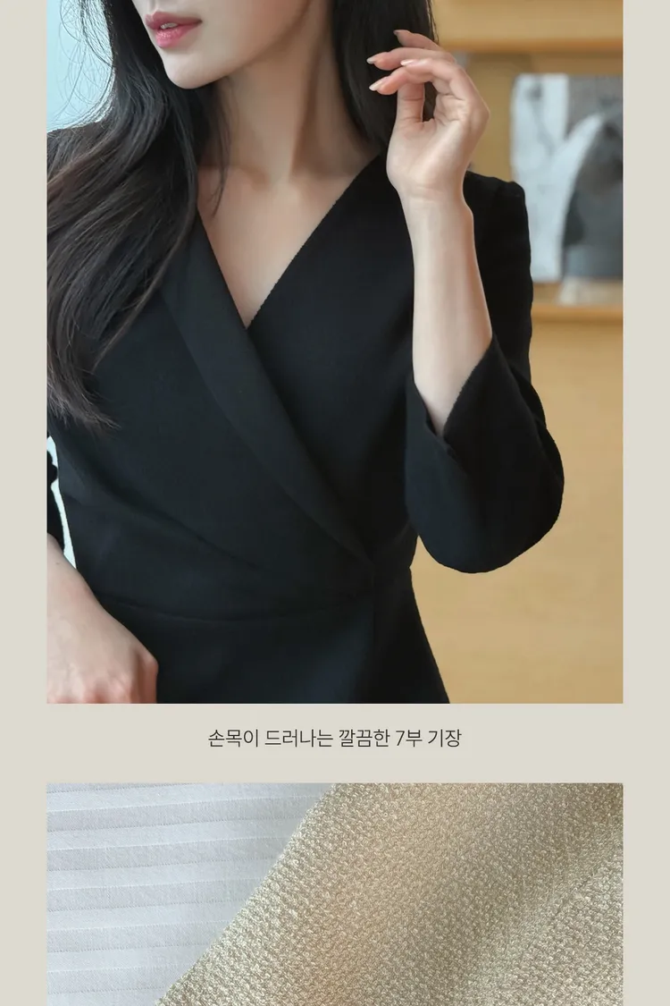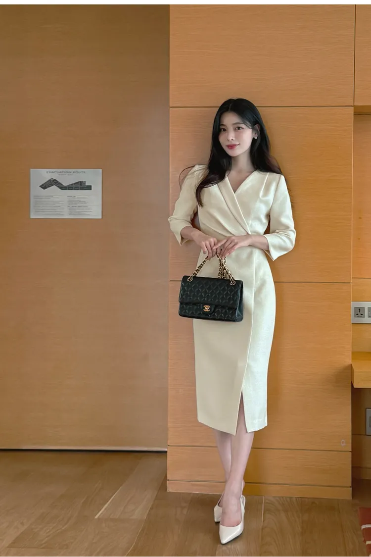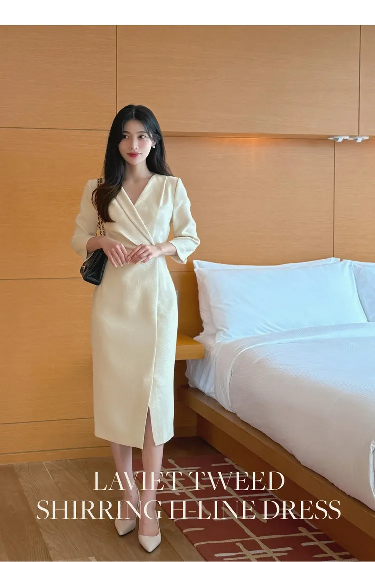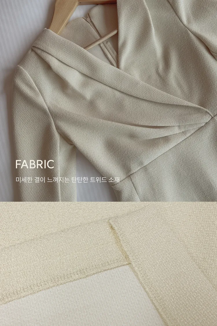 韓國代購 V斜領抓皺修身長洋裝