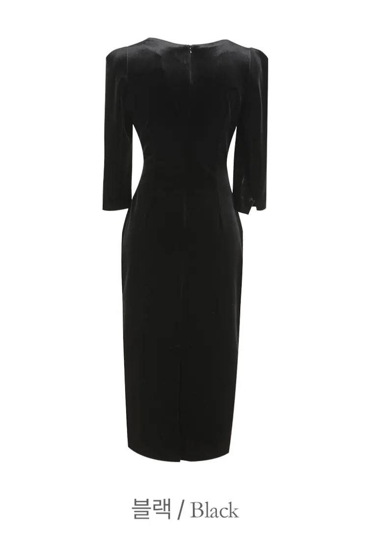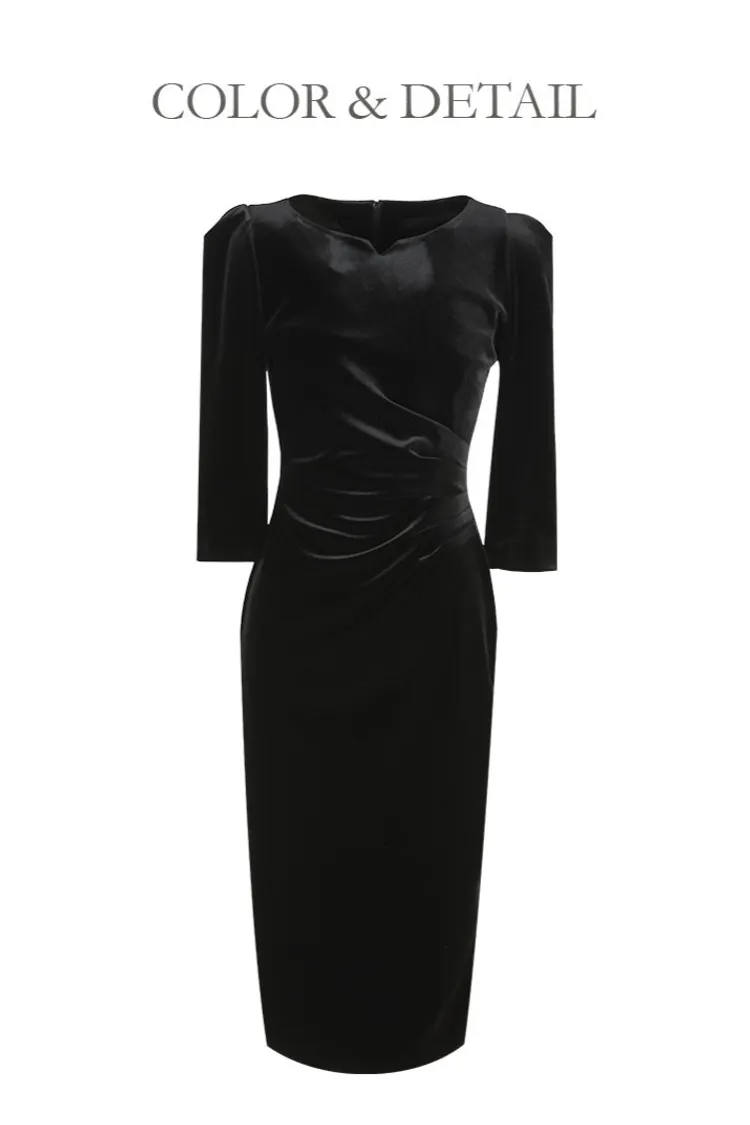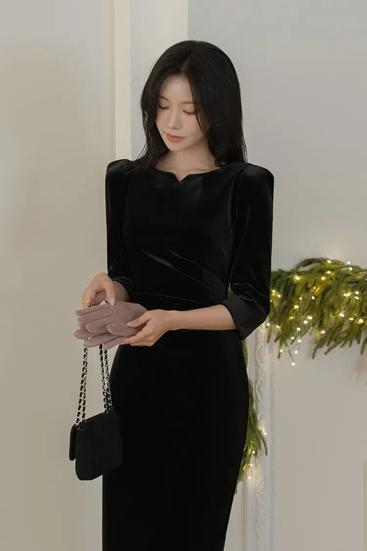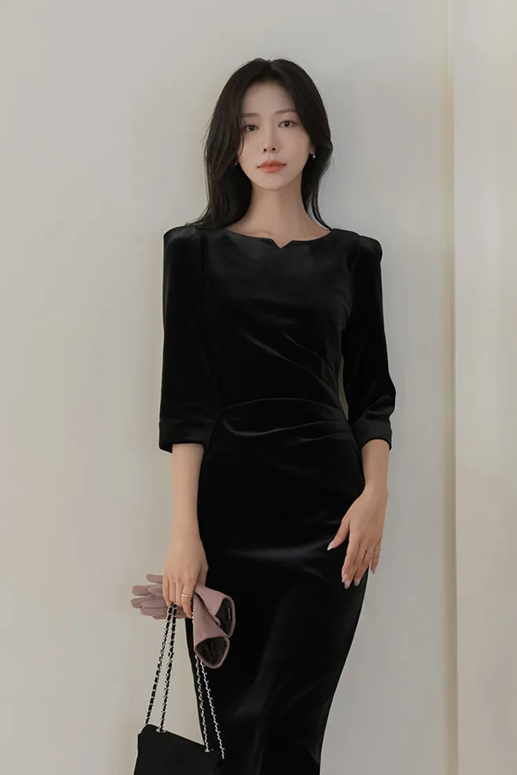 韓國代購 絲絨七分袖H字型褶皺彈性連衣裙
