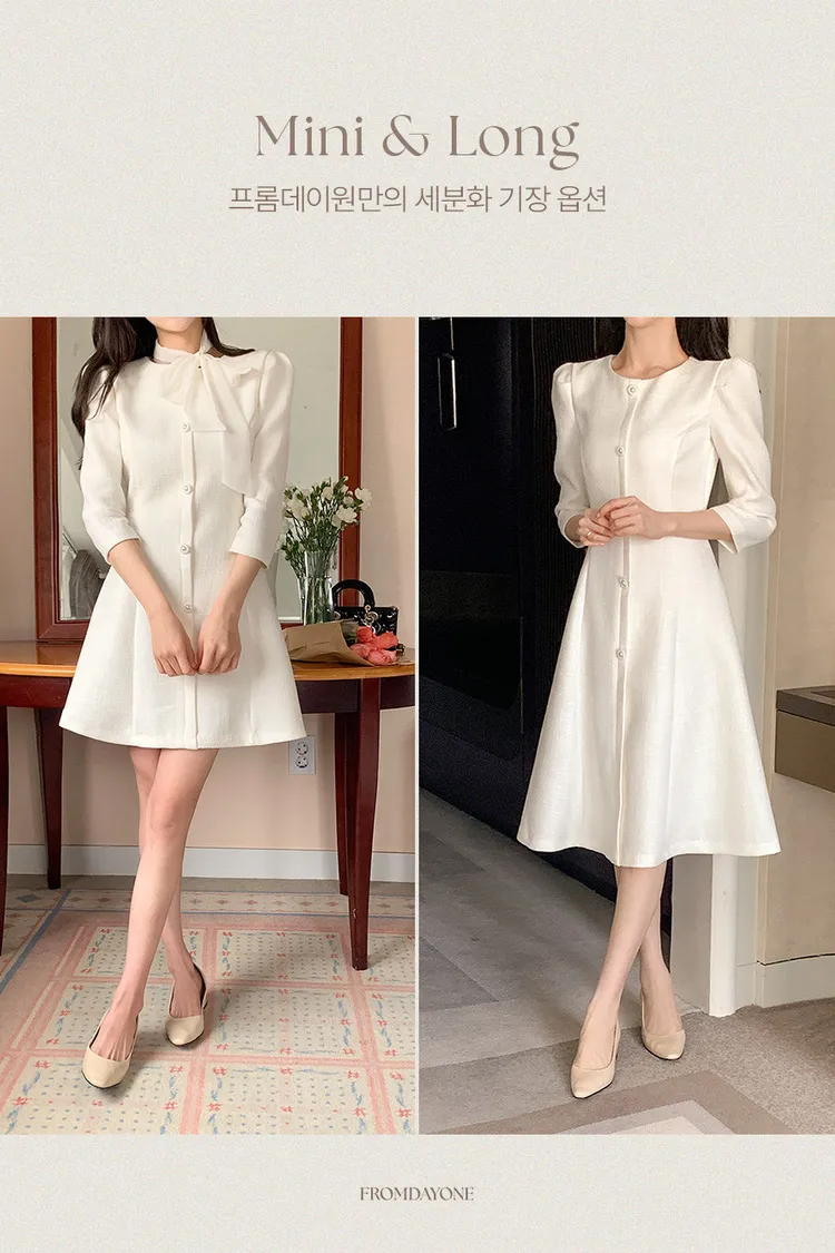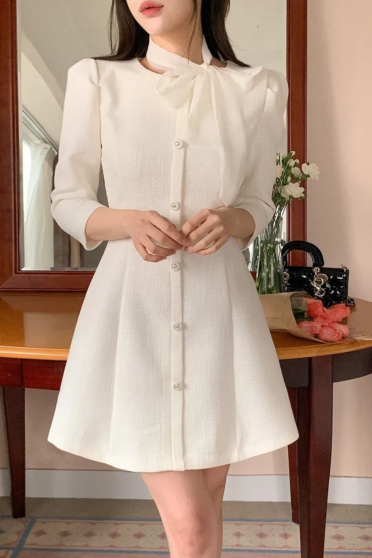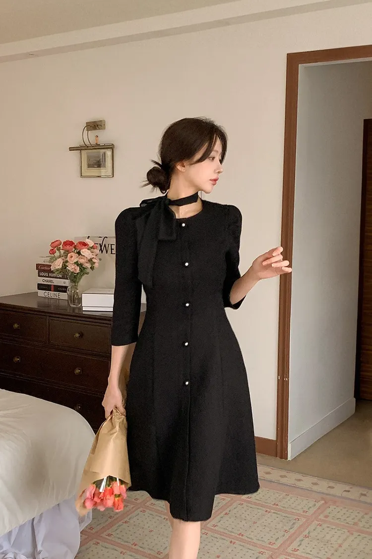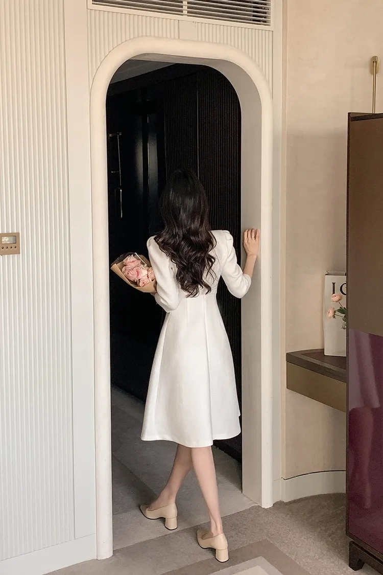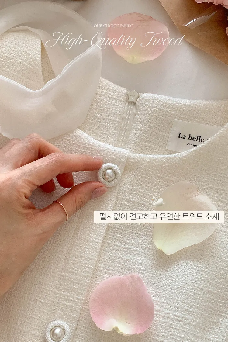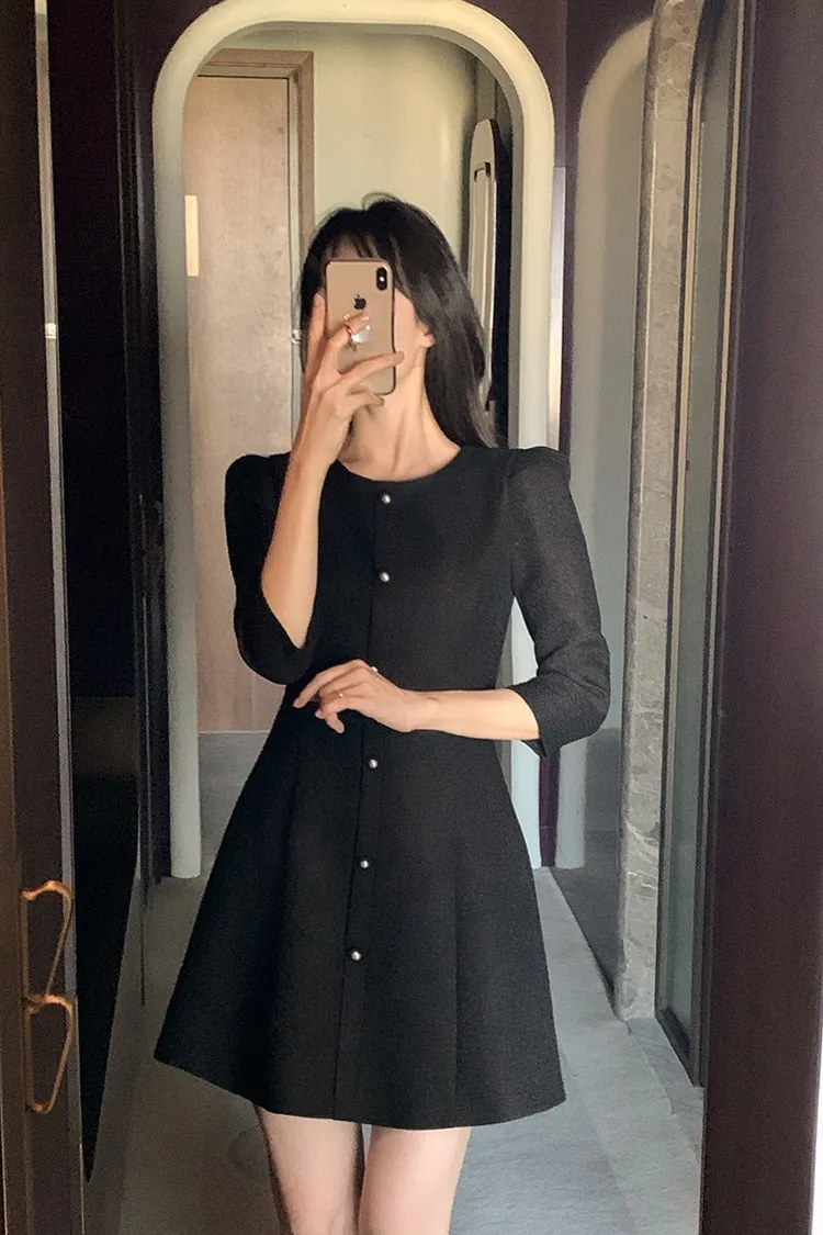 韓國代購 粗毛呢收腰珍珠扣洋裝