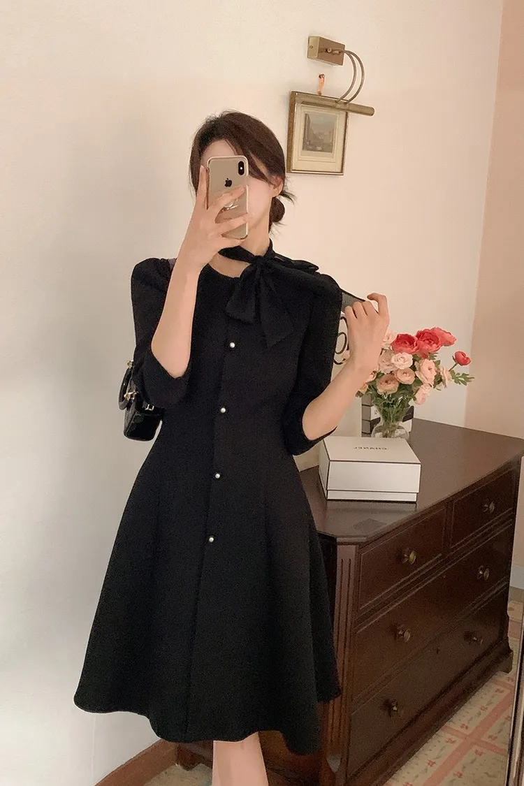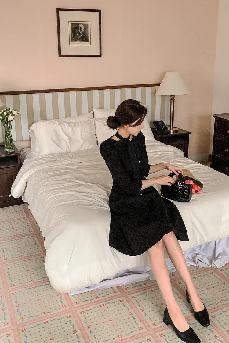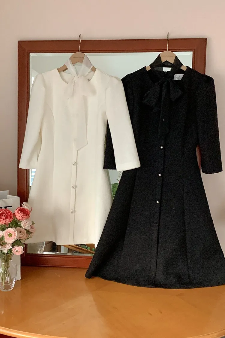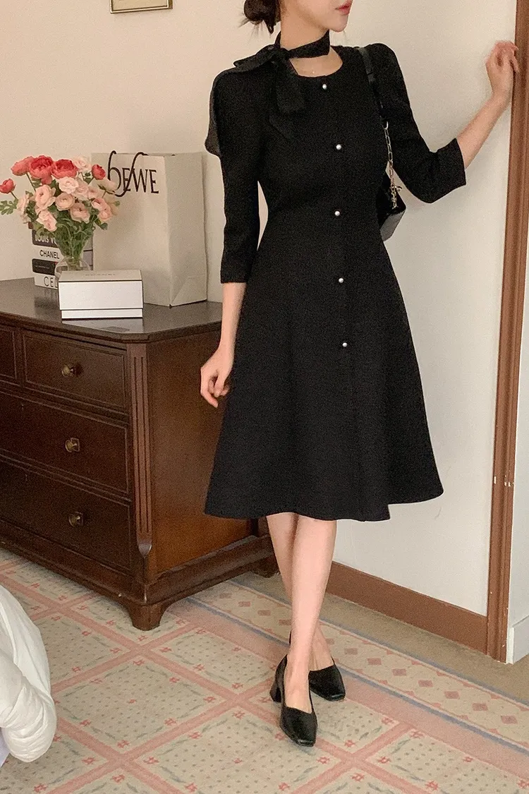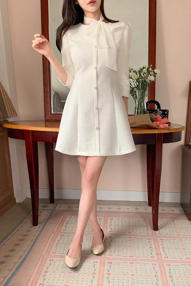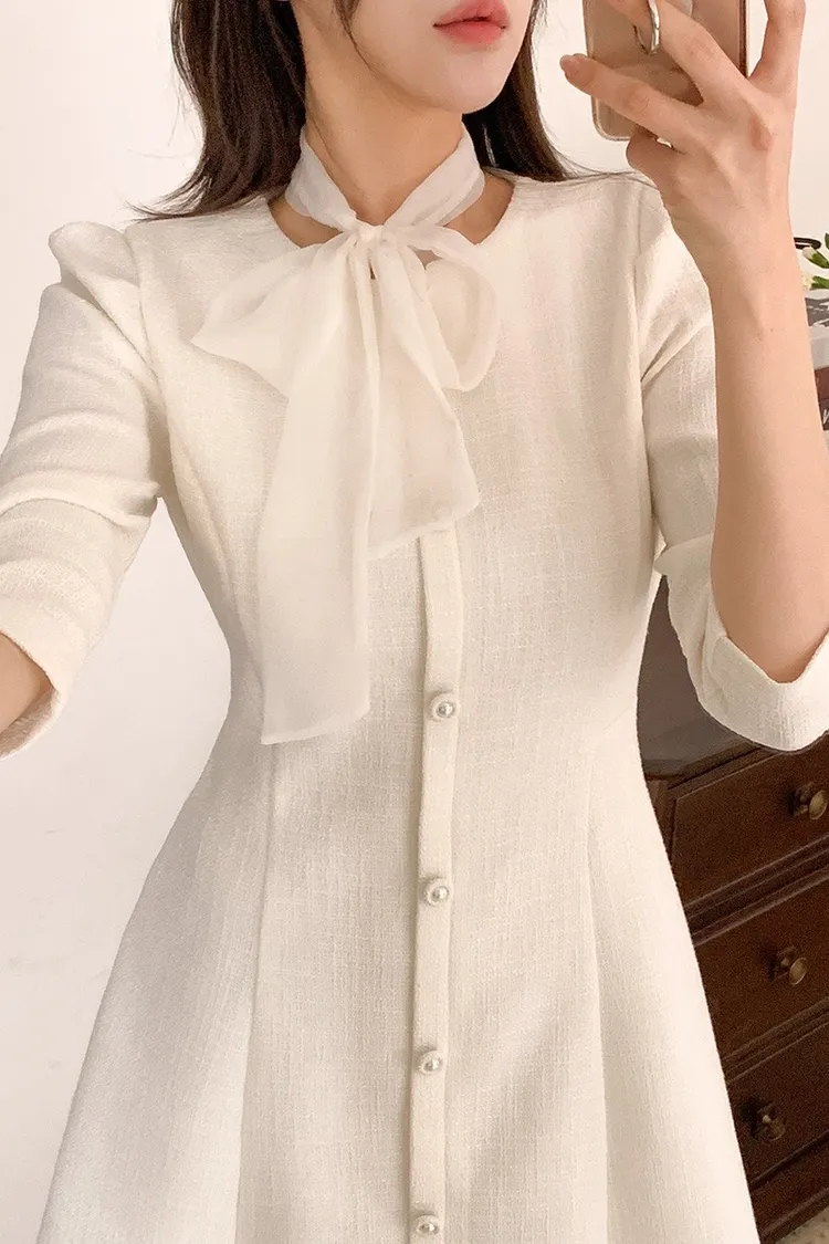 韓國代購 粗毛呢收腰珍珠扣洋裝
