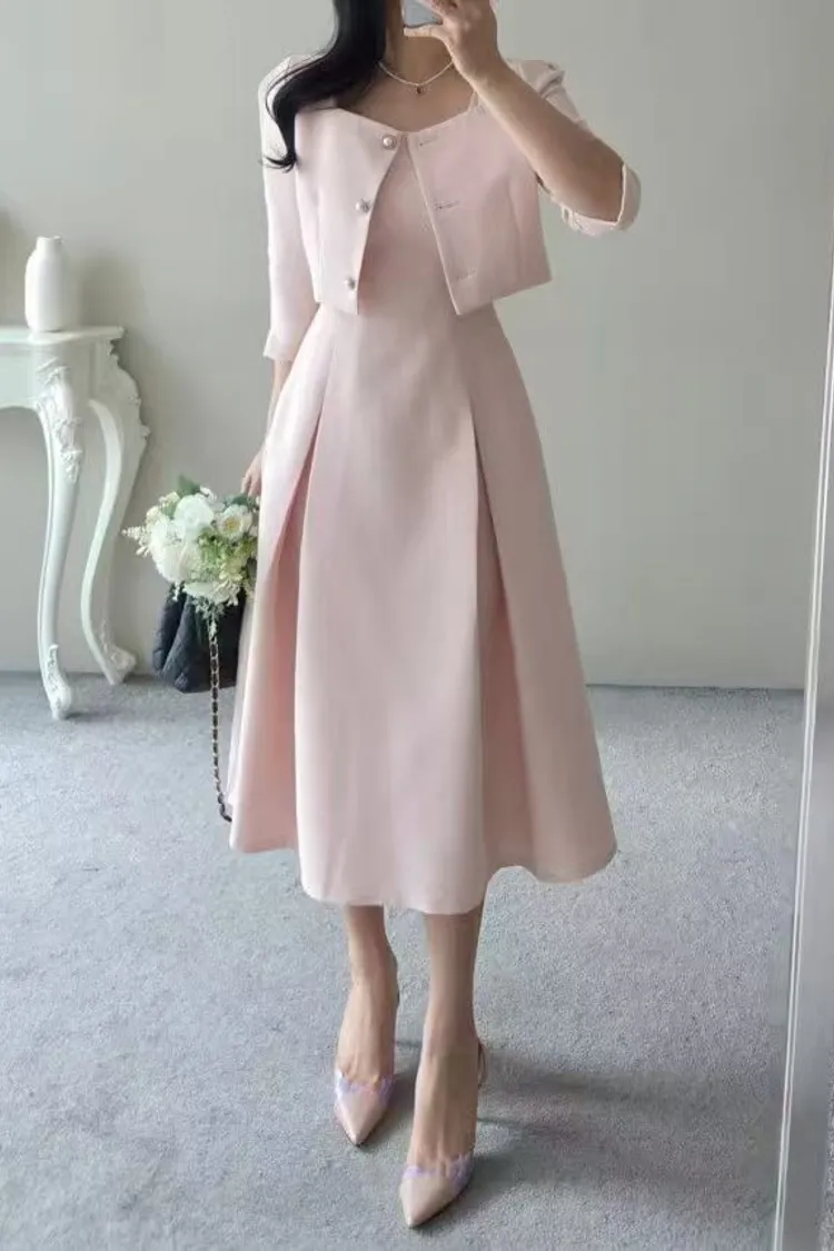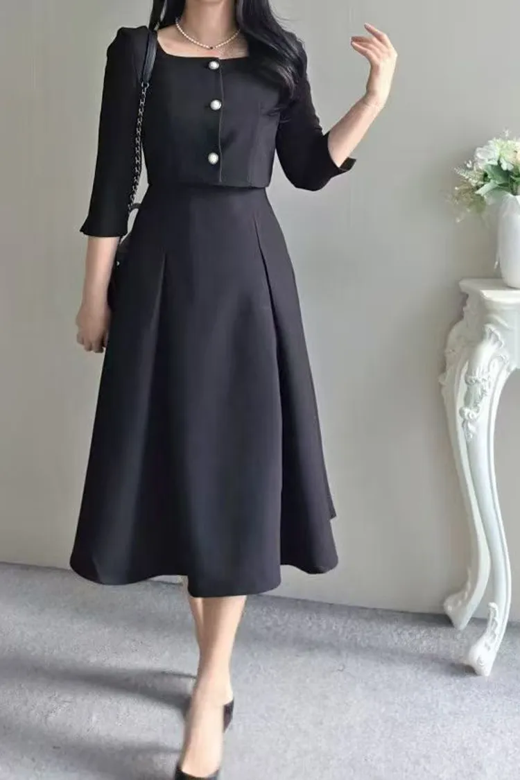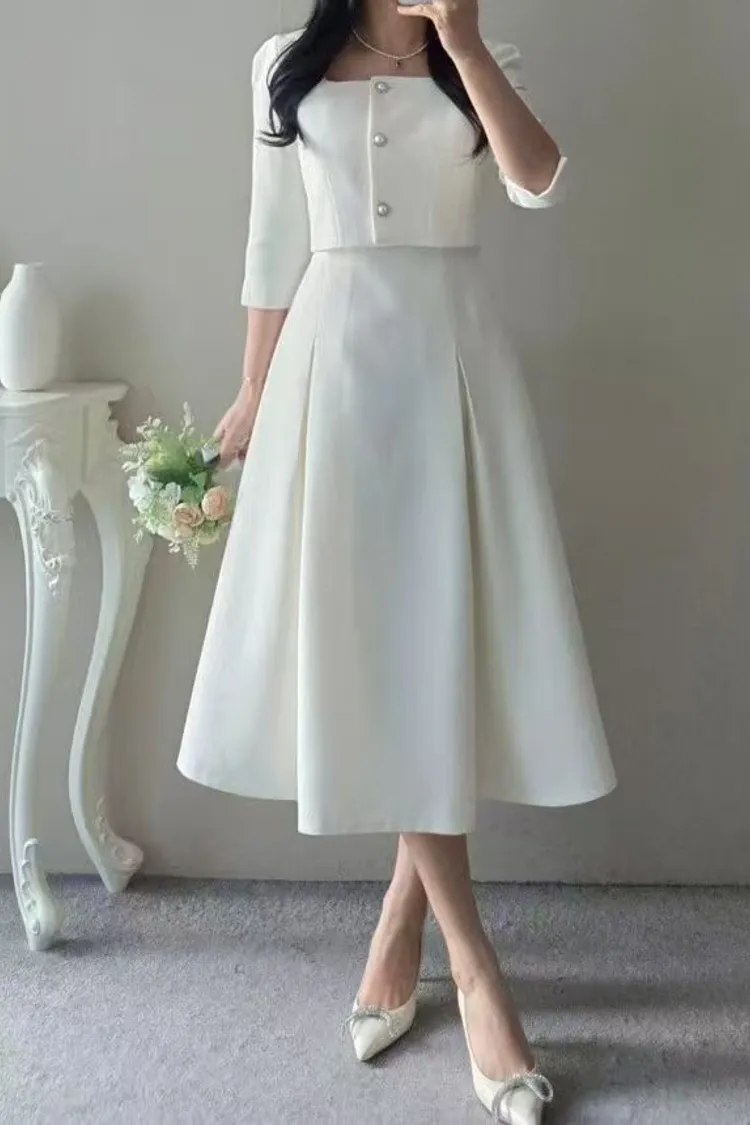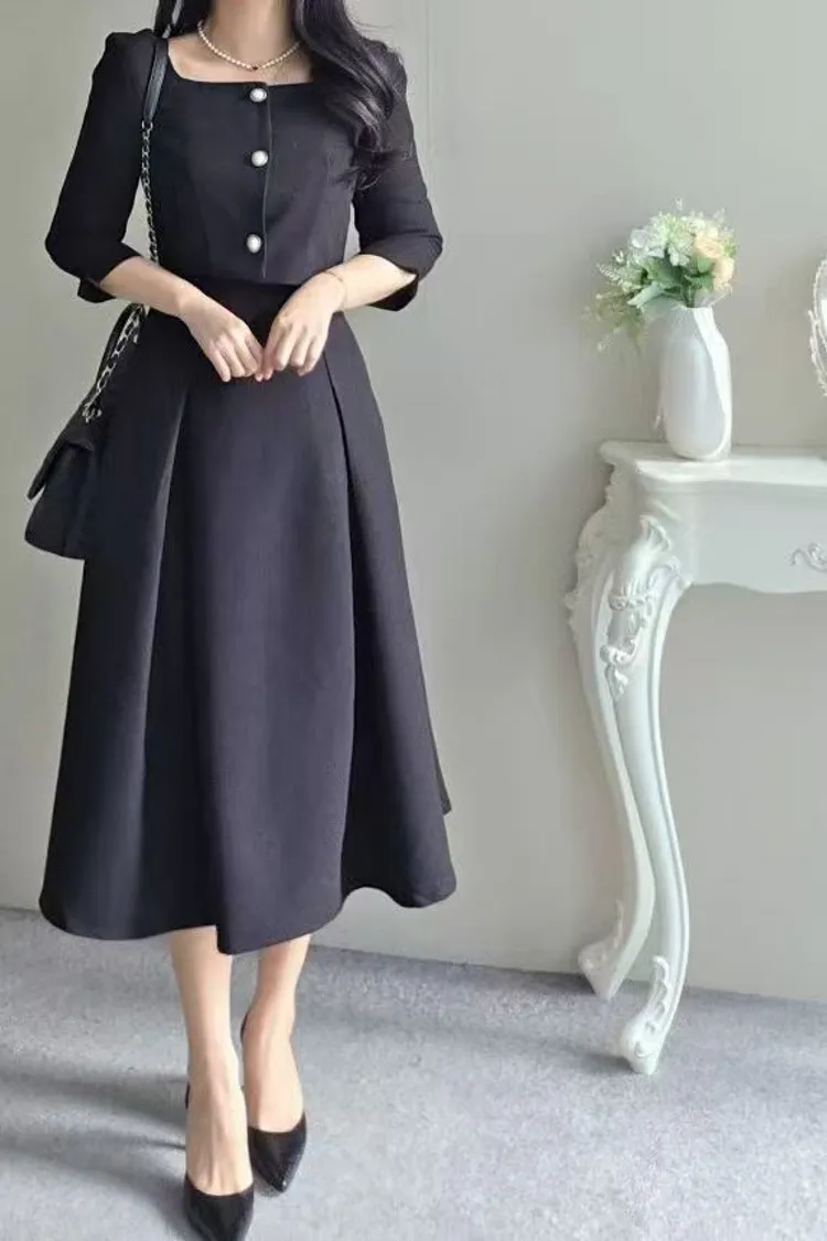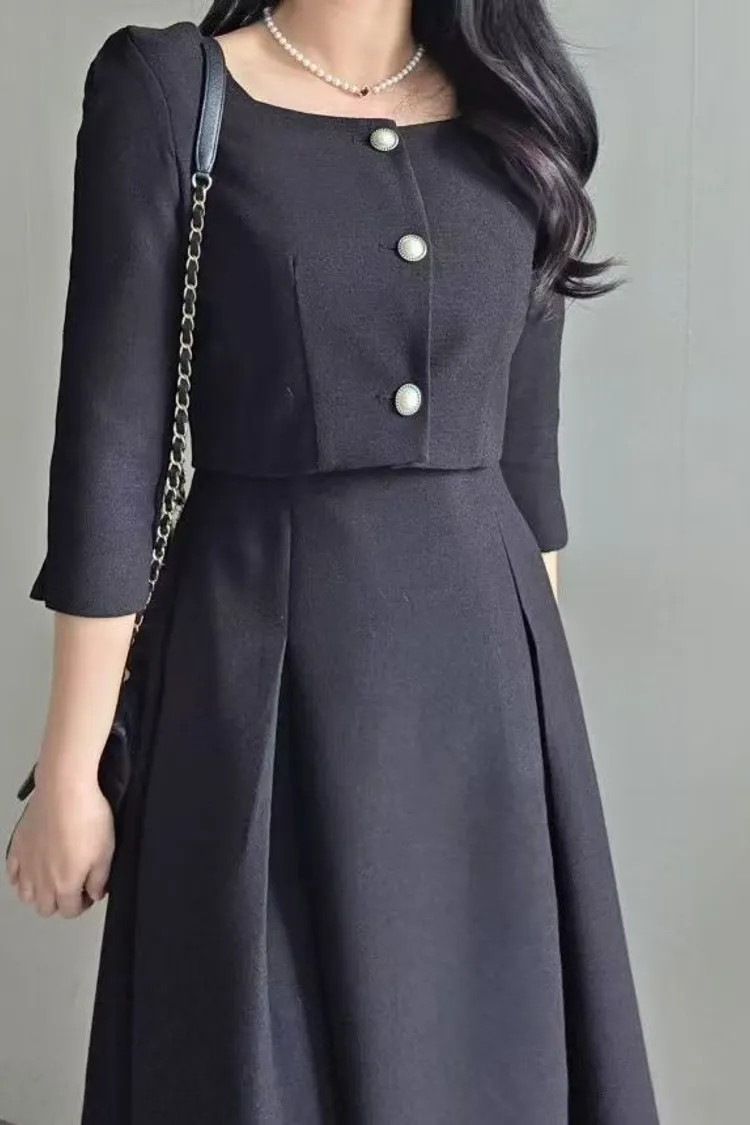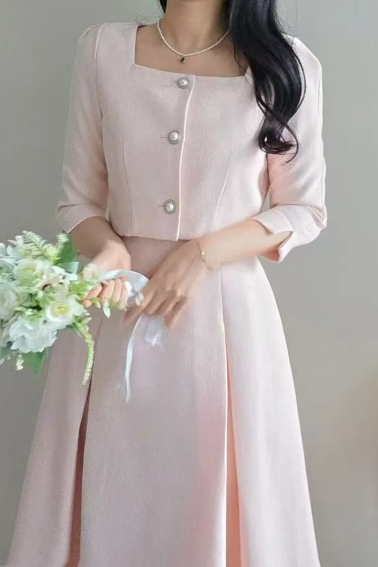 韓國代購 名媛微光感珍珠飾釦優雅洋裝